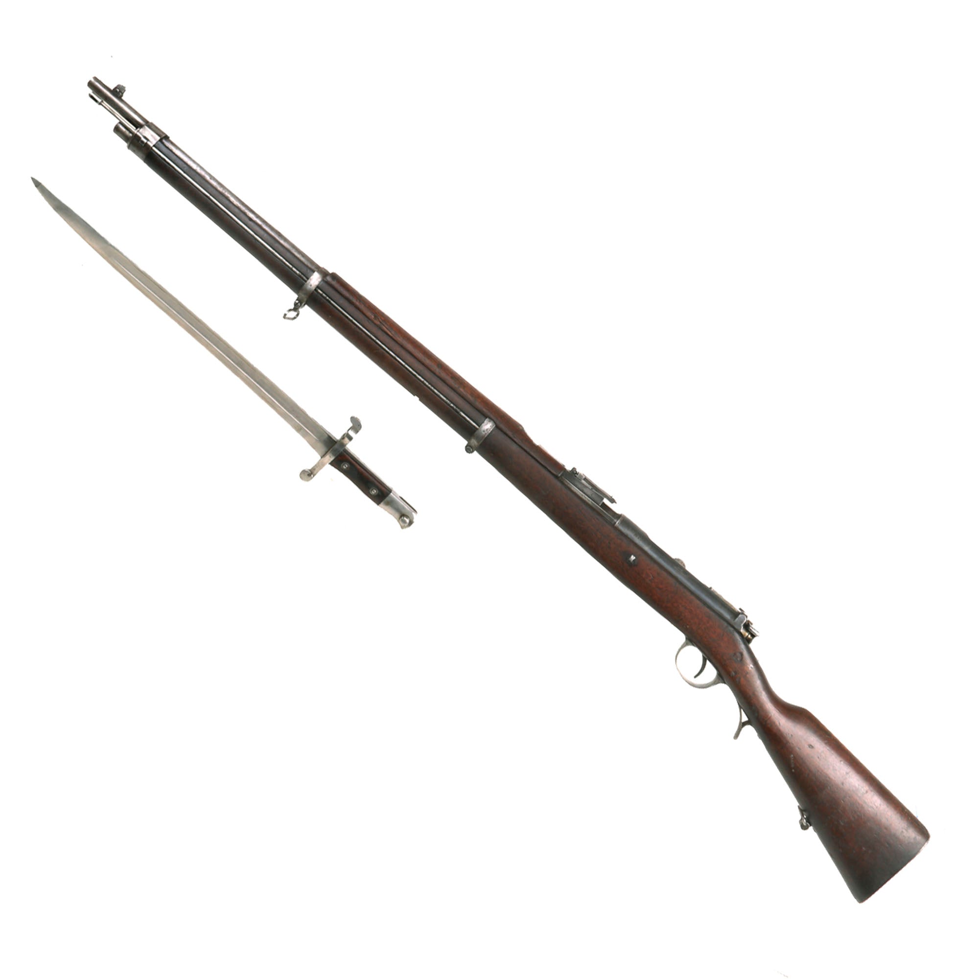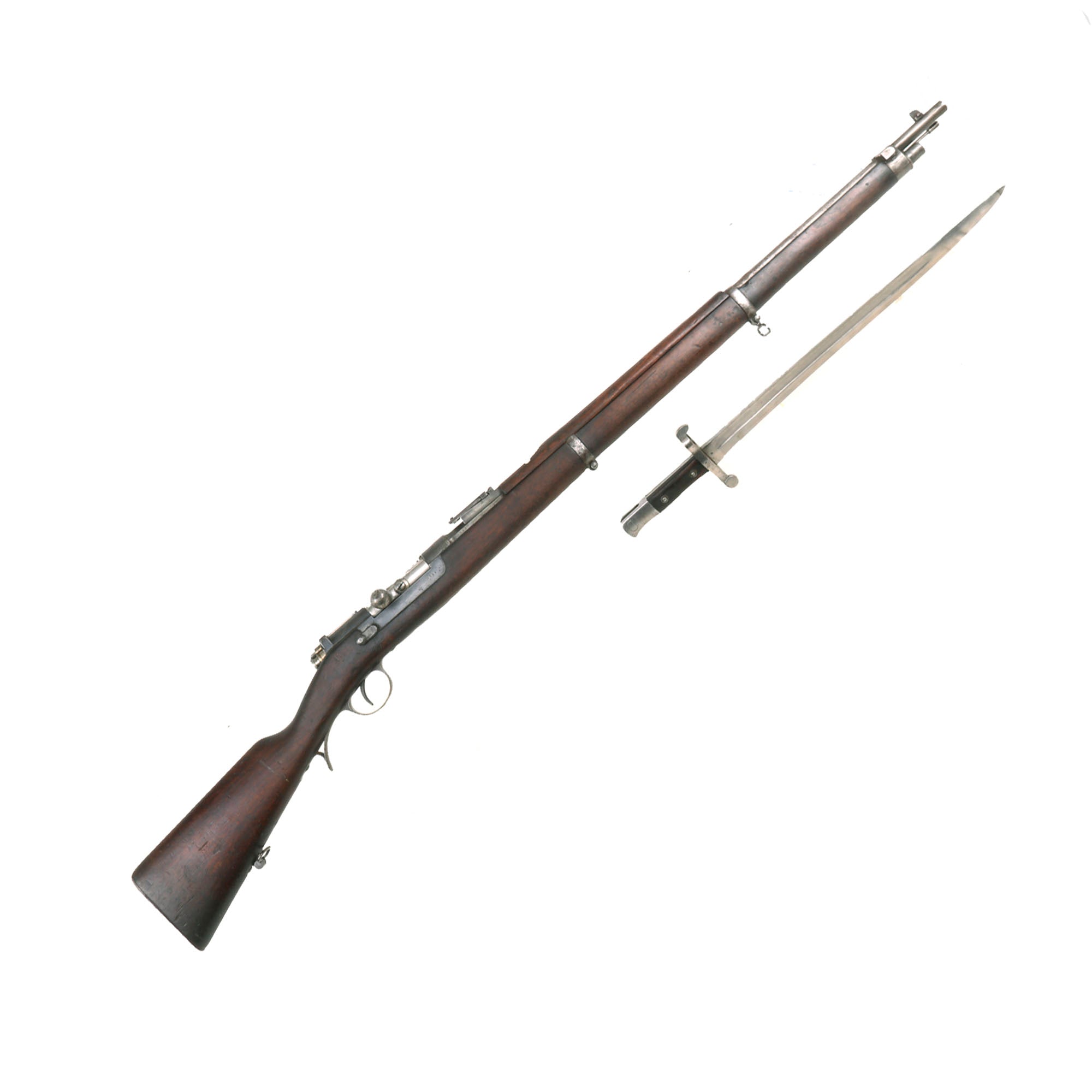 Our example is a very good condition long rifle version, officially designated the Espingarda de Infantaria 8 mm m/1886: 8 mm Infantry Rifle, and unlike most rifles we have had, still retains the original rare bayonet, but it is missing the scabbard. It is fitted with a 32.3" barrel and a full length 8 round tube magazine under the barrel. Ours is marked on the receiver with M.1886 and :- Œ.W.F.G. STEYR / 1886 for Österreichische Waffenfabriksgesellschaft, (ŒWG, Austrian Arms-Manufacturing Company), also commonly referred to as Steyr Werke. Steyr is an Austrian City just outside Vienna and at the time was the home of the entire Austrian arms production. They made Kropatschek rifles under contract for shipment to Portugal.