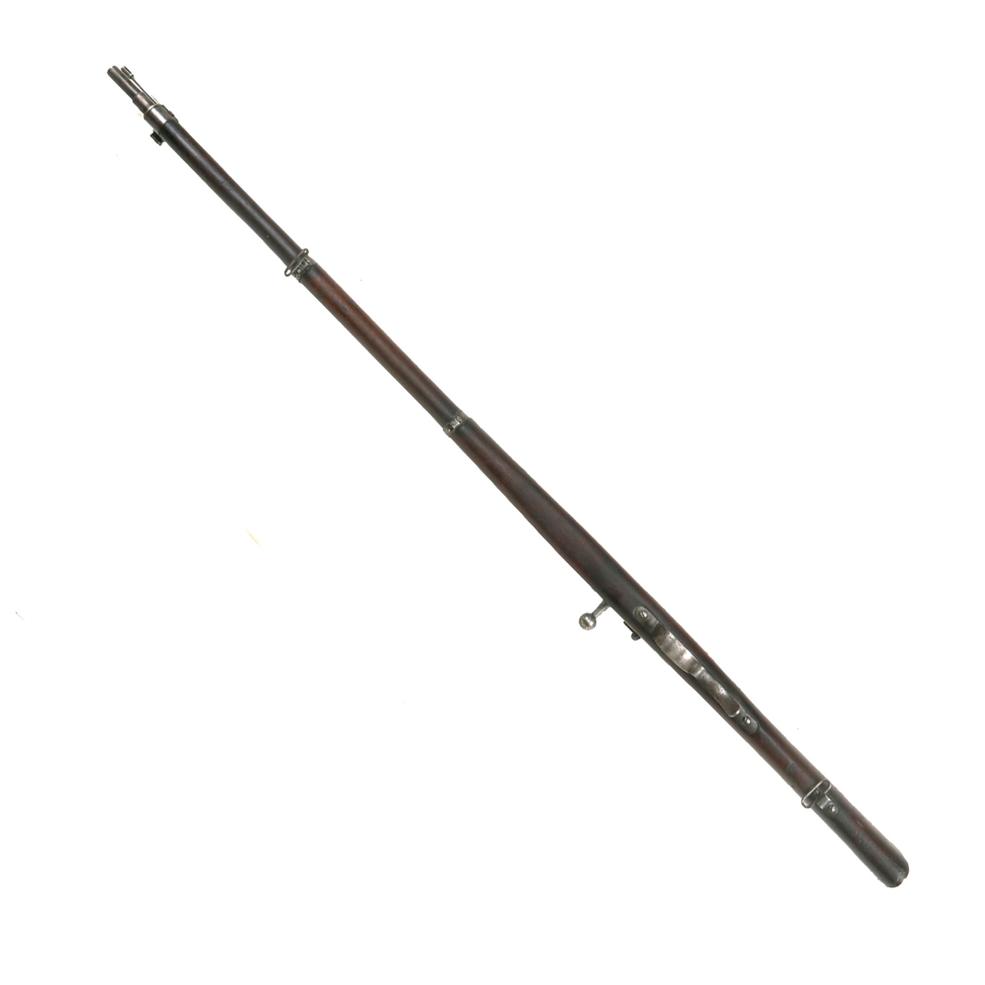 The exterior condition is consistent with long service, without any major arsenal reconditioning evidence, just a great deal of nicks and scuffs to the wood as is expected. It has a lovely chestnut brown color, showing darkening near the metal fittings. The metalwork still retains the blued finish quite well on the receiver, with other components faded a bit. As previously mentioned, this example retains its rare colonial top handguard, which is extremely scarce to find.