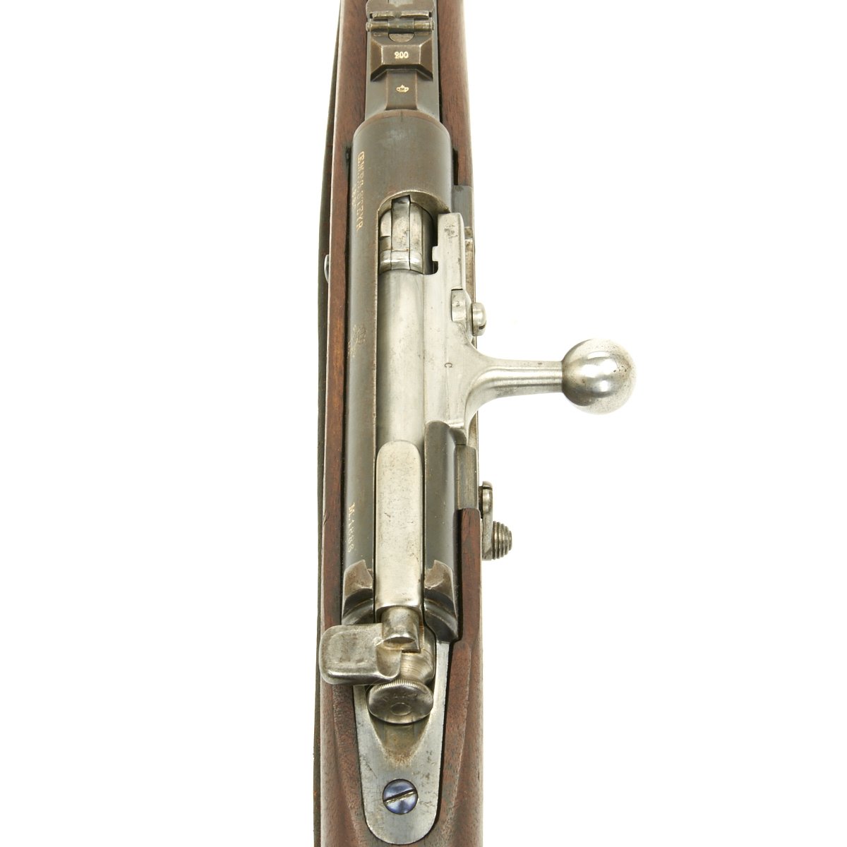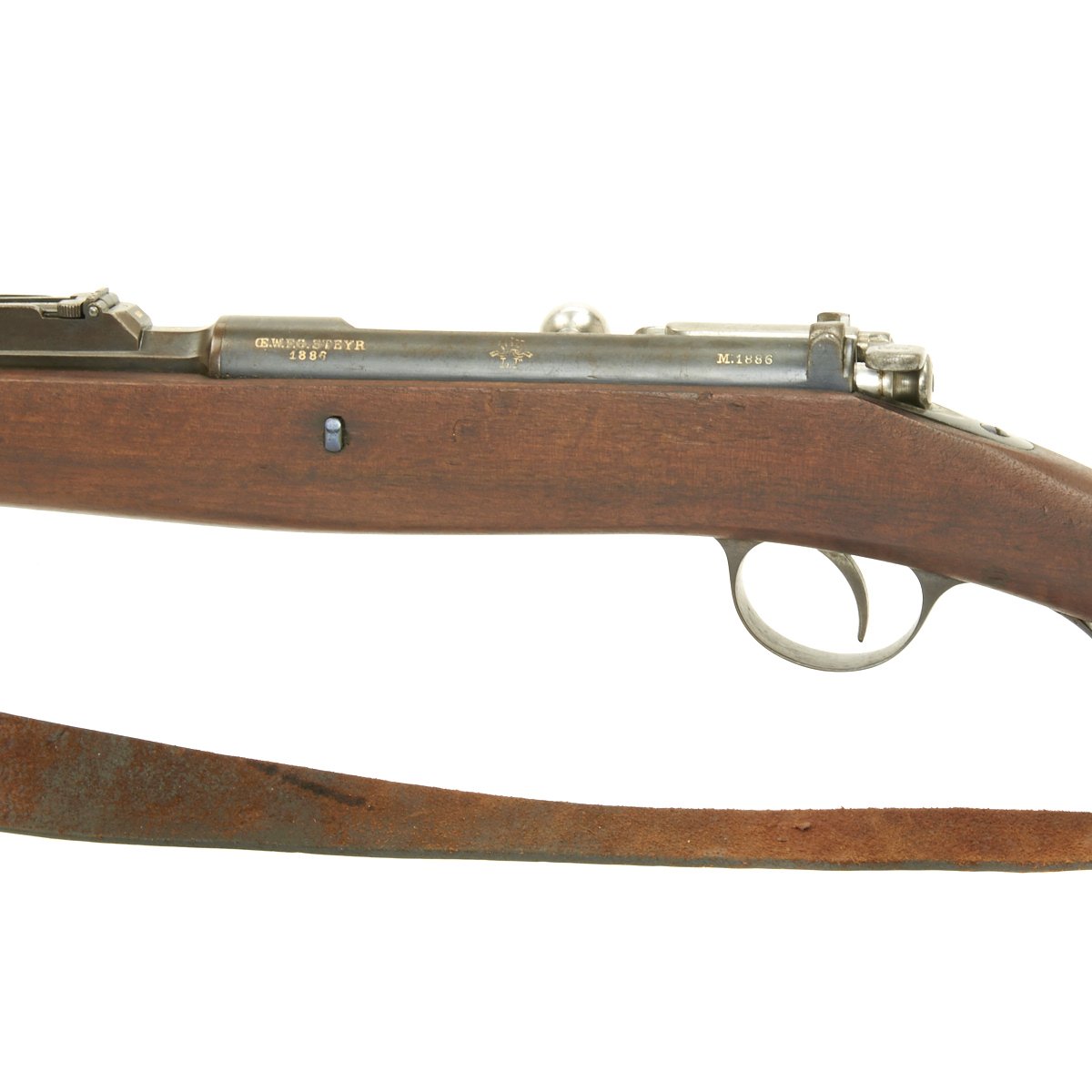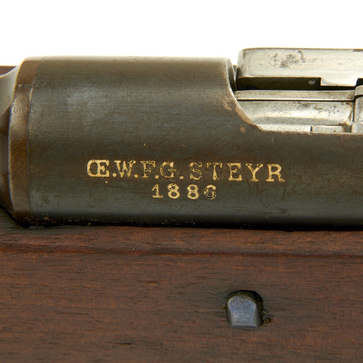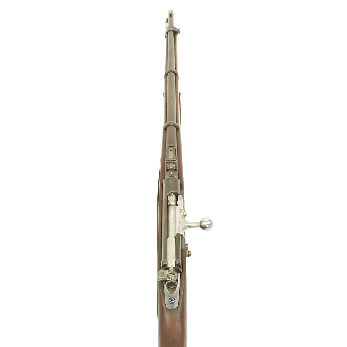 Our example is an excellent condition short rifle version also known as a ligth carbine called the Carabina de Caçadores 8 mm m/1886: 8 mm Light Infantry Carbine. It is fitted with a 25" barrel and a full tube magazine under the barrel. Ours is marked M.1886 and :- Œ.W.F.G. STEYR 1886 for Österreichische Waffenfabriksgesellschaft, (ŒWG, Austrian Arms-Manufacturing Company), also commonly referred to as Steyr Werke. Steyr is an Austrian City just outside Vienna and at the time was the home of the entire Austrian arms production. They made Kropatschek rifles under contract for shipment to Portugal.