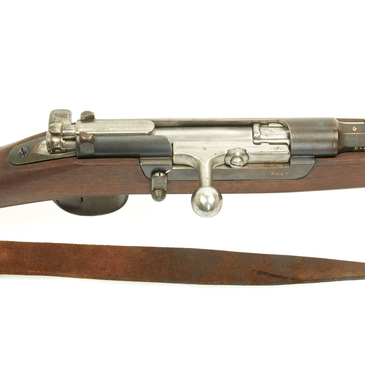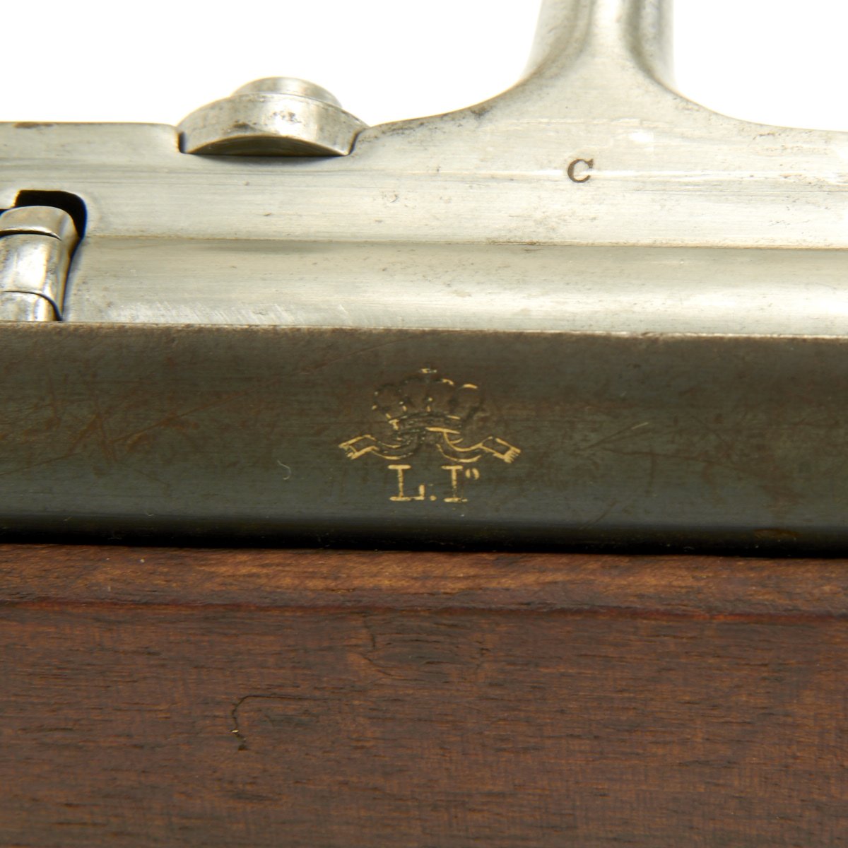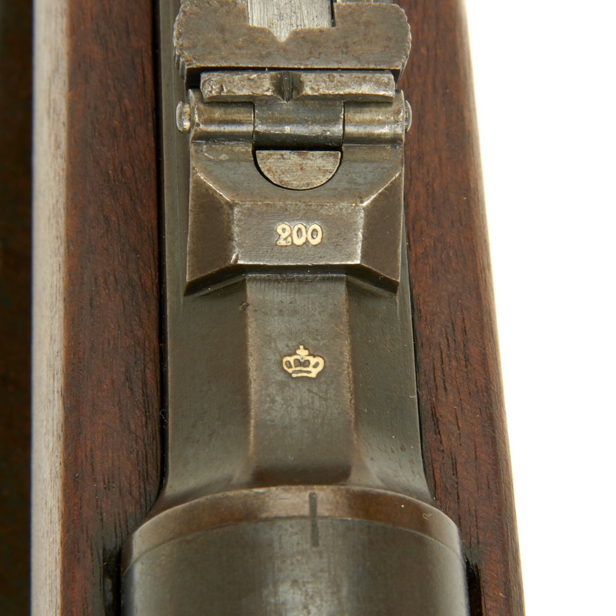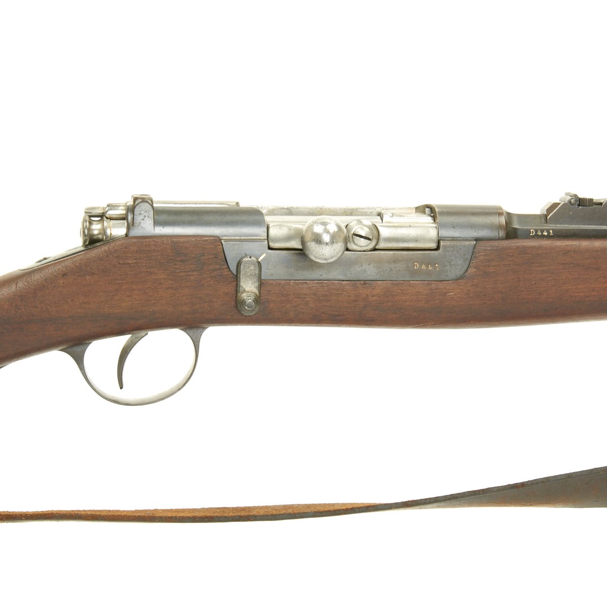Our example is an excellent condition short rifle version also known as a ligth carbine called the Carabina de Caçadores 8 mm m/1886: 8 mm Light Infantry Carbine. It is fitted with a 25" barrel and a full tube magazine under the barrel. Ours is marked M.1886 and :- Œ.W.F.G. STEYR 1886 for Österreichische Waffenfabriksgesellschaft, (ŒWG, Austrian Arms-Manufacturing Company), also commonly referred to as Steyr Werke. Steyr is an Austrian City just outside Vienna and at the time was the home of the entire Austrian arms production. They made Kropatschek rifles under contract for shipment to Portugal.
