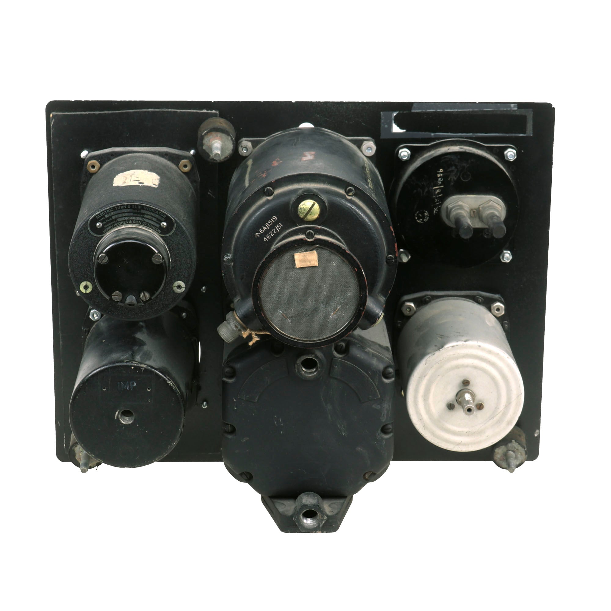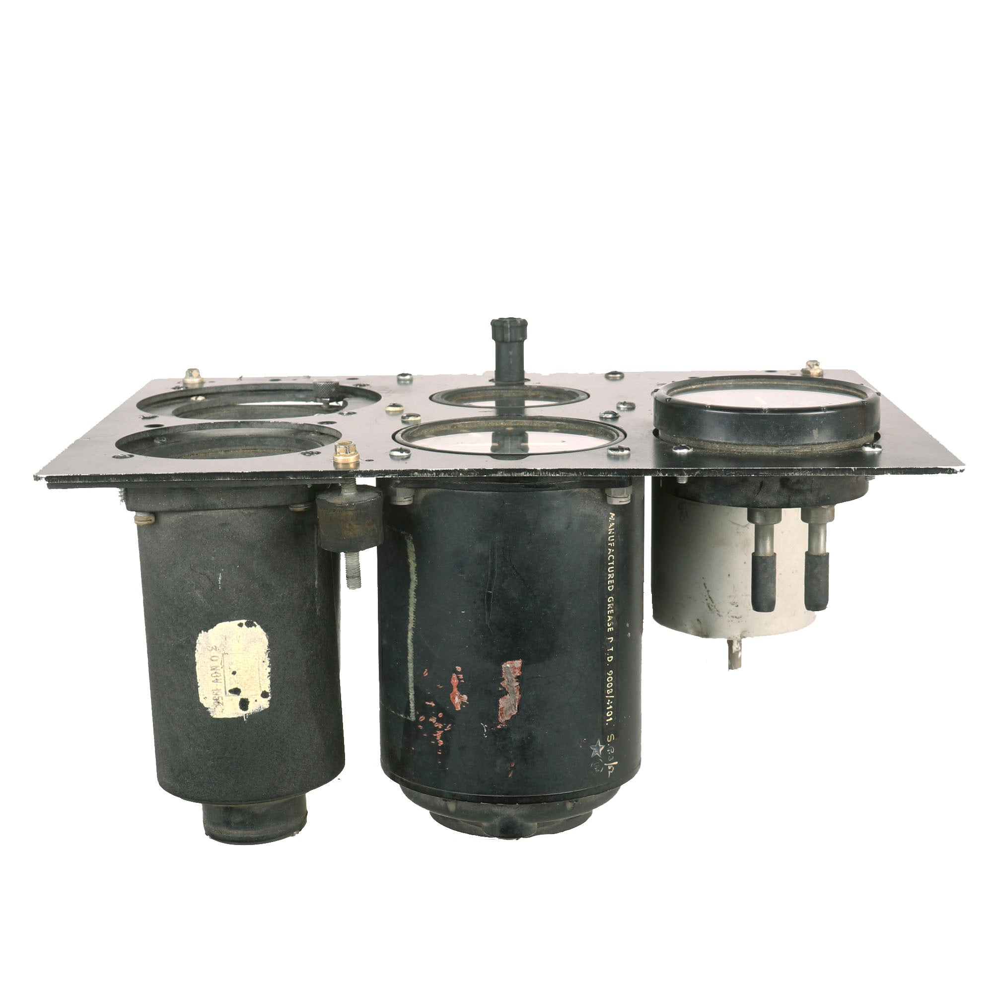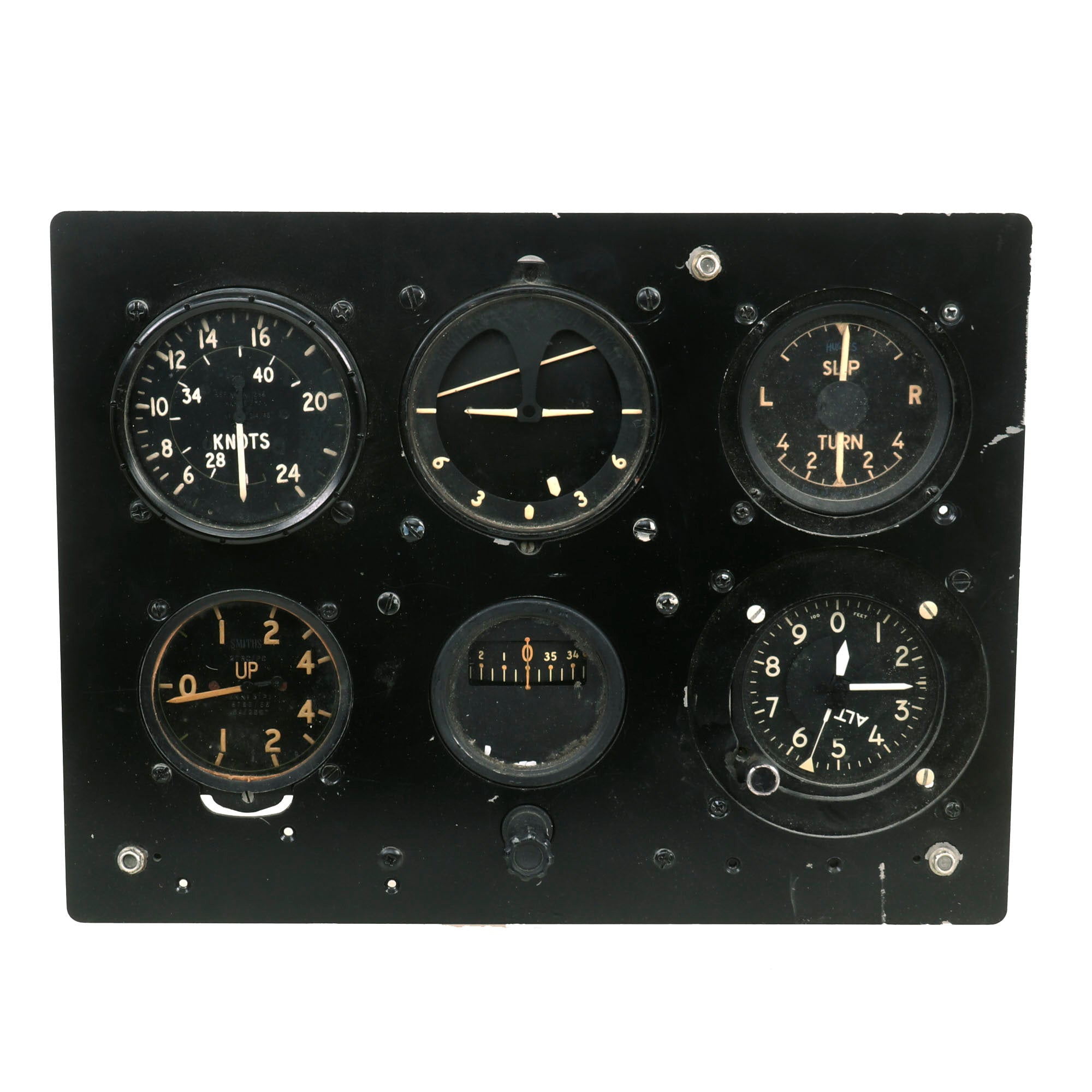 Original Item. Only One Available. This is a great panel mounted with six aircraft gauges, likely used during the Post-WWII era as a training aid. Each gauge has markings on the back with dates ranging from 1951-1953. Many of the gauges are British-made. The board measures 10¾ x 14”.