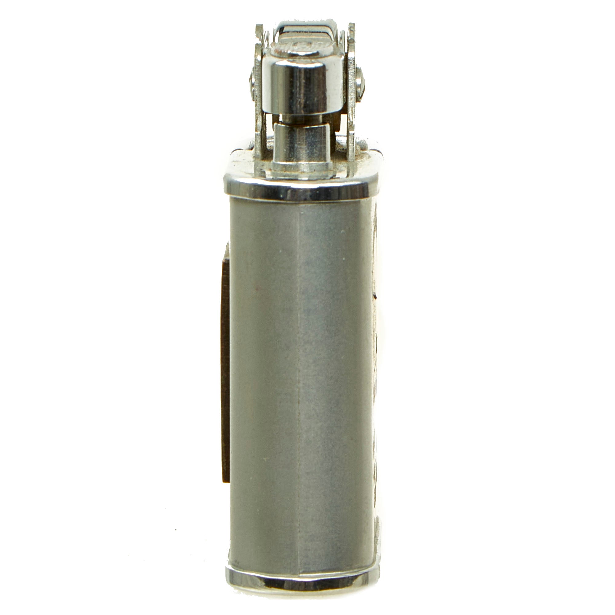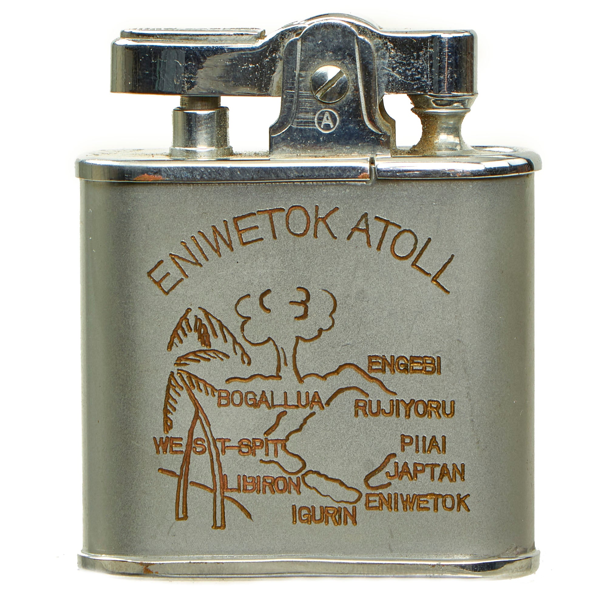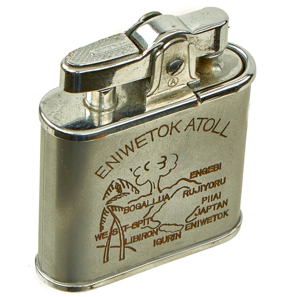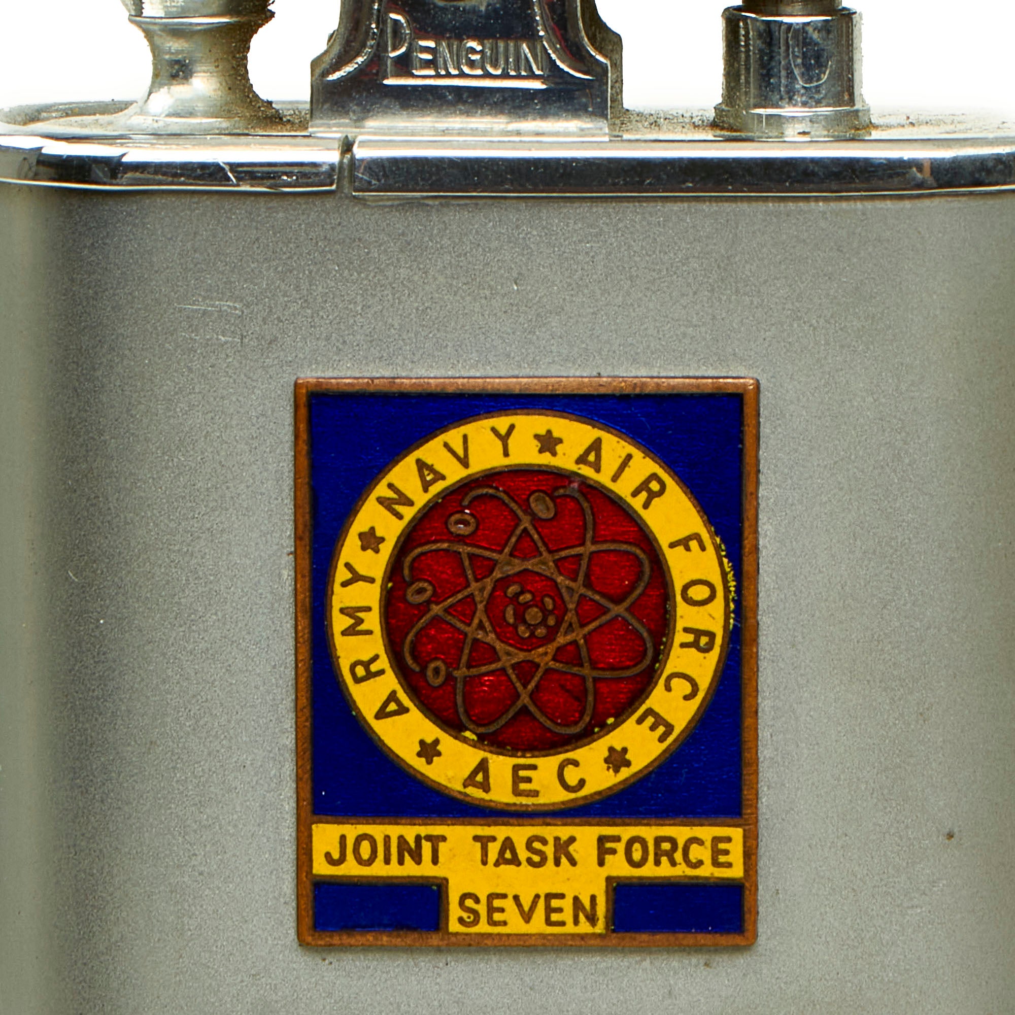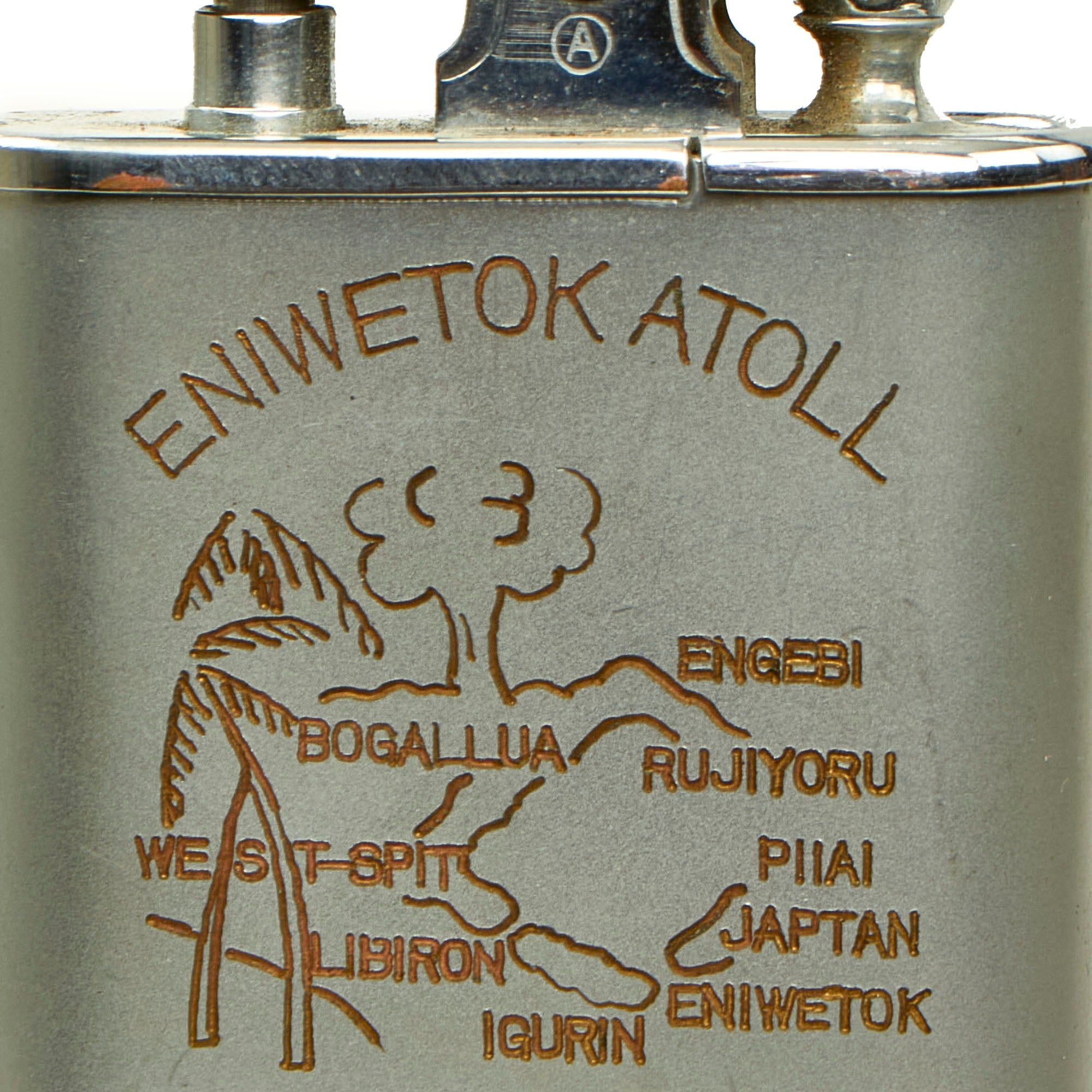 Original Item: Only One Available. Now this is a rather dark and morbid commemorative lighter from American history. The lighter itself appears to be an early 1950s model and enameled insignia and engraving on the reverse. The was more than likely made for a key leader or Officer within Task Force 7 who was there when the 3 Atomic Bomb tests were carried out in 1948 in the Enewetak Atoll. The front of the lighter retains a lovely enameled insignia for the JTF7 which features an atom with ARMY NAVY AIR FORCE AEC around it and JOINT TASK FORCE SEVEN at the bottom. The reverse has a crude map of the region marked with Japanese islands with the header ENIWETOK ATOLL. This appears to be a fully functional lighter, though it does not appear to have ever been used as there is no soot buildup and the wick looks untouched. The slide up windscreen is still present and fully functional.
