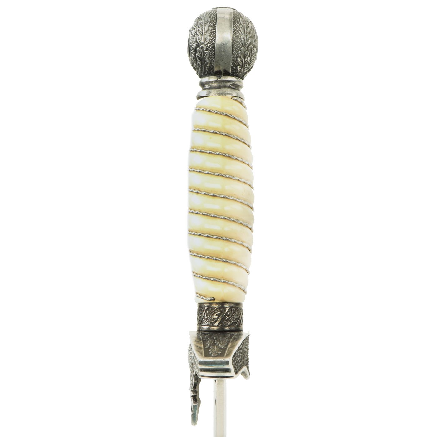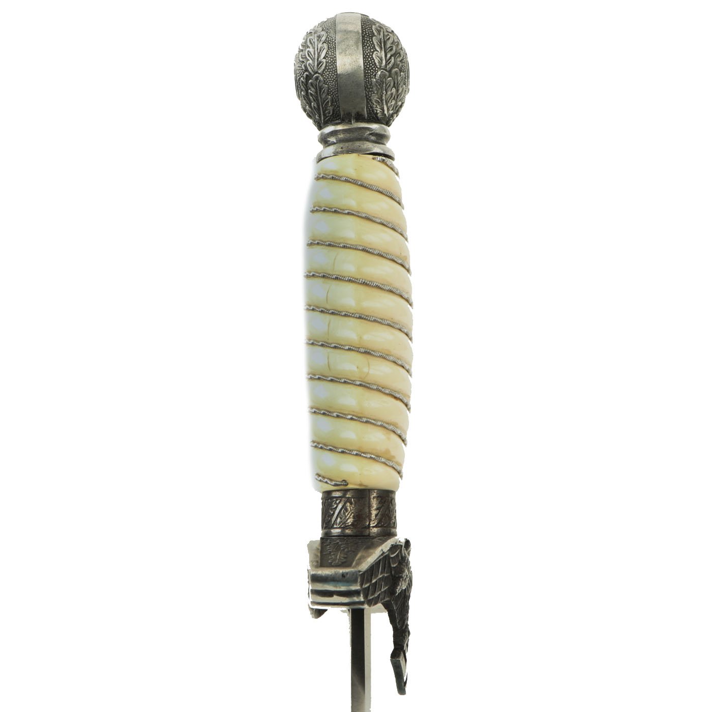 The grip of this dagger is a nice ivory color, which has not faded to orange or brown like so many do. It has a nice slightly tapered shape, and is tightly wrapped with twisted wire. There is no cracking we can see, just some scuffs and stains. The hilt mounts are the usual late war aluminum, though the fit and finish is not quite as nice as it would have been during the WWII period. An "Air Age" material, it was considered fitting and desirable for the eagle-shaped guard to be made of this material. The ferrule looks to be plated steel, which we have tested with a magnet.