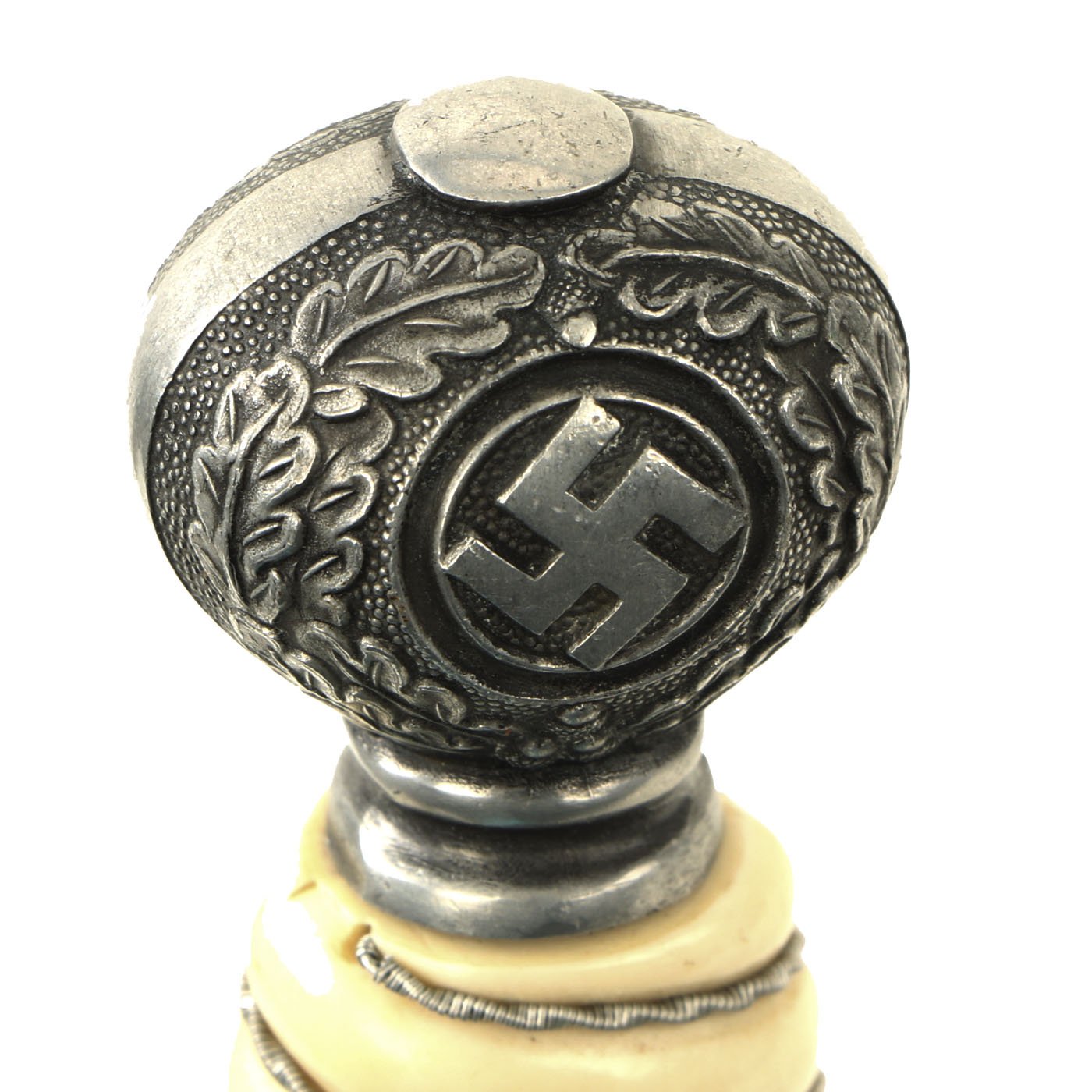 Seeing an opportunity, the B&A name was brought back, and they began contacting the makers of the very popular German daggers, and bought up remaining parts that they had on hand. This included blades, handles, crossguards, etc. About the only parts they could not get were scabbards, which also had been scarce towards the end of the war. B&A then began to finish, assemble, and sell these daggers, usually in leather scabbards, to USGIs and other people working in post War Germany. However, production then ceased in 1946, as the NSDAP party and all of its symbols were banned in Germany.