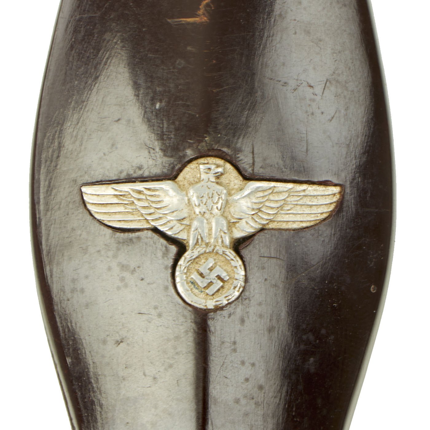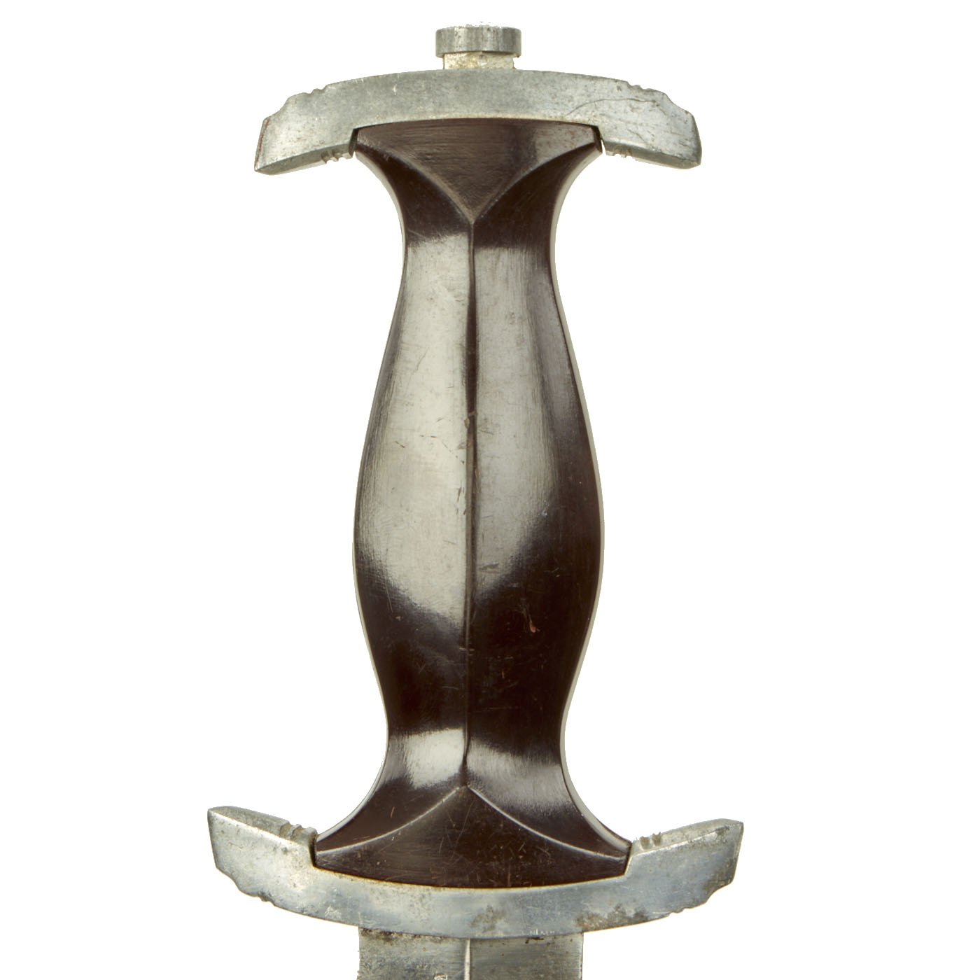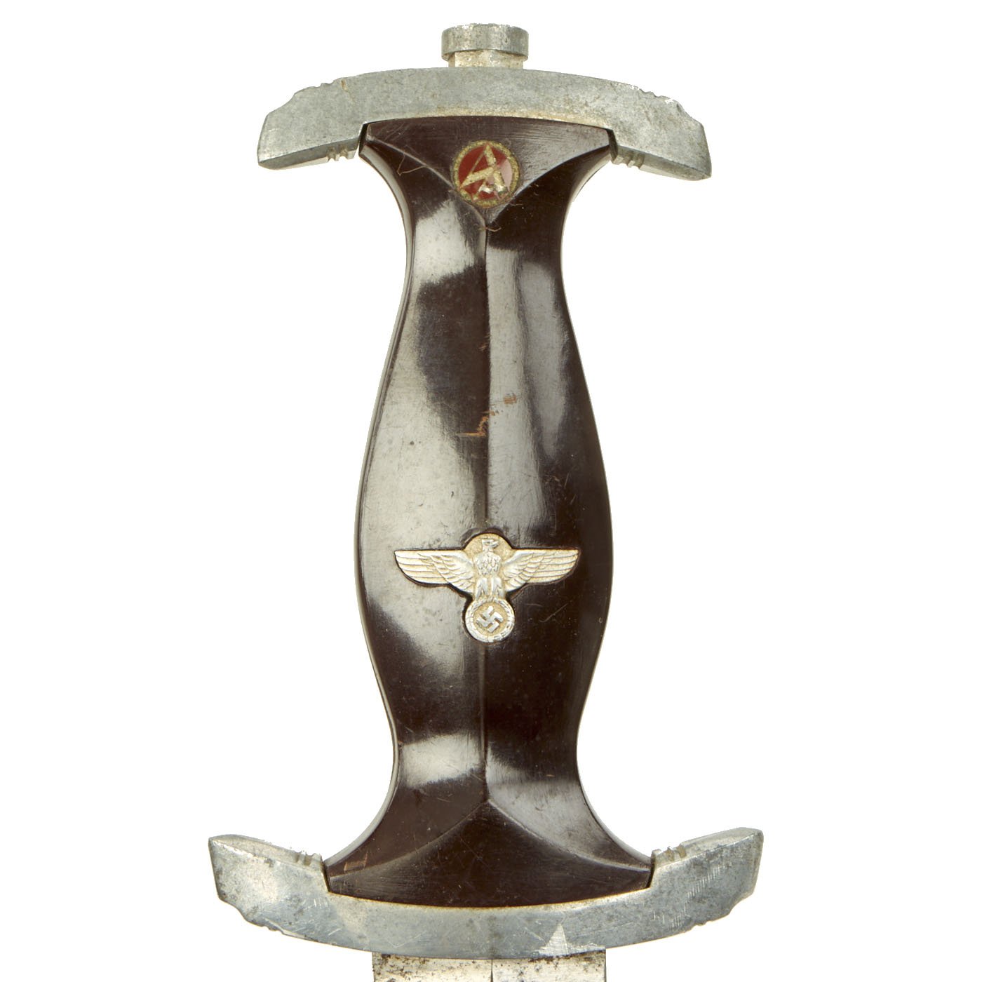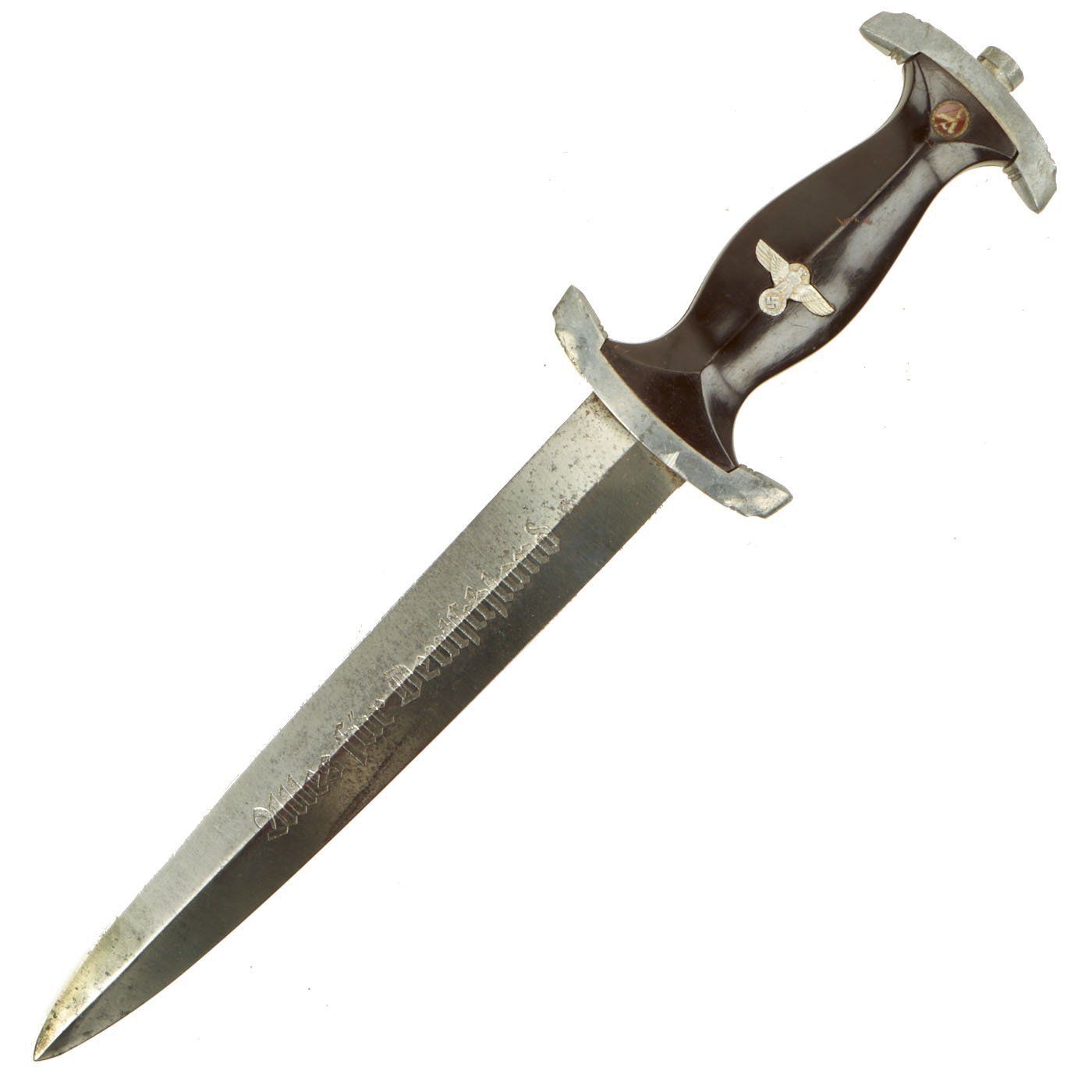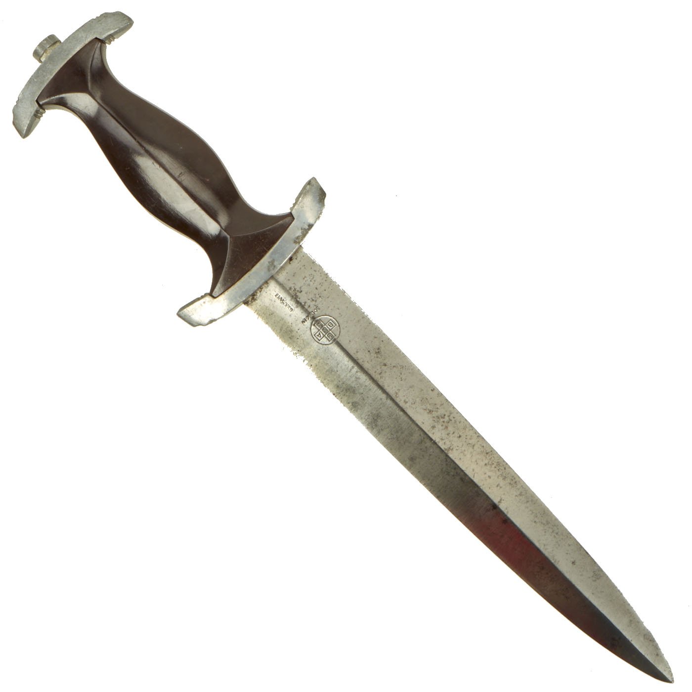 The blade was etched with the SA motto, Alles für Deutschland. Examples produced prior to 1935 were stamped with the German sector of the SA group on reverse lower crossguard. Later examples underwent standardization through the RZM ministry. These pieces were produced of cheaper plated zinc-base fittings and scabbards were simply painted brown.