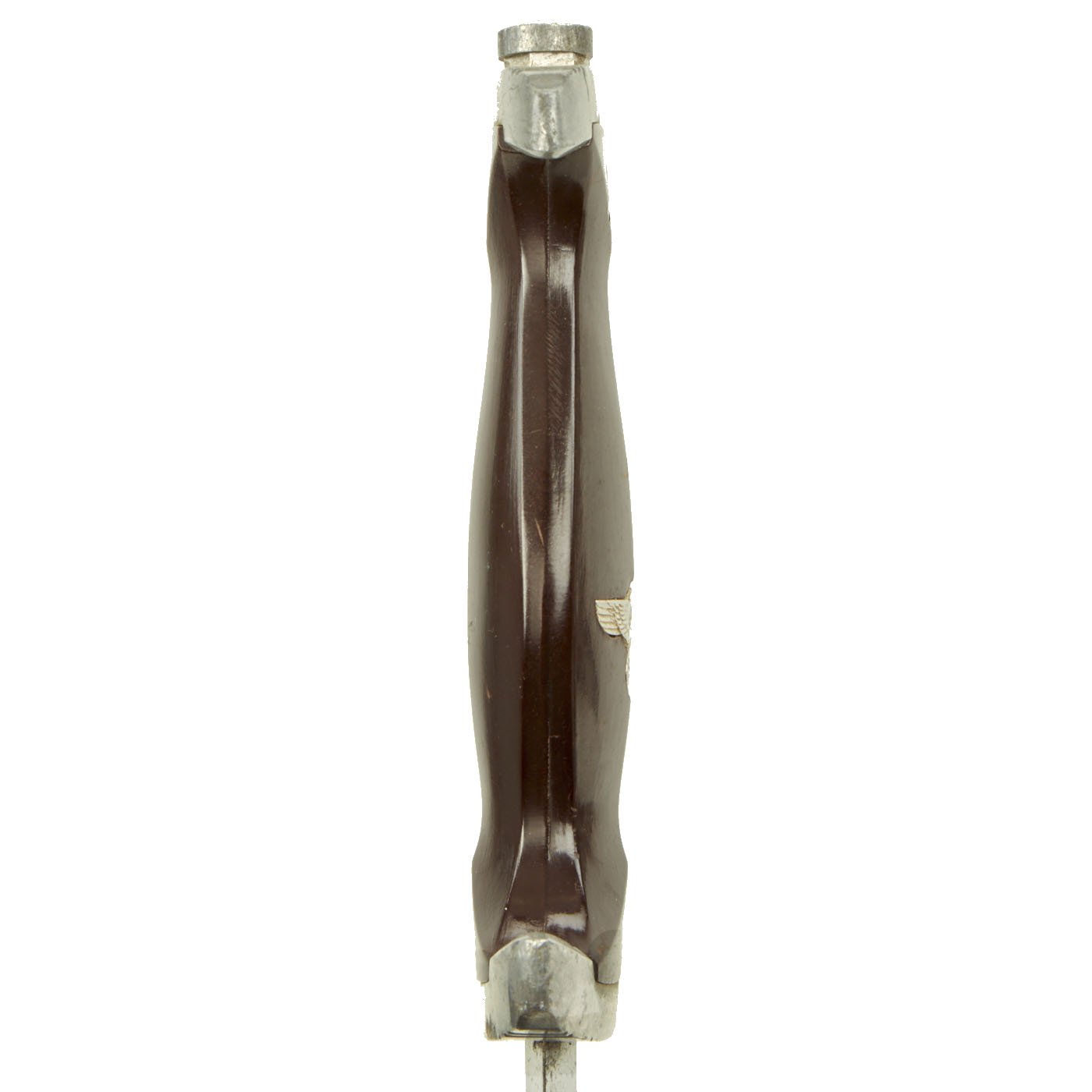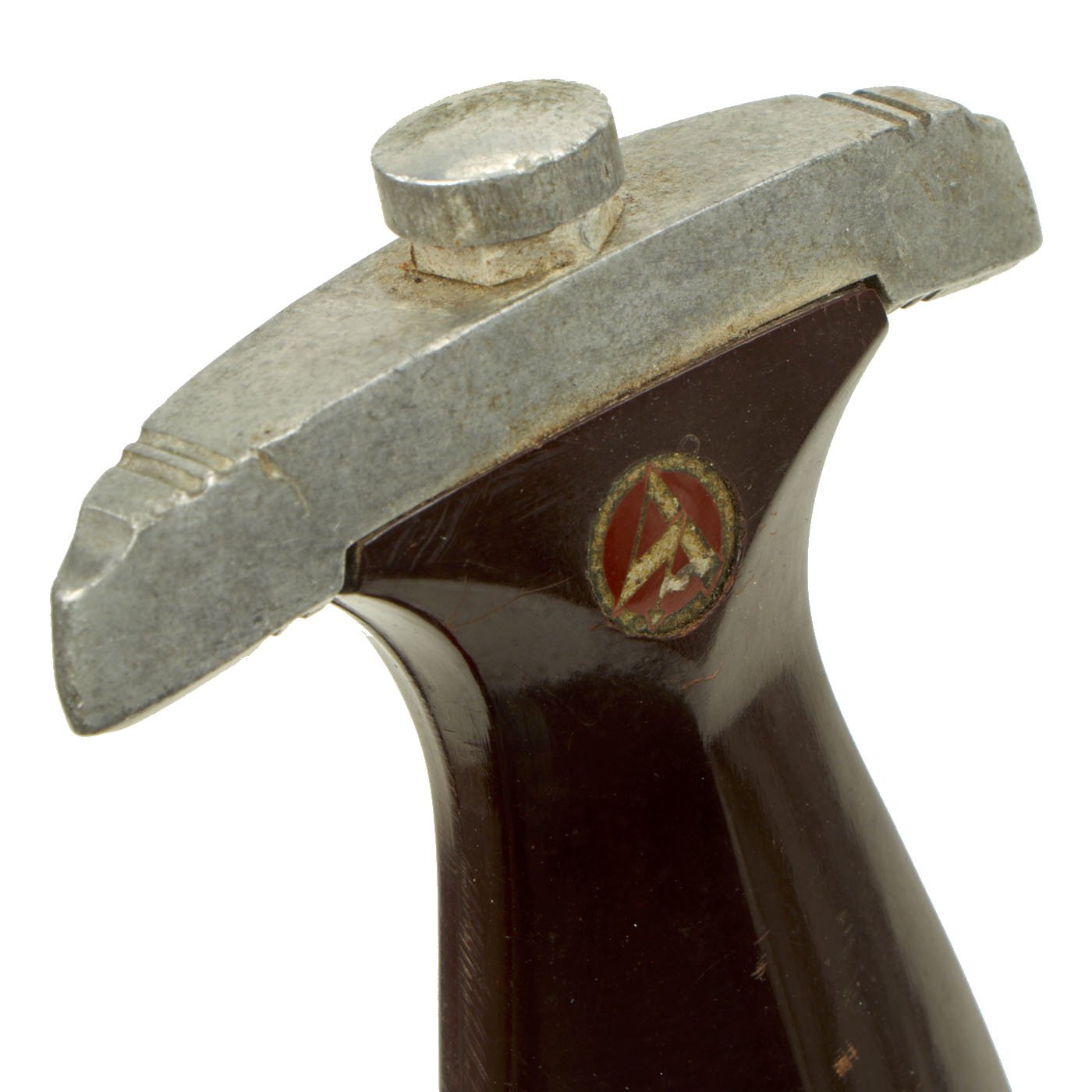 The dagger is in good condition, but does show wear. It has the standard late war style aluminum fittings, which have had all of the plating wear away. The grip actually looks to be brown bakelite, and not wood. It has the correct aluminum grip eagle and enameled SA emblem inset into it. The blade does show wear, and looks to have been re-ground at some point, probably to clean off oxidation. This has removed the original factory grain. The acid-etched Alles für Deutschland (Everything for Germany) SA motto is still present, but worn.