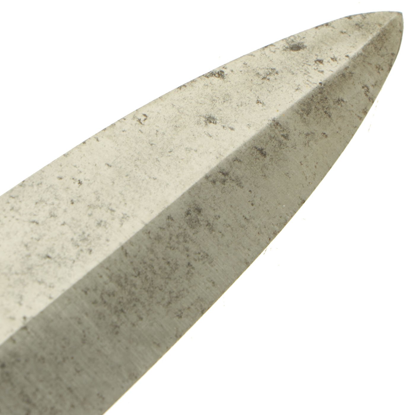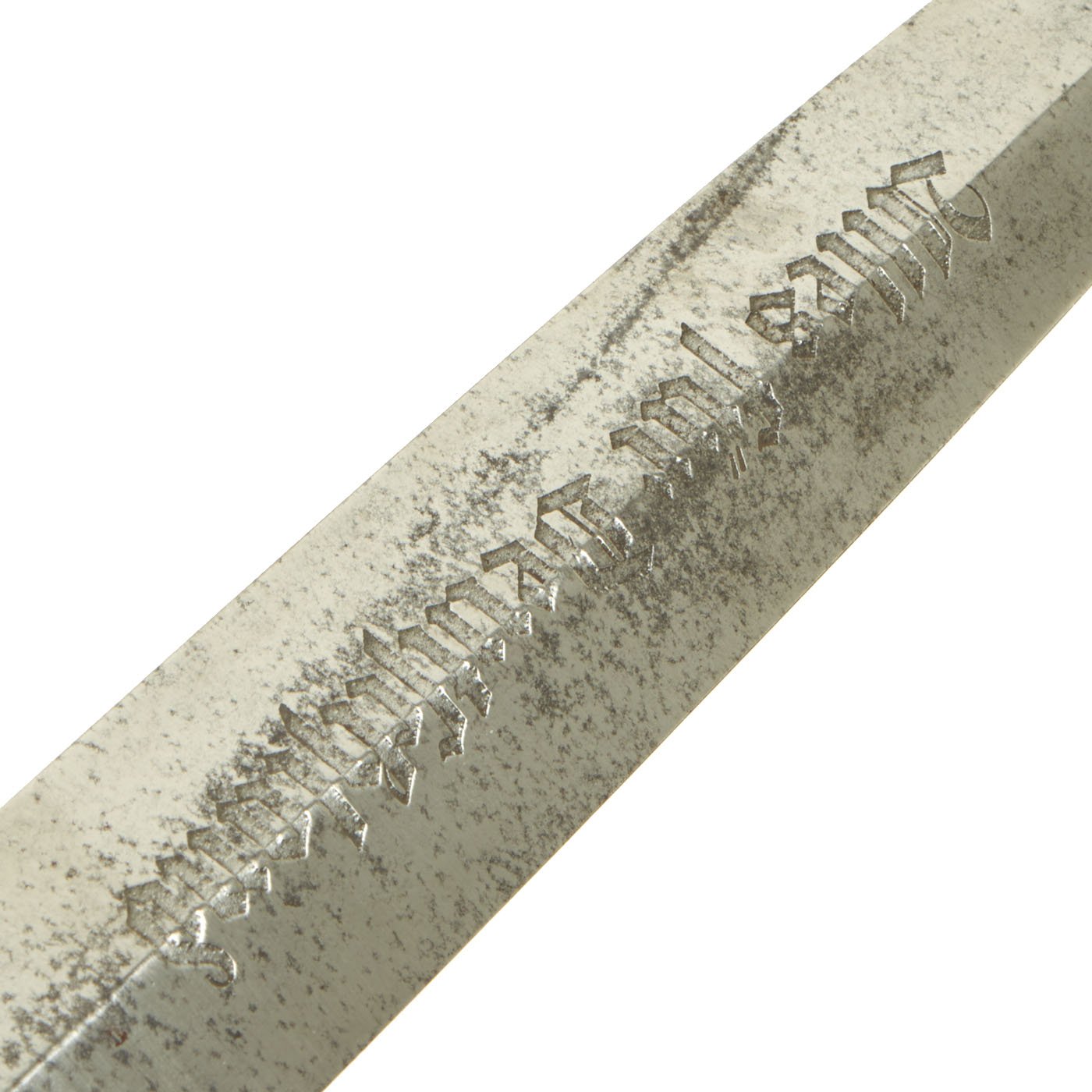 Prior to his "unmasking" as a traitor, Ernst Röhm was the leader of the SA. In 1934, he distributed approximately 100,000 SA daggers with his personal inscription on the reverse blade. These daggers were to honor individuals who had served with the SA prior to December, 1931. Other than the inscription, these pieces were identical to the standard M1933 SA dagger. After the Röhm purge, the inscription was ordered to be removed. Many examples were returned to the factory for grinding. Others were simply ground in the field by whatever means were available. Examples will occasionally be encountered with remnants of the original inscription remaining on the blade, but mostly none will remain. Some blades exist with an intact inscription, reflecting only the removal of the Röhm signature. Very very rarely is an example seen with a full, untouched inscription, as the holder would have surely risked a charge of treason.