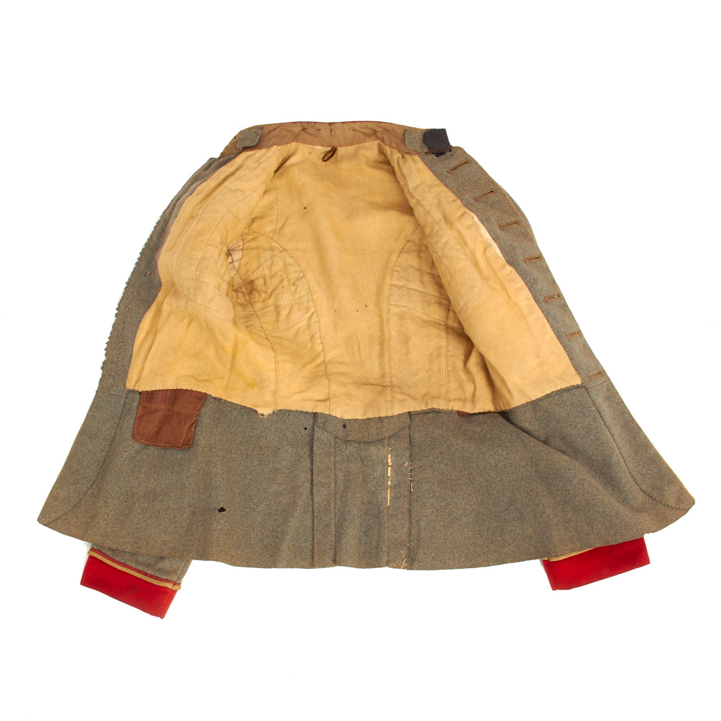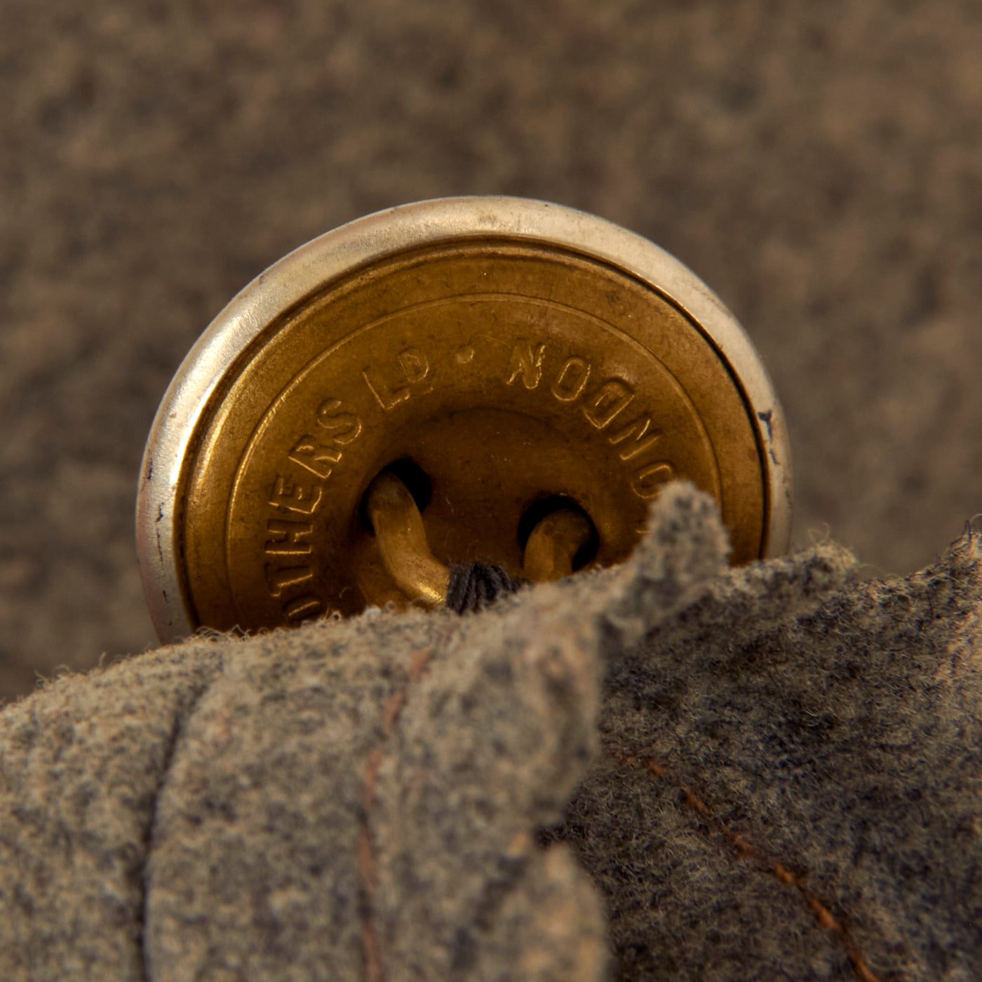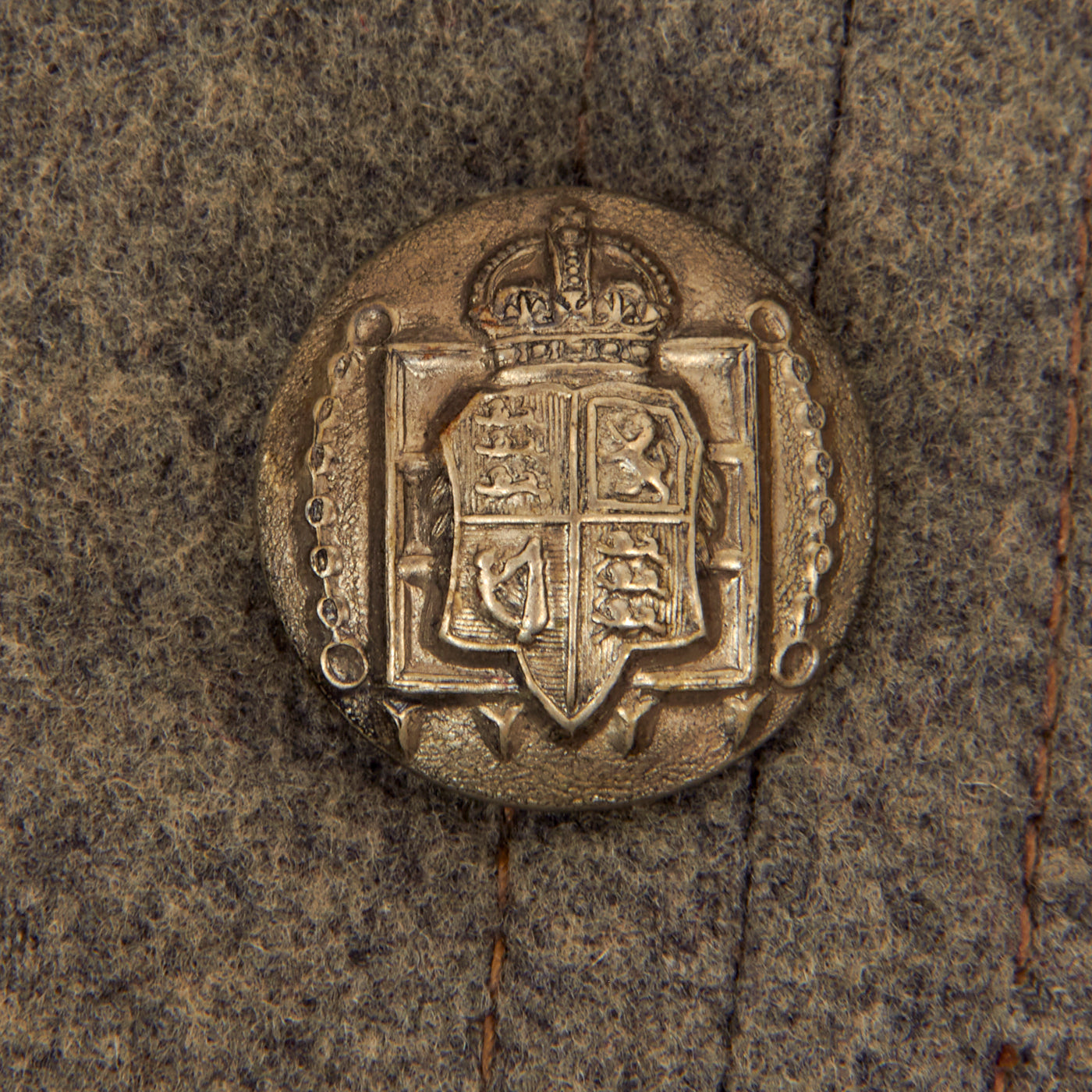 Original Item: Only One Available. Original Pre-WWI British O.R.’s Uniform Coat from The Queen’s Westminster Guards. Constructed of a heavy grey serge wool, with an off white kersey lining, the coat is secured by six Queen’s Westminster Guards Service Buttons.