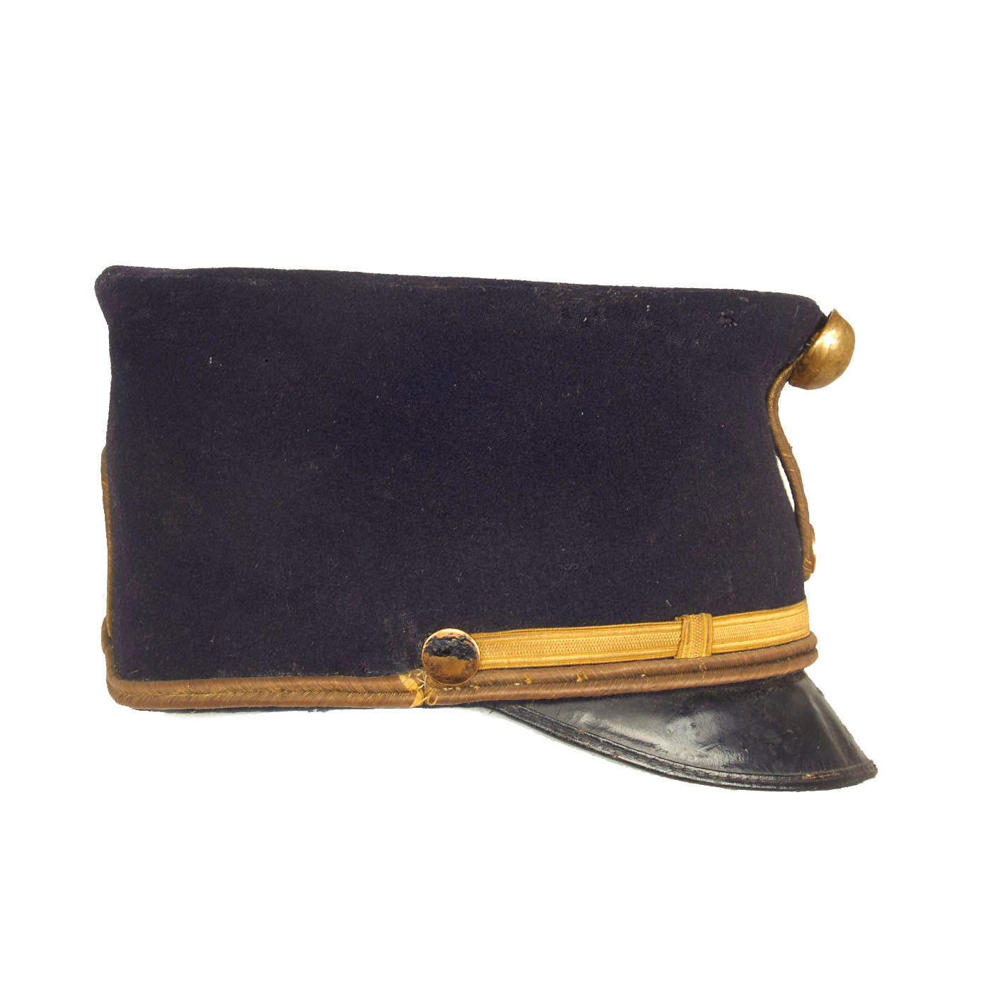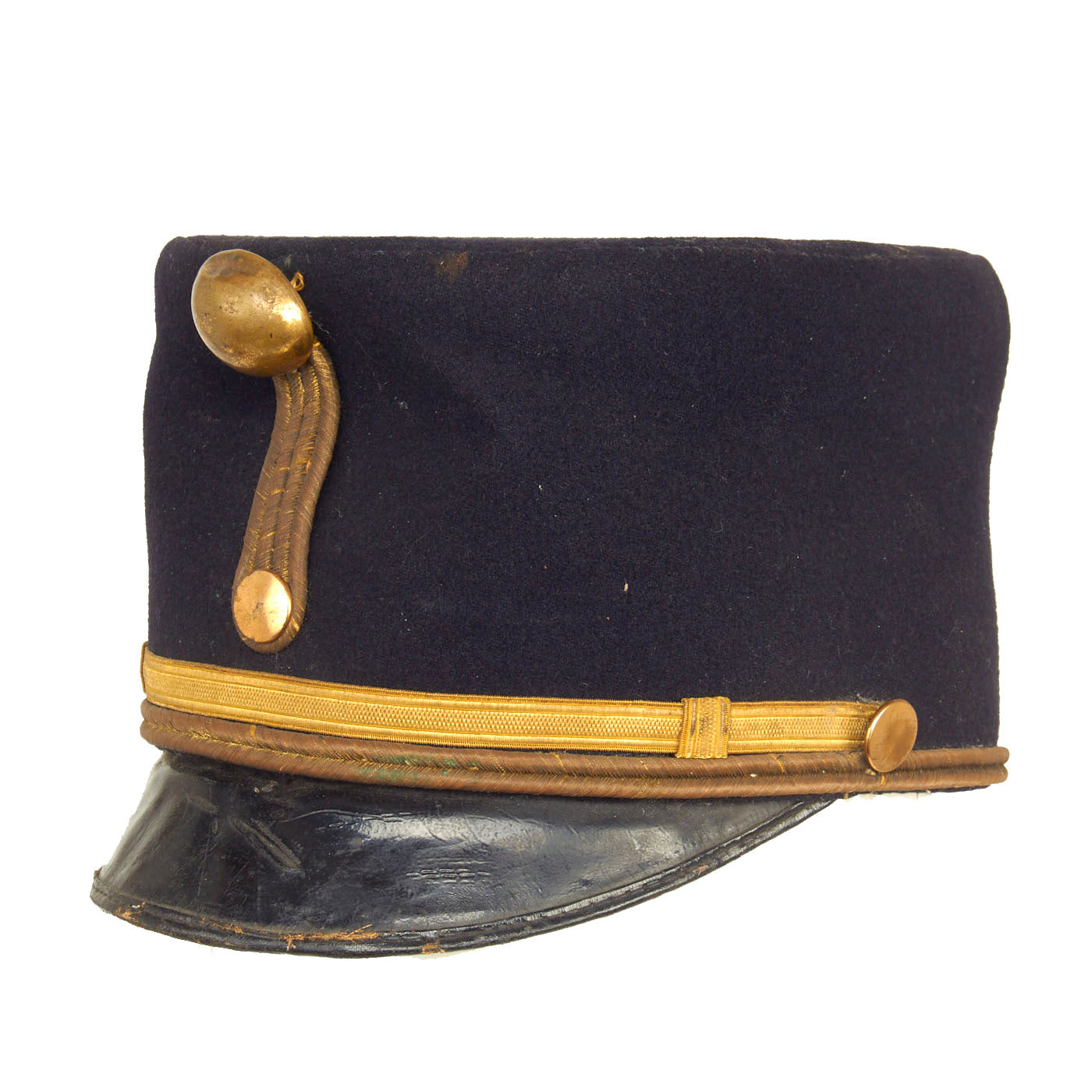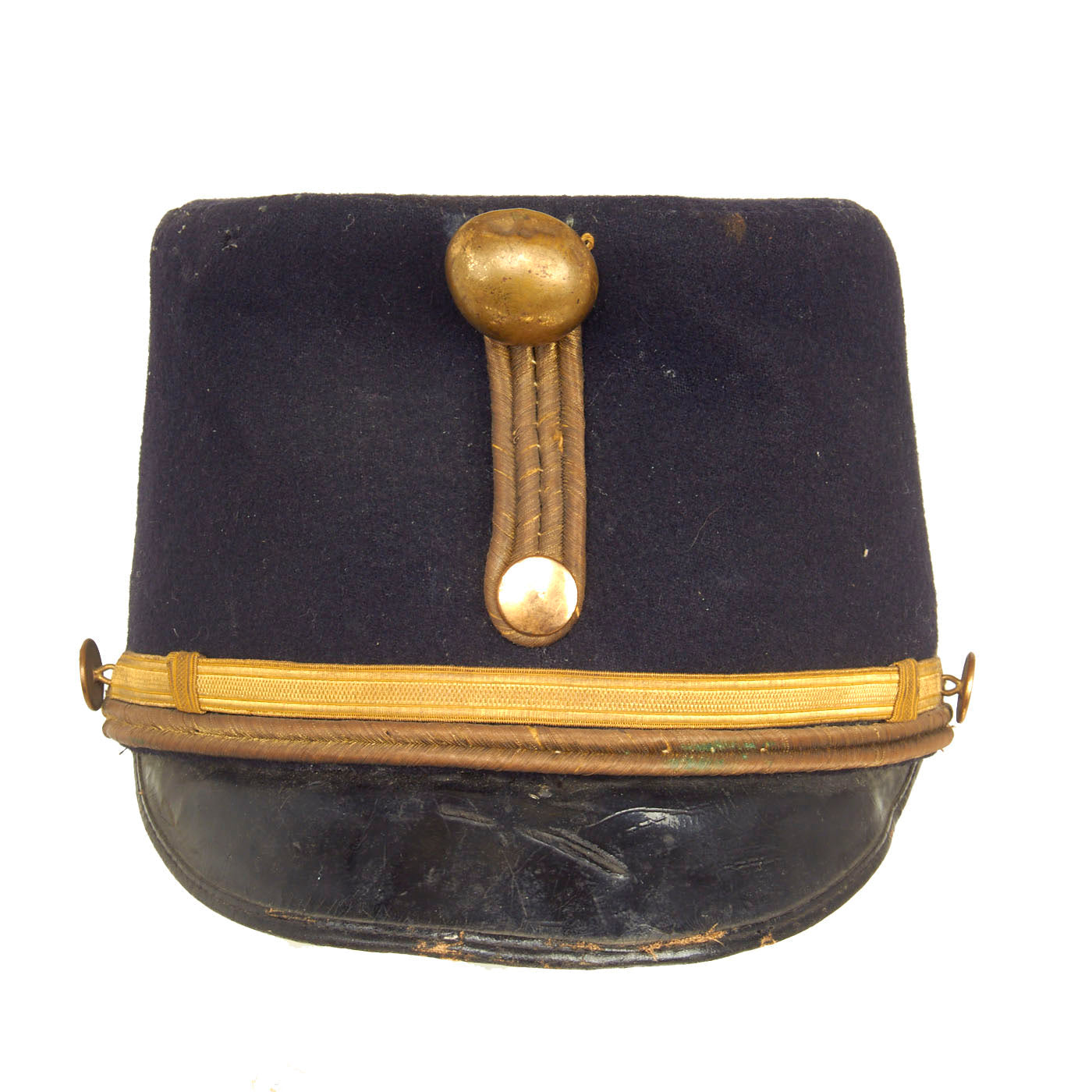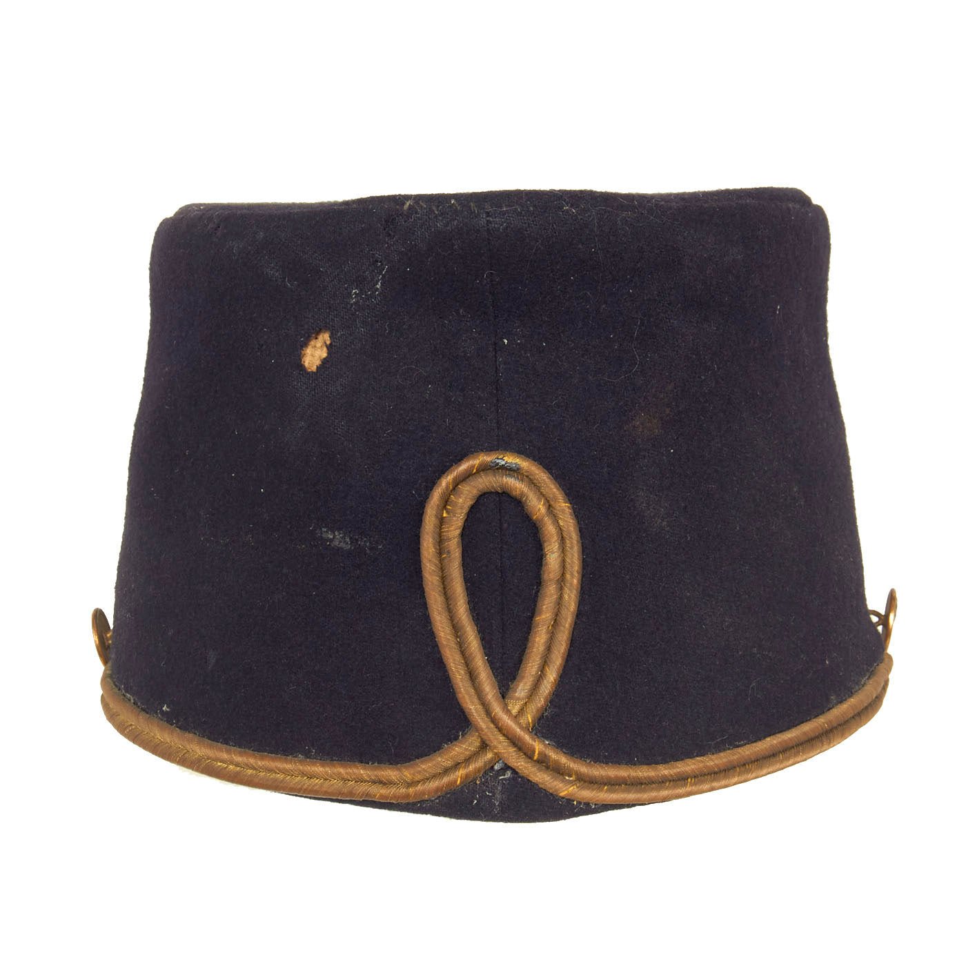 The Kepi is in wonderful condition for its age. The kepi itself is a little misshapen but once properly displayed it will stand up tall once again. The dark blue wool does have minor moth nips present but nothing damaging. The sweat band appears to be blackened oilcloth and is still in wonderful condition. The lining appears to be complete and undamaged with remnants of a label on it. There is a faint name written on the top lining as well as behind the sweatband but is difficult to read.