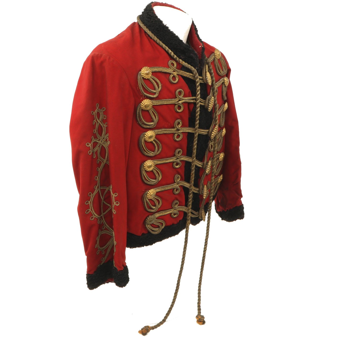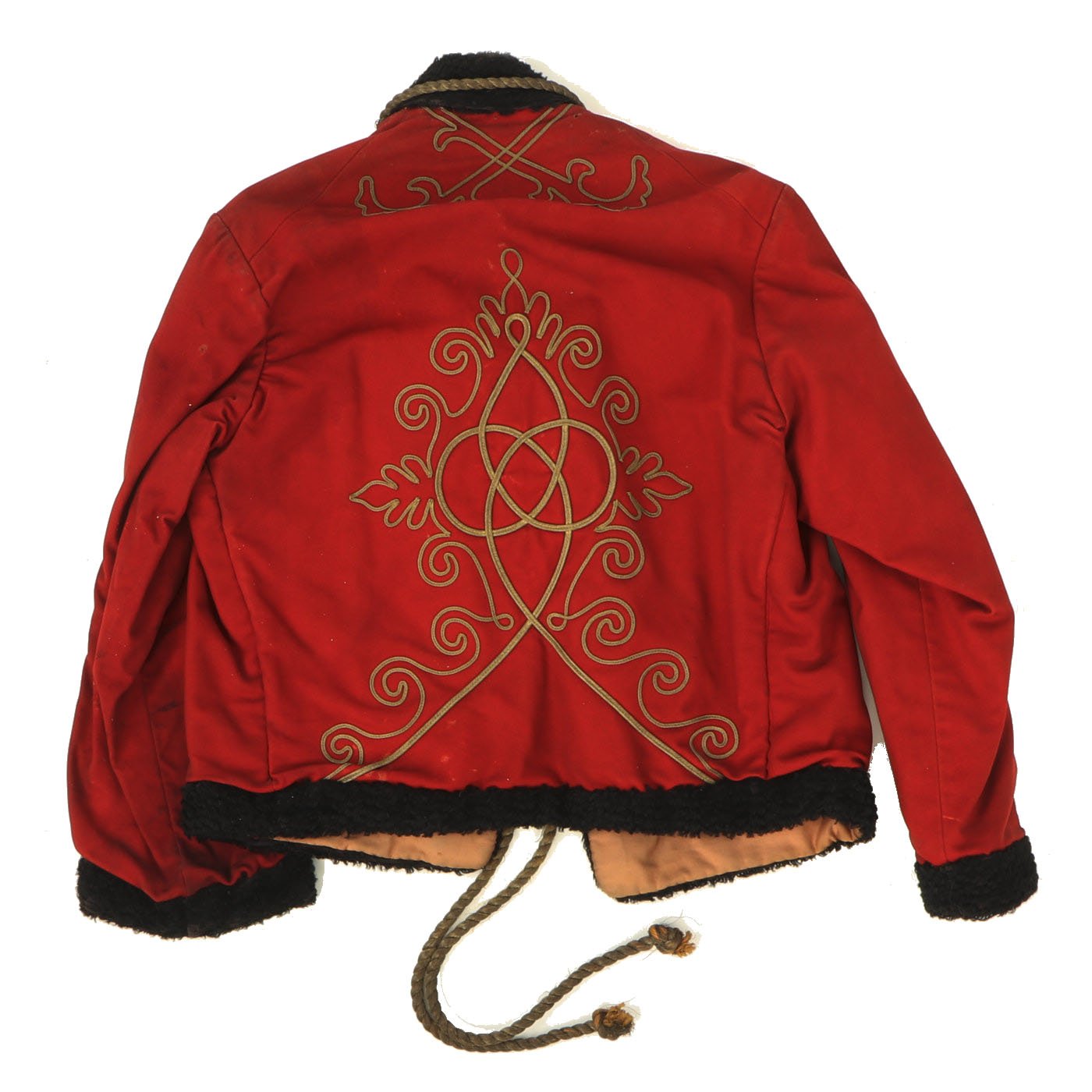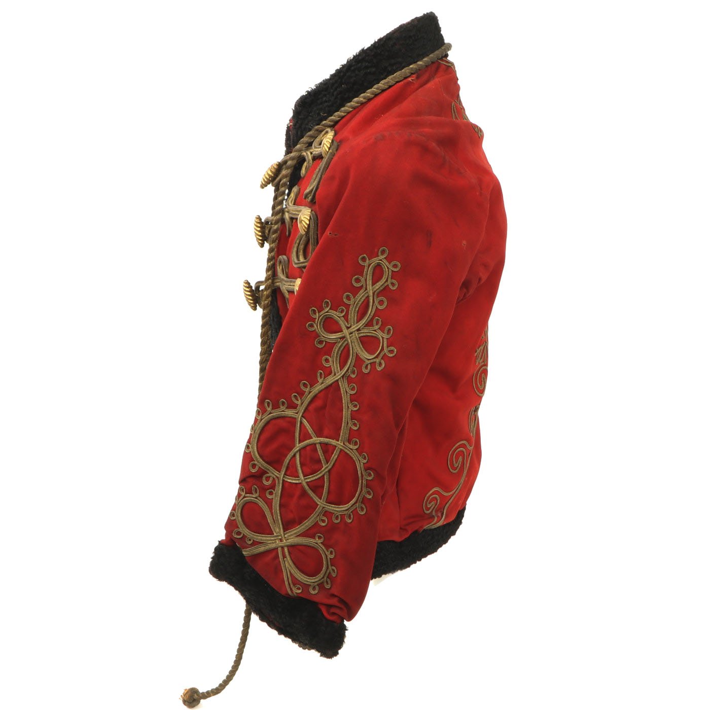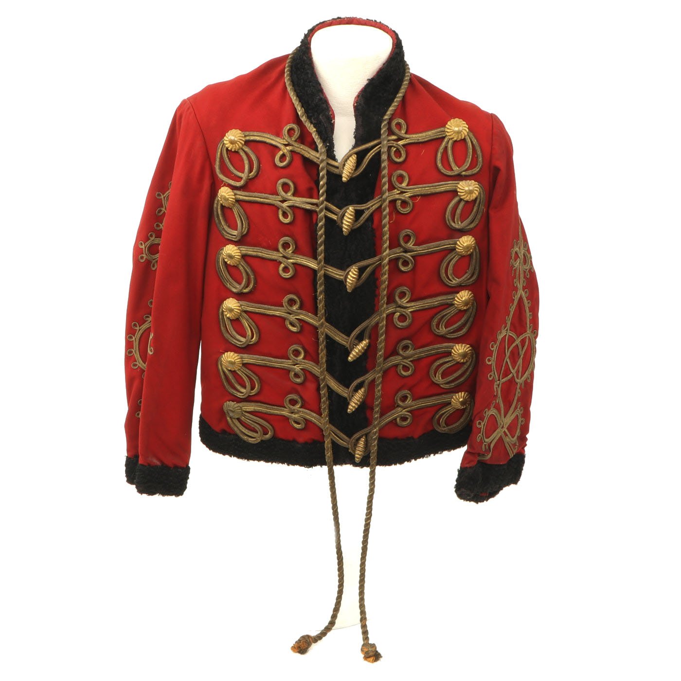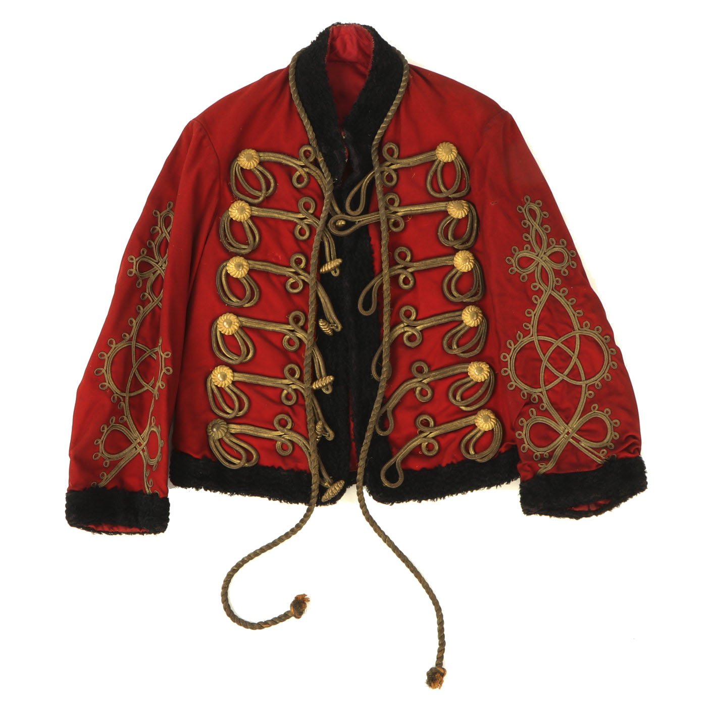 Original Item: Only One Available. Dating from the turn of the 19th and 20th centuries this is a Uhlan regiment officer's "Pelz Attila". Blue wool shell with gilt bullion wire embroidery and ten gilt "sun wheel" buttons. Fabulous frogging and cord piping with intricate designs down each sleeve. Black lamb's wool lay down collar, cuffs and 1" border down front and around bottom of tunic. Five gilt barrel fasteners. Two double 30" cords extend from under collar. Blue cloth lining with areas of wear and pulling. Overall condition is very good.
