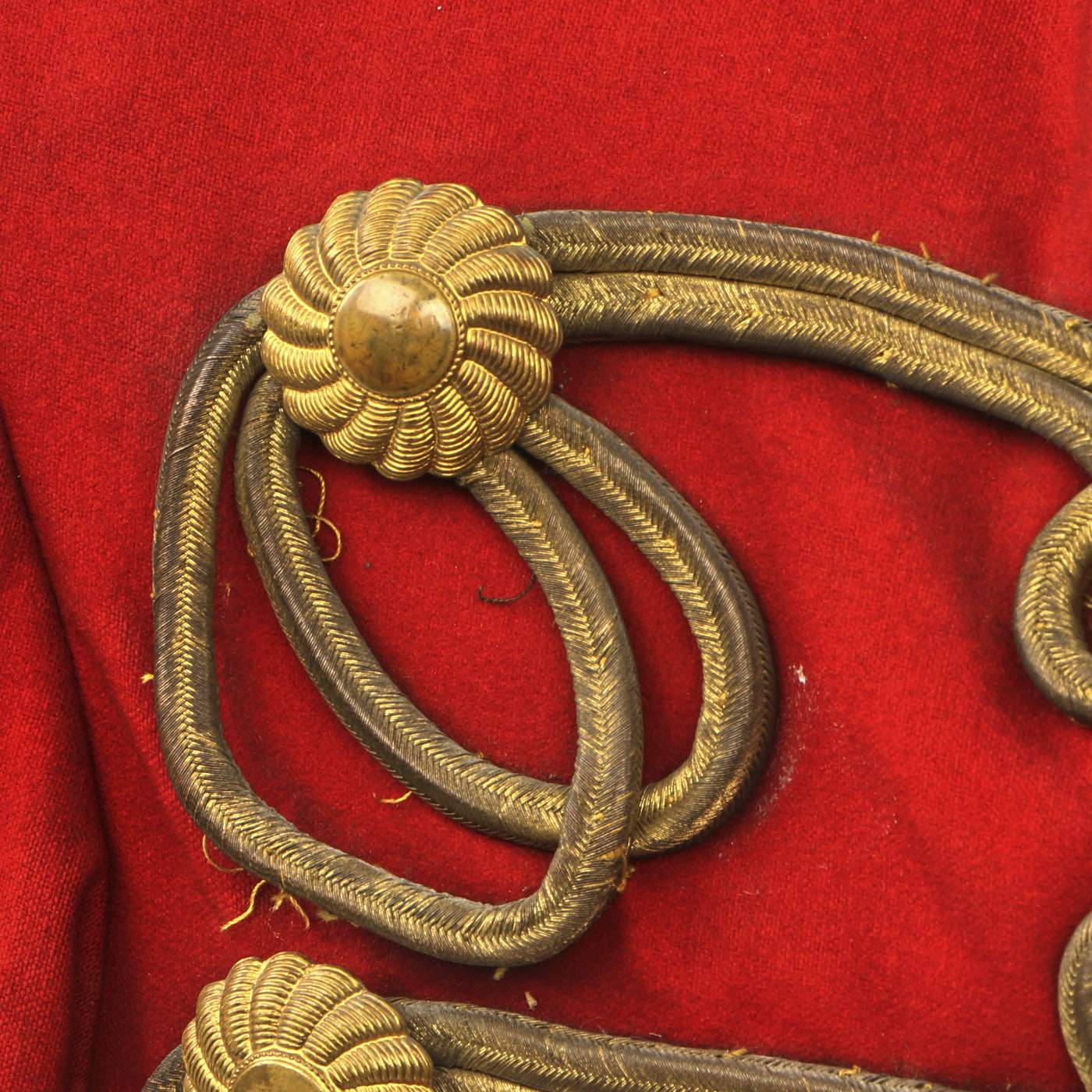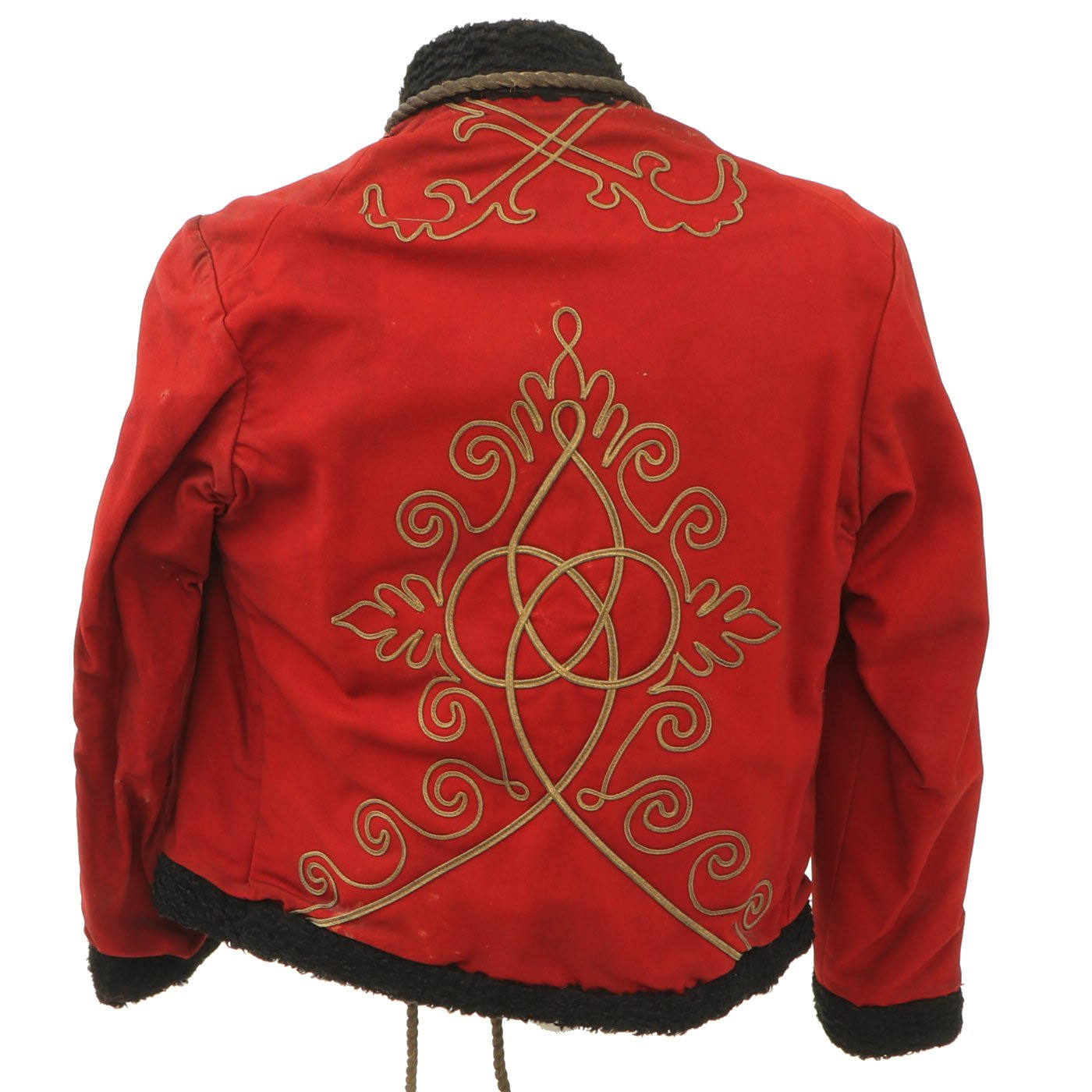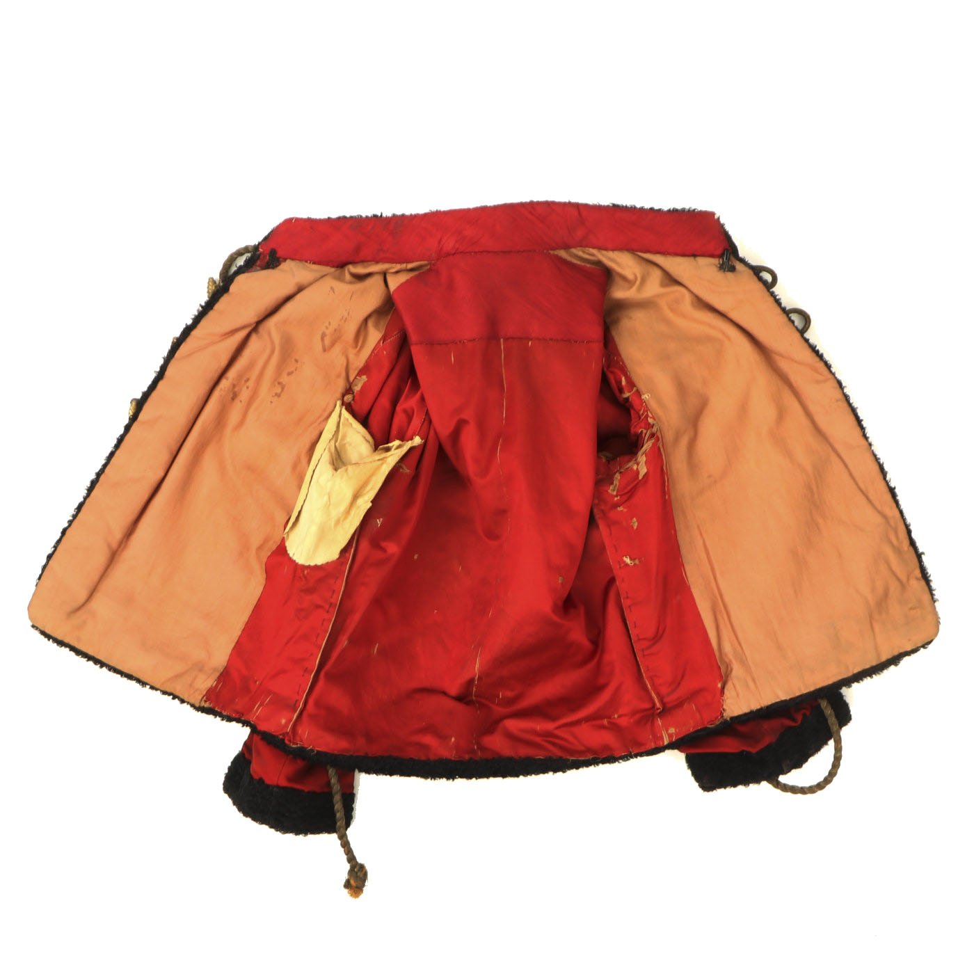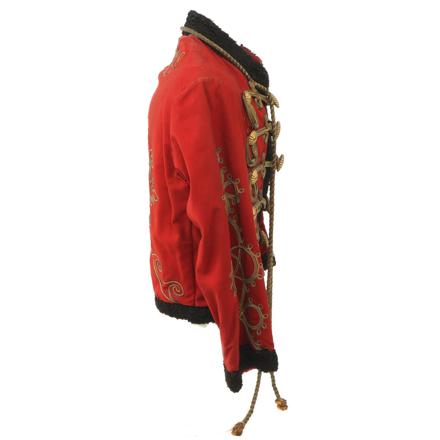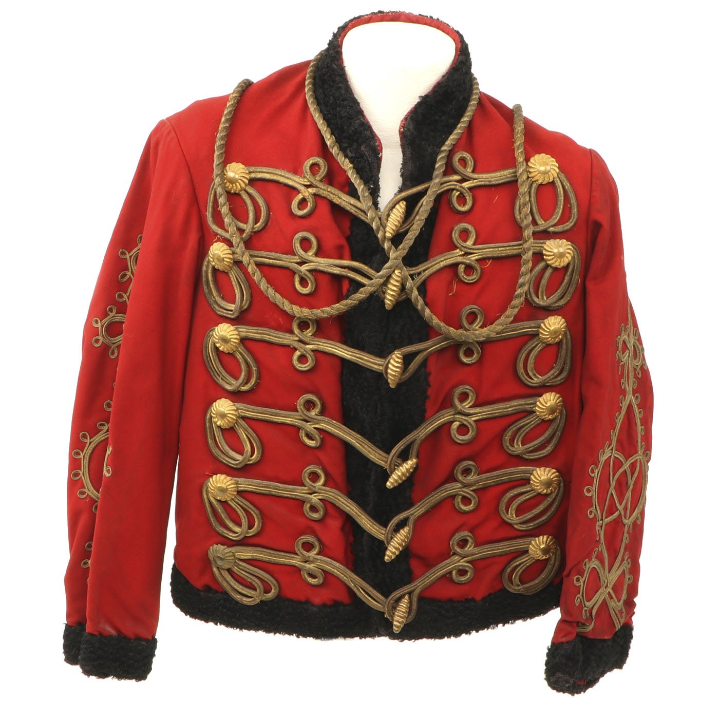 Original Item: Only One Available. Dating from the turn of the 19th and 20th centuries this is a Uhlan regiment officer's "Pelz Attila". Blue wool shell with gilt bullion wire embroidery and ten gilt "sun wheel" buttons. Fabulous frogging and cord piping with intricate designs down each sleeve. Black lamb's wool lay down collar, cuffs and 1" border down front and around bottom of tunic. Five gilt barrel fasteners. Two double 30" cords extend from under collar. Blue cloth lining with areas of wear and pulling. Overall condition is very good.