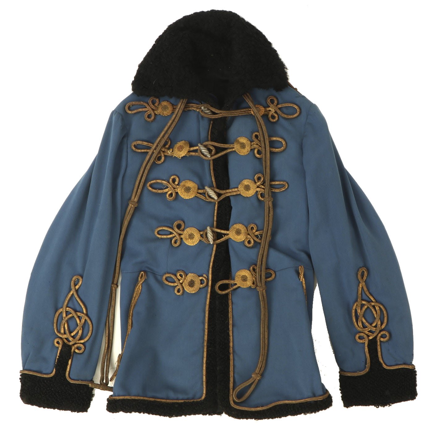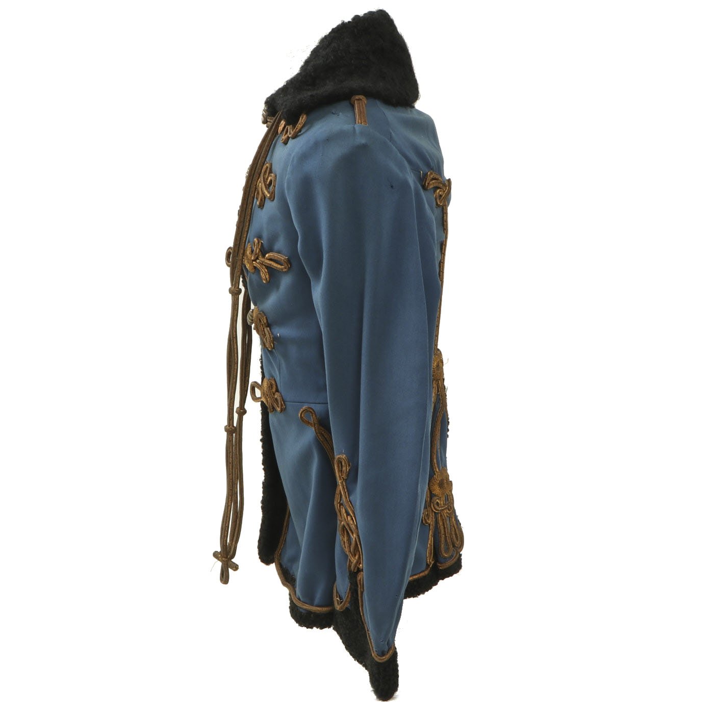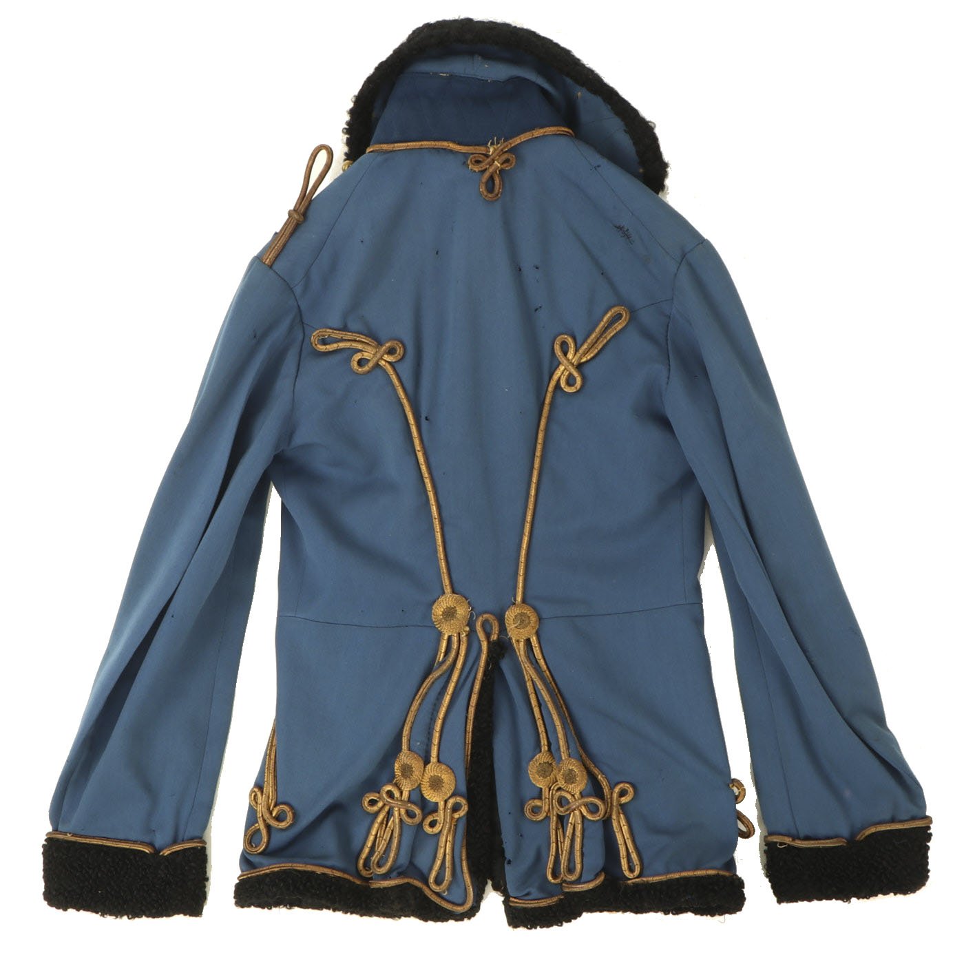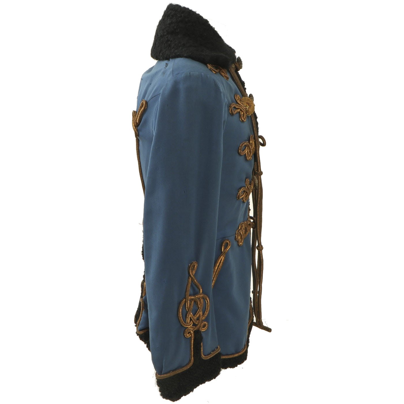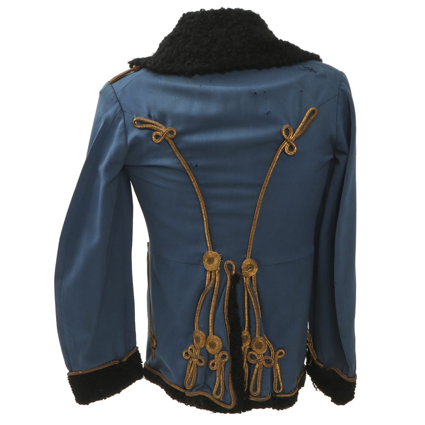 Original Item: Only One Available. Dating from the turn of the 19th and 20th centuries this is a Uhlan regiment officer's "Pelz Attila". Blue wool shell with gilt bullion wire embroidery and ten gilt "sun wheel" buttons. Fabulous frogging and cord piping with intricate designs down each sleeve. Black lamb's wool lay down collar, cuffs and 1" border down front and around bottom of tunic. Five gilt barrel fasteners. Two double 30" cords extend from under collar. Blue cloth lining with areas of wear and pulling. Overall condition is very good.