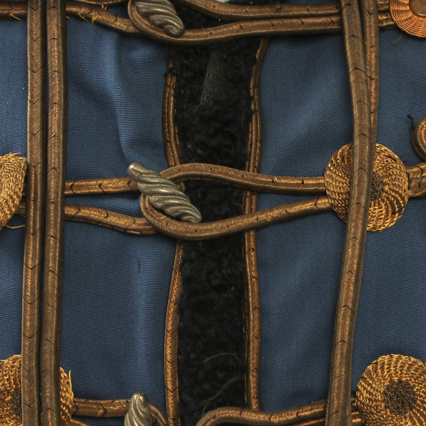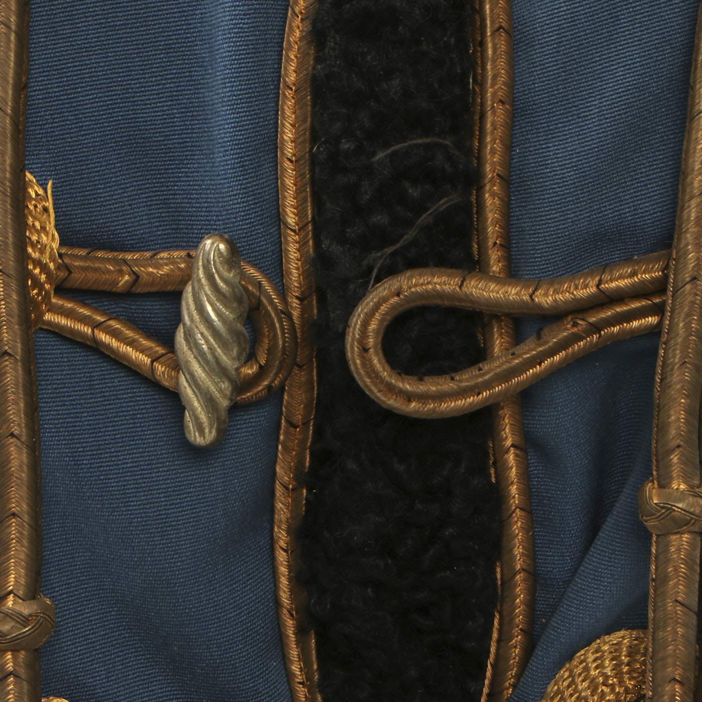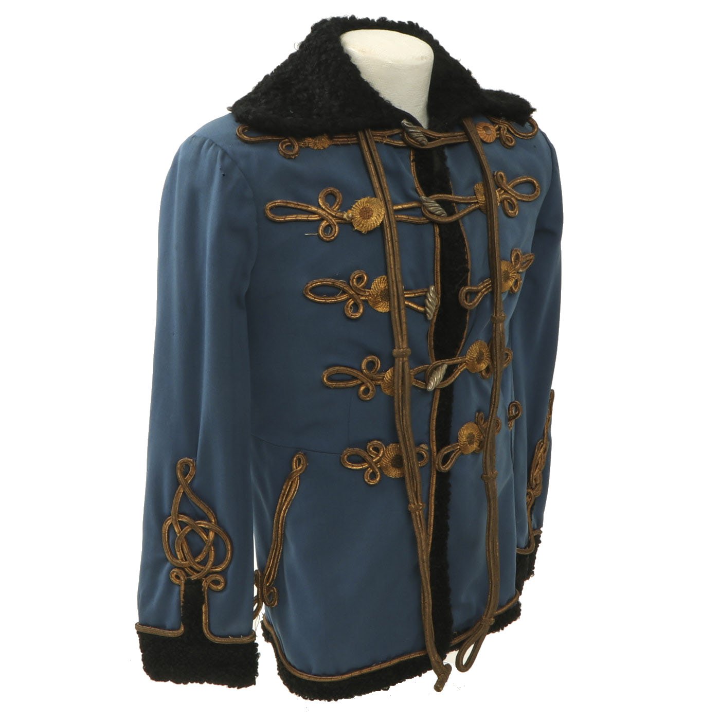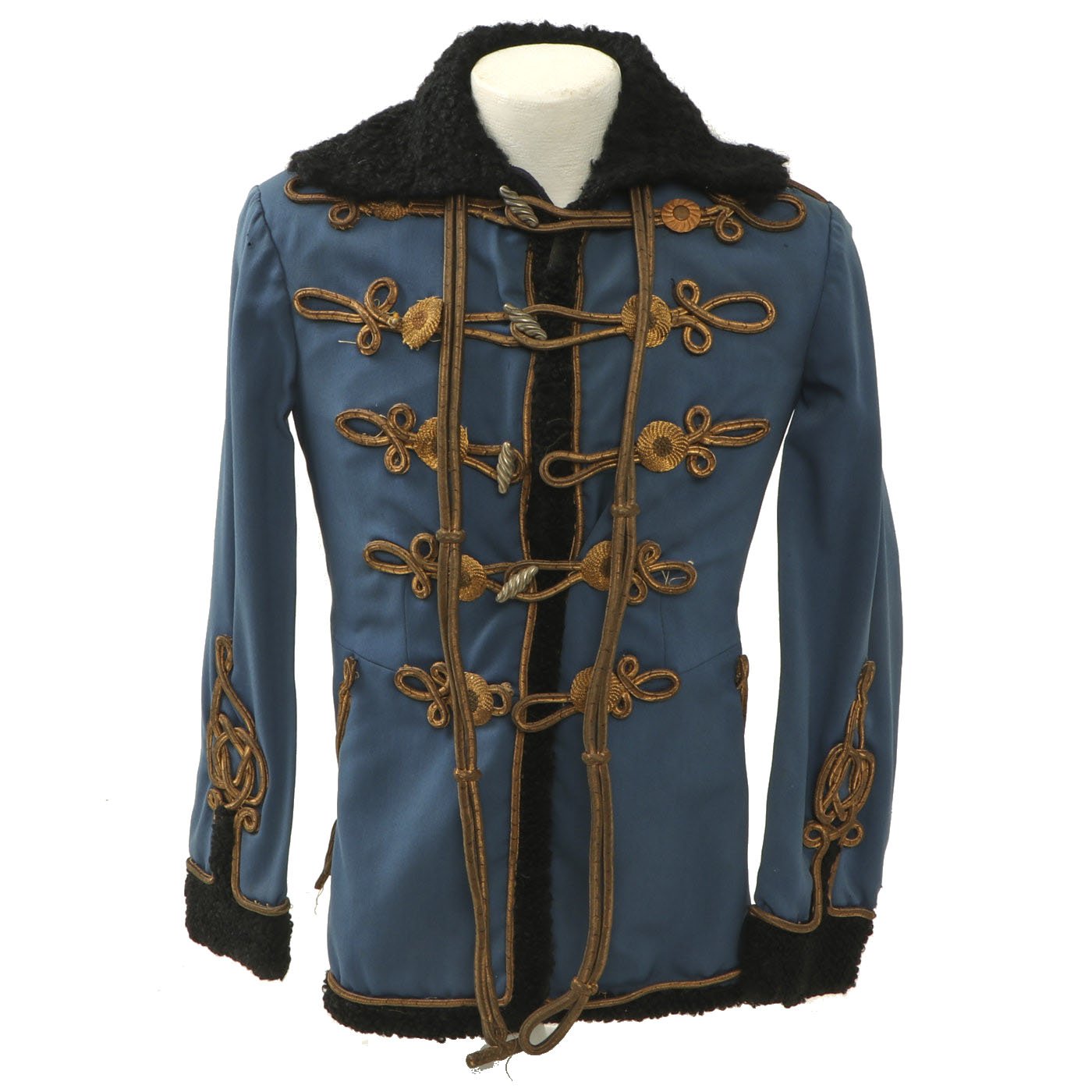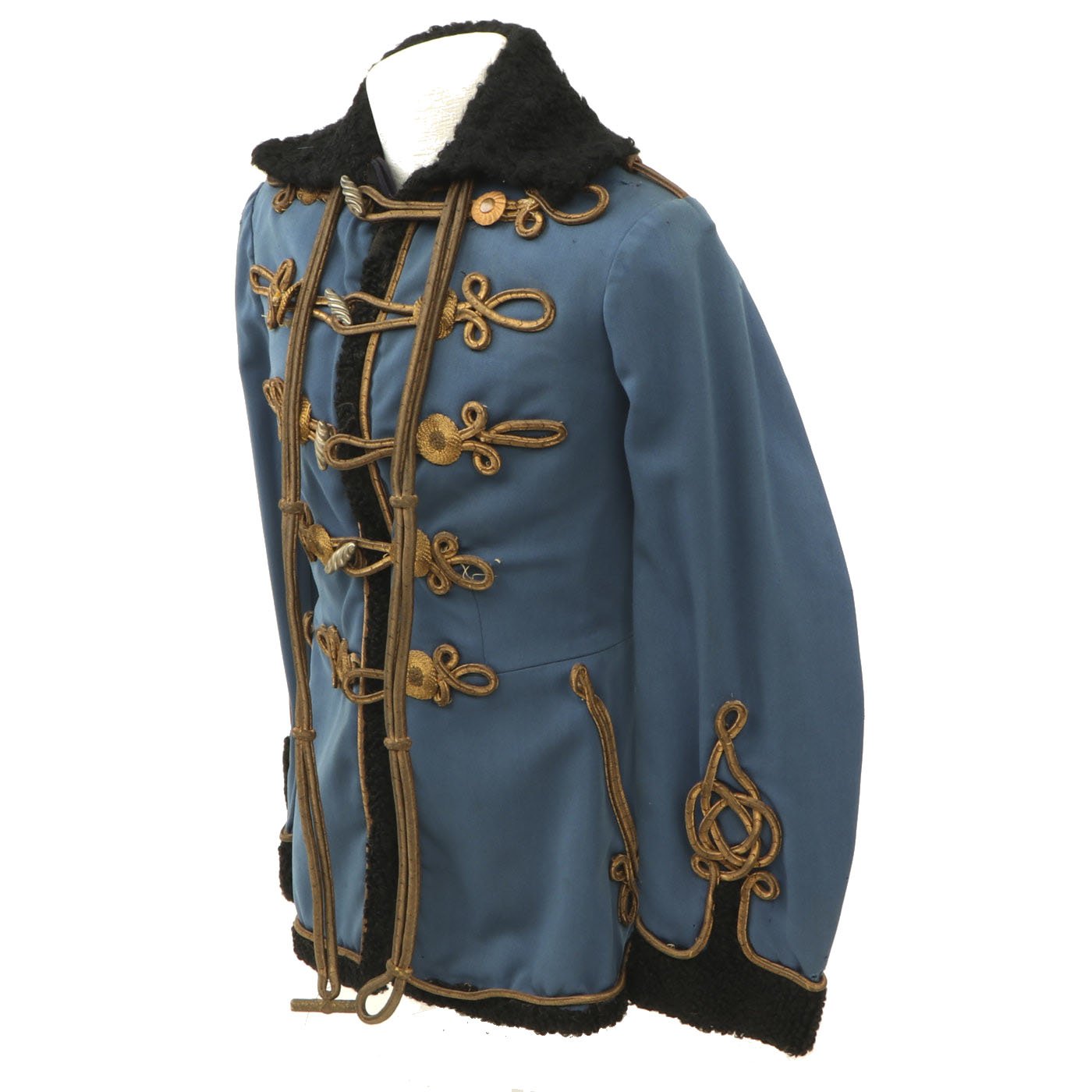 Original Item: Only One Available. Dating from the turn of the 19th and 20th centuries this is a Uhlan regiment officer's "Pelz Attila". Blue wool shell with gilt bullion wire embroidery and ten gilt "sun wheel" buttons. Fabulous frogging and cord piping with intricate designs down each sleeve. Black lamb's wool lay down collar, cuffs and 1" border down front and around bottom of tunic. Five gilt barrel fasteners. Two double 30" cords extend from under collar. Blue cloth lining with areas of wear and pulling. Overall condition is very good.