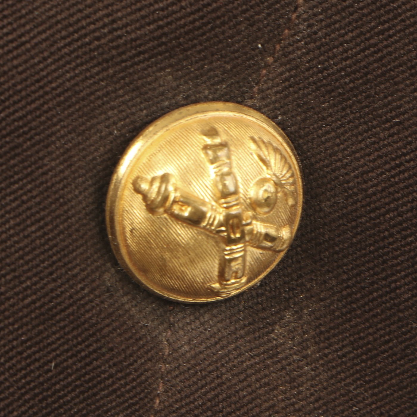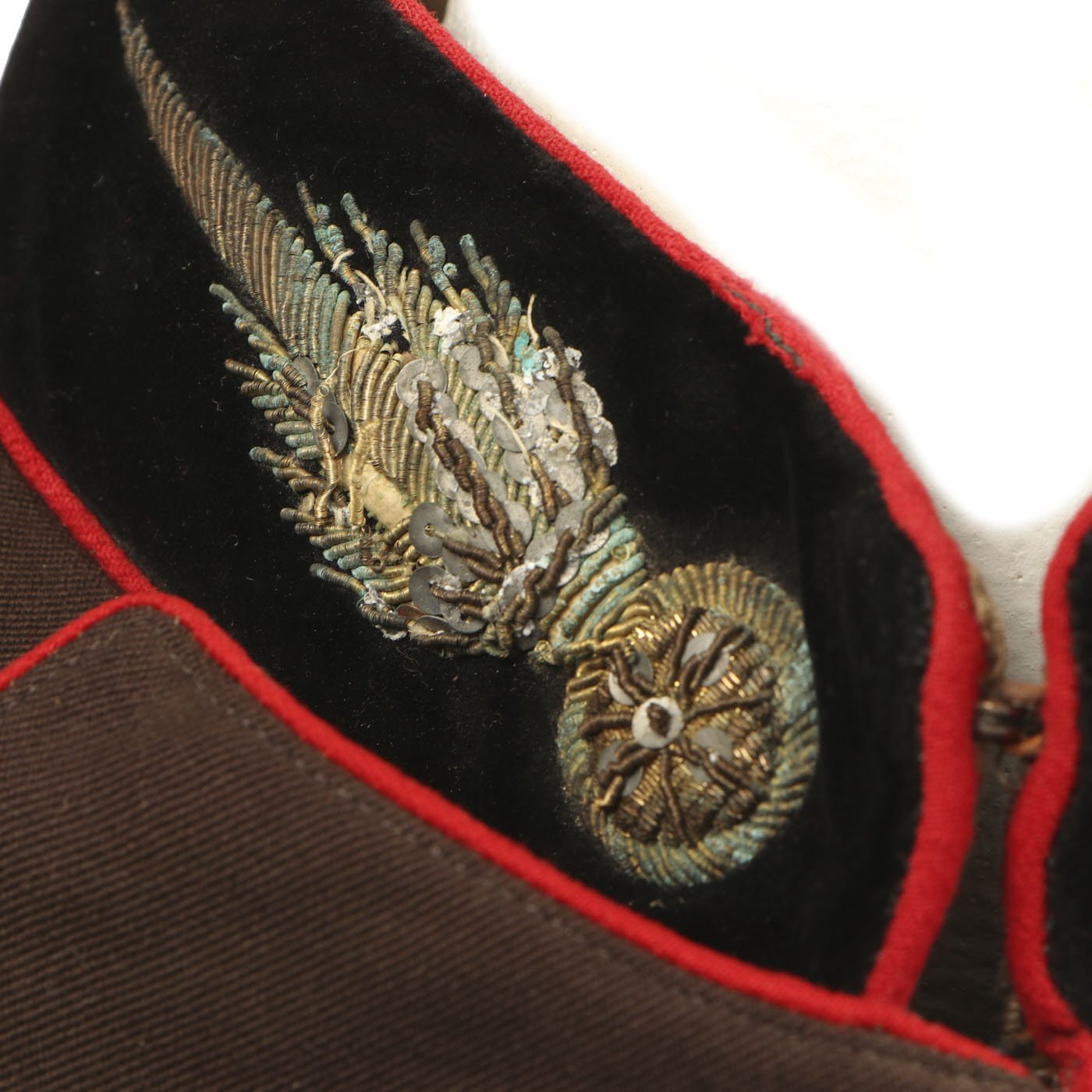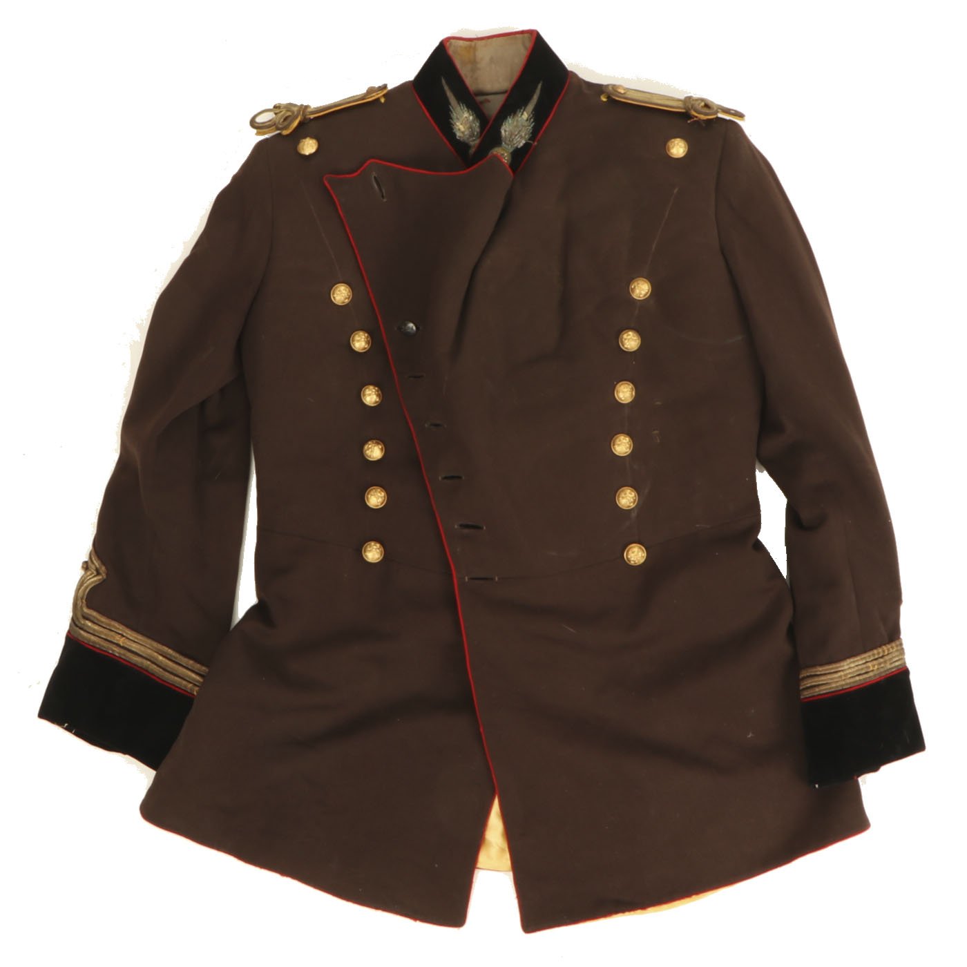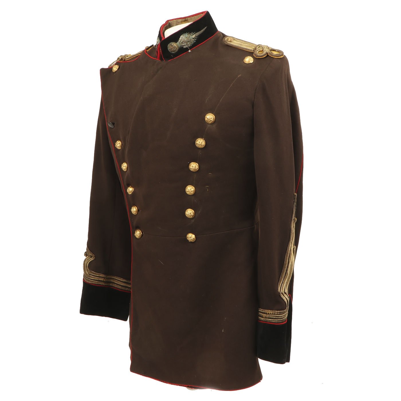 Original Item: Only One Available. Quite frankly, we aren't exactly sure what this tunic is. We believe it is French based on FRANCAIS back marked buttons, the style and insignia.. We believe it to be an officers tunic based on the epaulets ans sleeve braid. It is a finely made garment grey wool exterior shell with quilted rayon type interior lining. It is double breasted with copious amounts of gilt bullion braid and gilt artillery buttons. We believe it dates from the early 20th century before World War One.