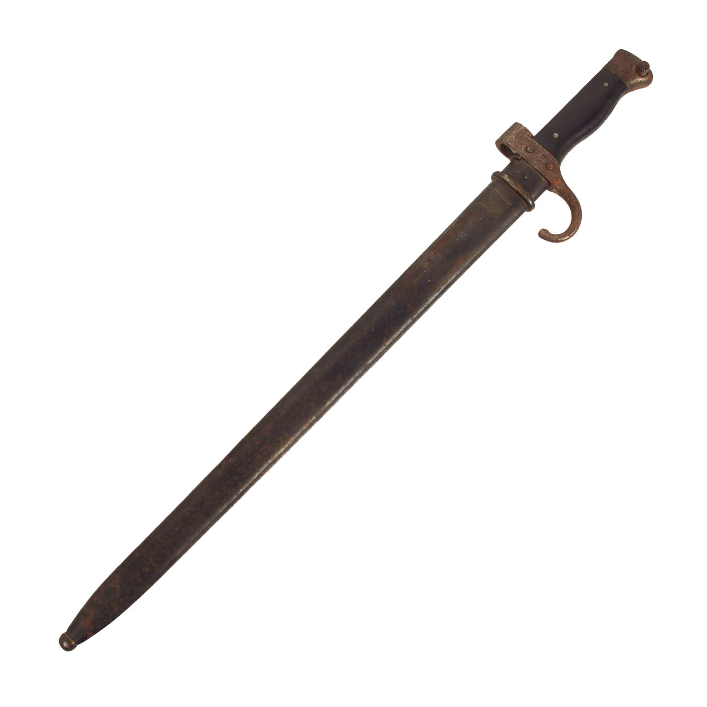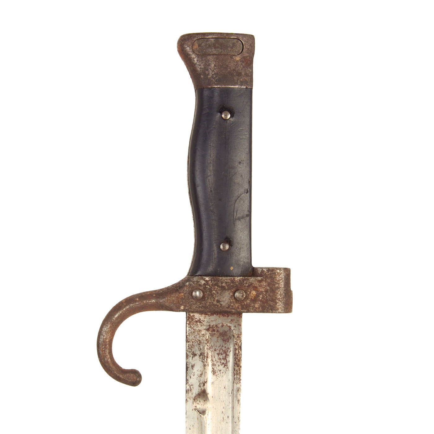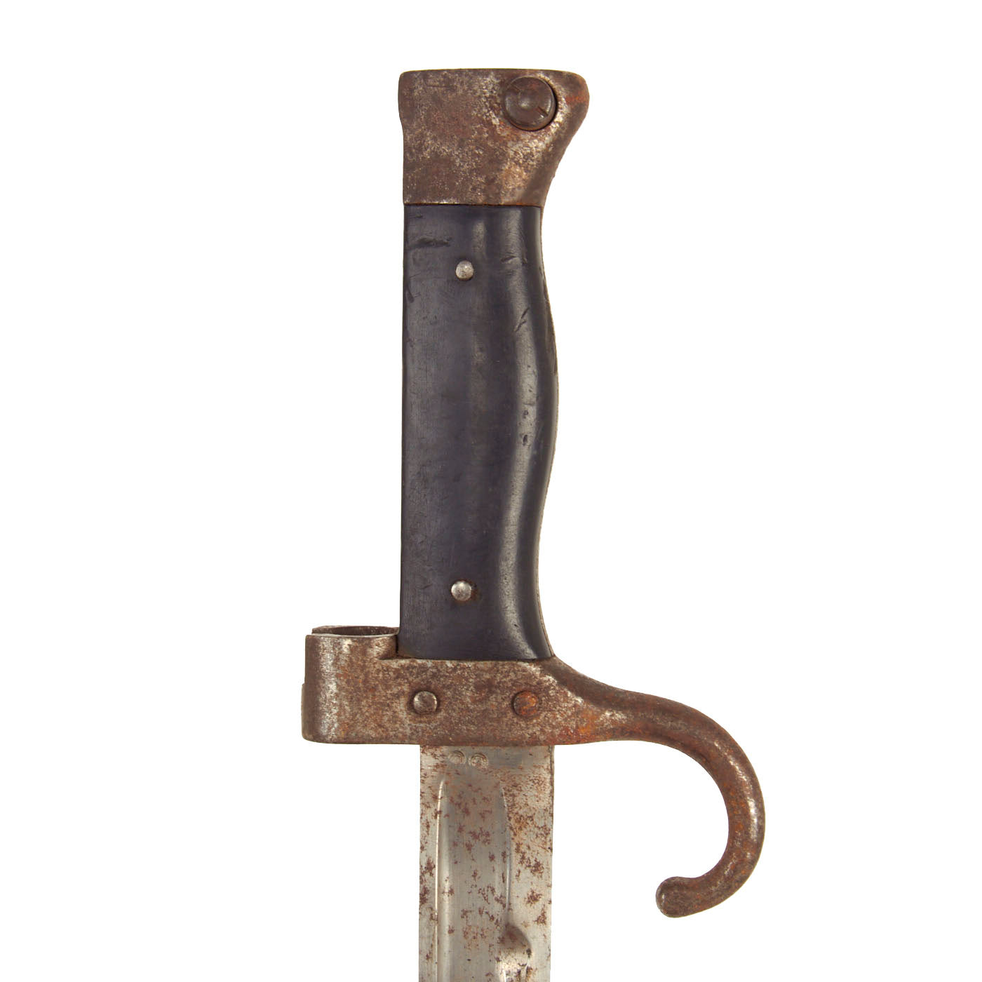 Original Item: Only One Available. These were originally issued before the Great War and were designed to be for use with the Mannlicher Berthier Infantry Rifles. It is a somewhat standard sword type bayonet, with a single edged fullered blade. The pommel design however is definitely somewhat unique, designed for a bayonet lug that fits into a round hole in the pommel of the bayonet.