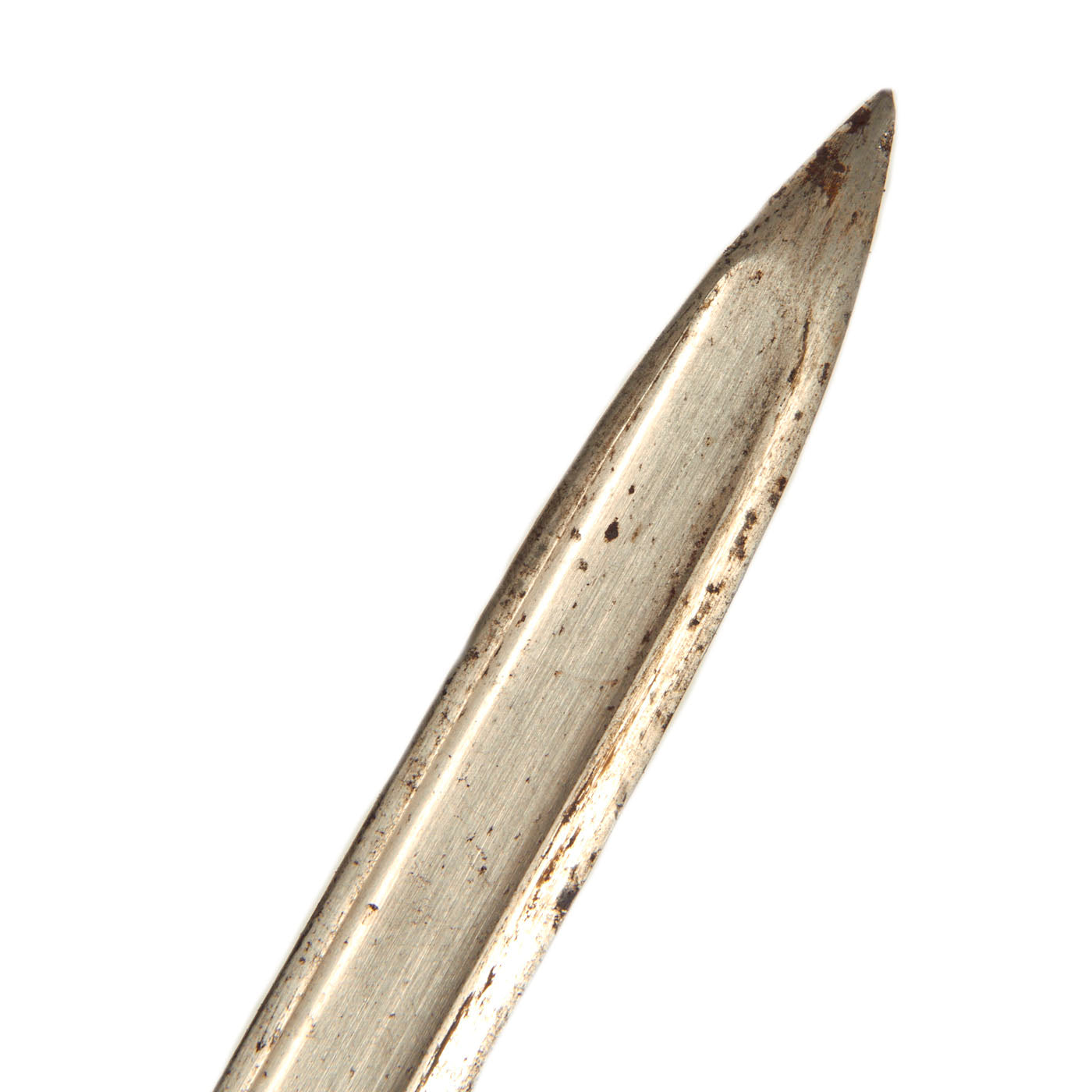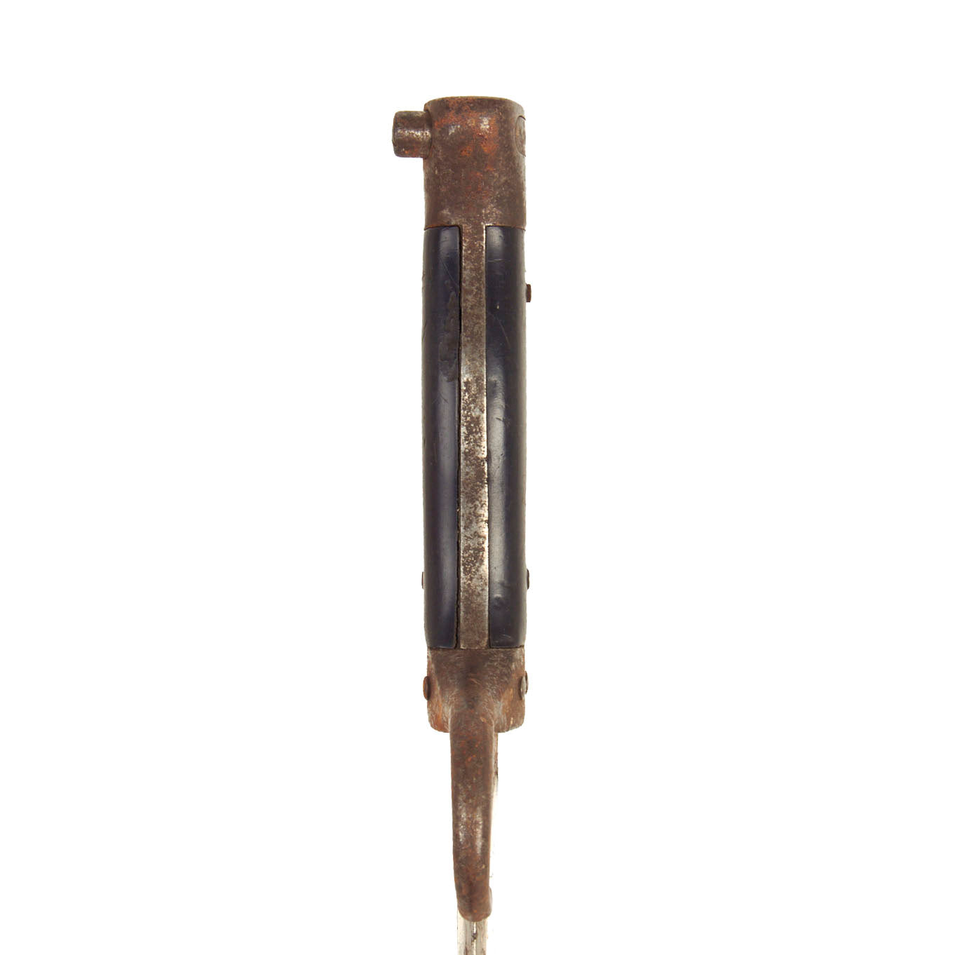 Condition is very good, with wear and light oxidation commensurate with age. There is some cracking of the wooden grip scales around the retaining rivets. The bayonet latch is fully functional, and the scabbard and bayonet are not serial number matched.
