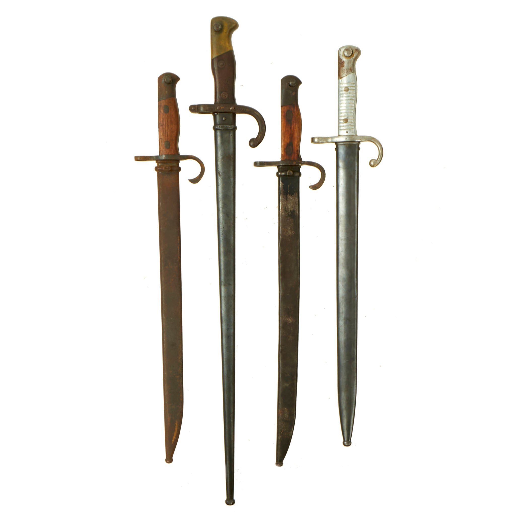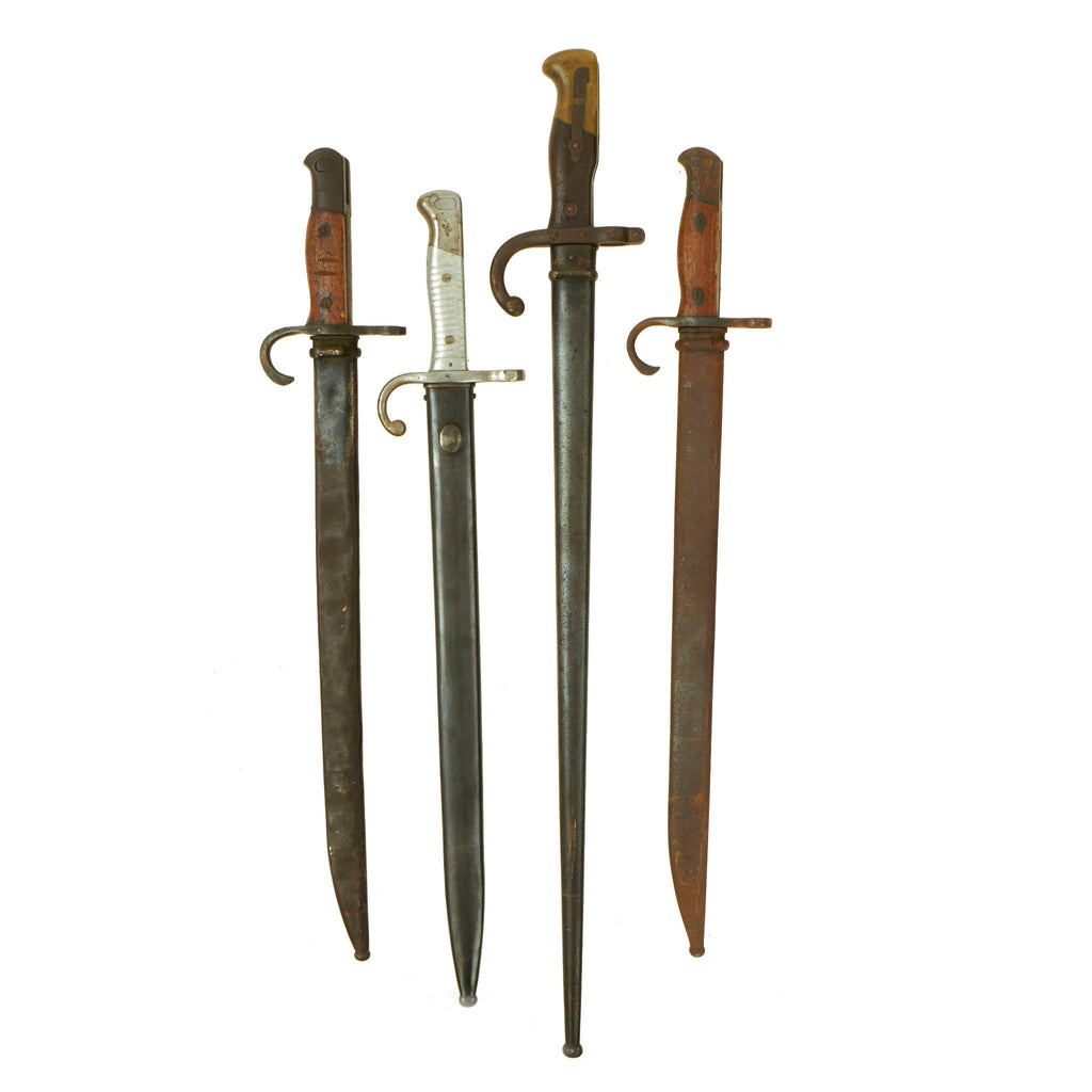 The Bayonets In This Collection are offered in wonderful condition and all retain their original scabbards. The country of origin as well as dates vary from Pre WWI French to WWII Japanese and Argentine bayonets. Please consult the photos for the finer details.