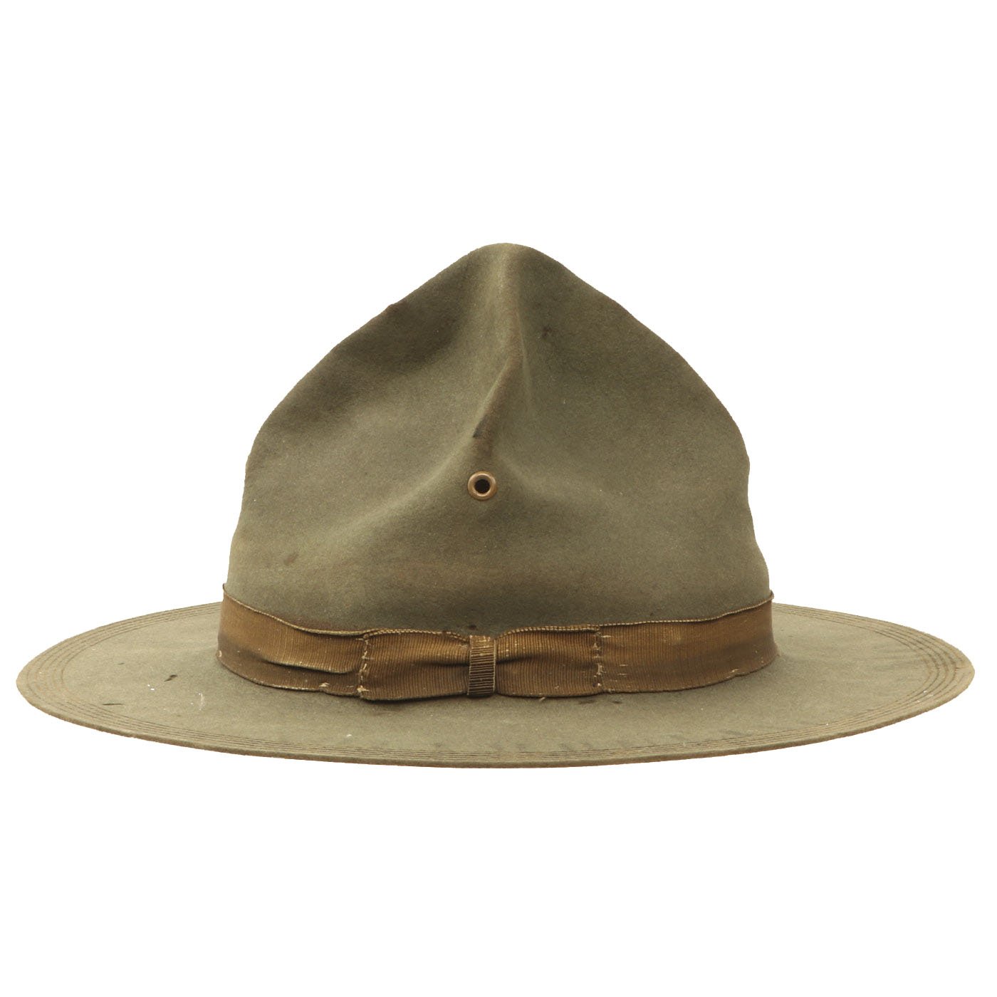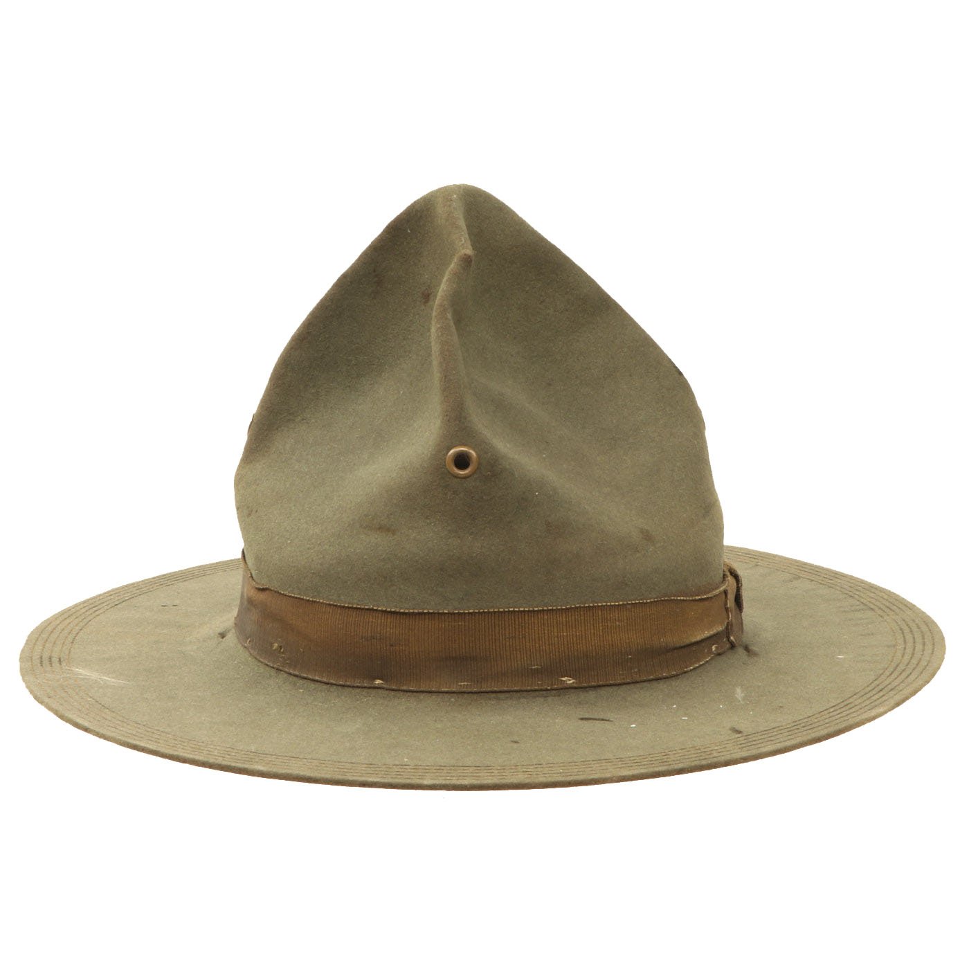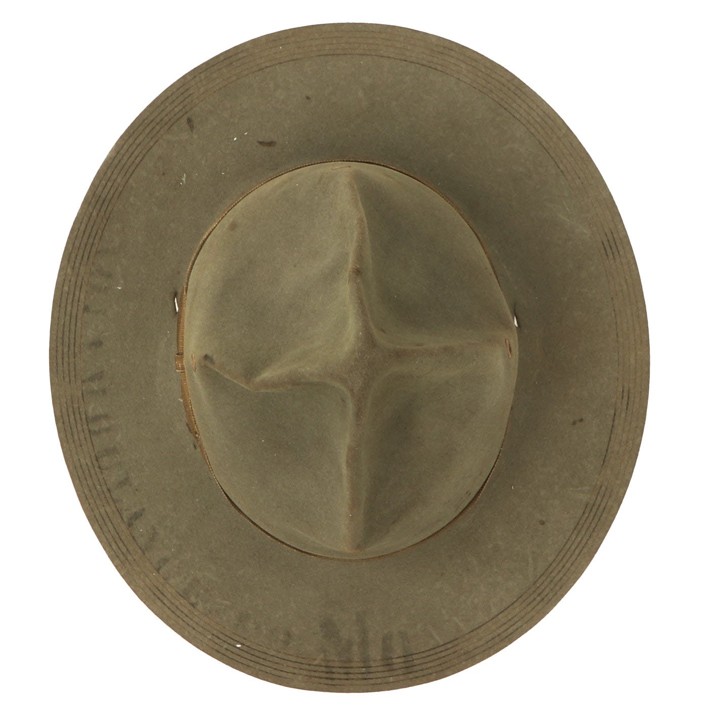 The Hat, Service, M1911 (Campaign Hat) was made of OD wool felt with a wide brim and "Montana peak" crown. There were ventilation holes in the crown with grommets, a silk hatband, and a silk and brass braid cord closed by a knot and terminated with a tassel. Inside was a leather sweatband and an attached chin strap. The Army model was dark brown OD in color.