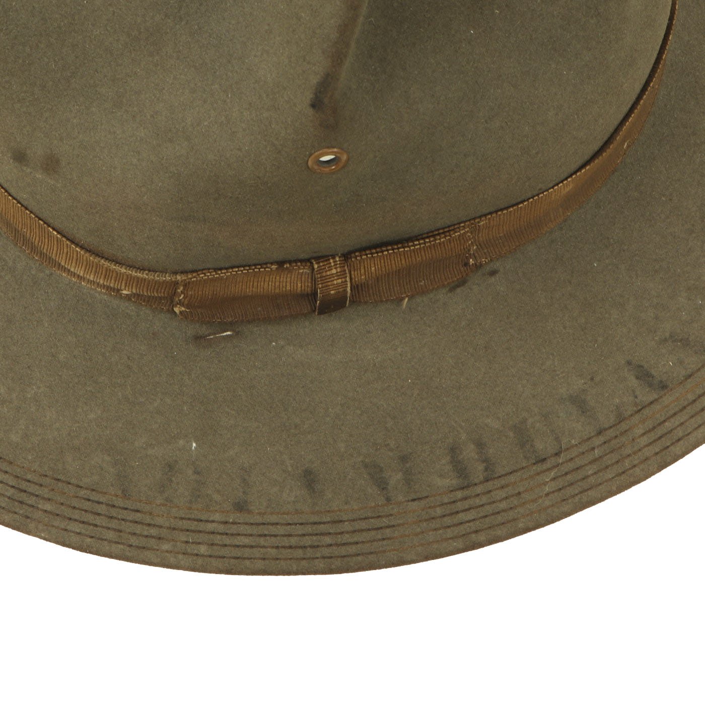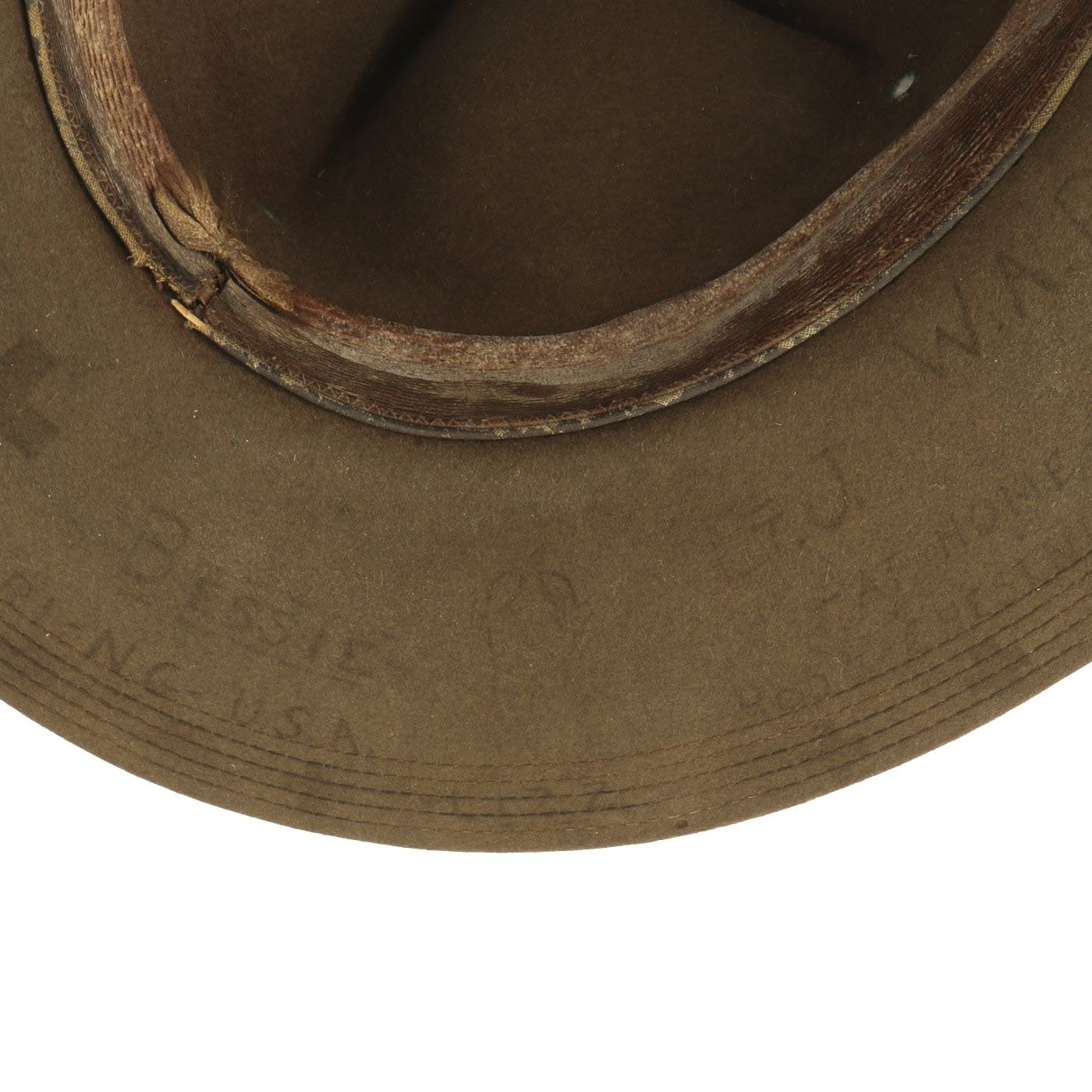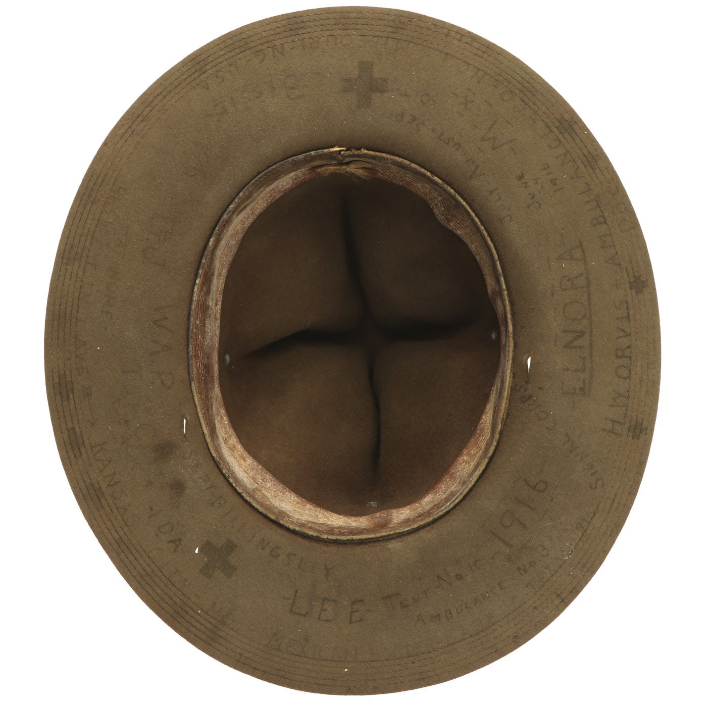 This is a private very nice WWI Era M1911 Campaign Hat, which was used during the "Pancho Villa Expedition", and during that time was decorated on the top and bottom of the brim. There are many names, unit designations, locations, dates, and other markings drawn on the bottom. There are two medic crosses, and mentions of an "AMBULANCE" on the bottom, so this cap may have been with one of the Field Medic units deployed during the expedition. Some of the markings are quite faint and/or not legible, but this would make a great research and transcription project. Please consult the pictures for further details, as we tried to get all of the markings that we could see. There are even some on the sweatband itself!