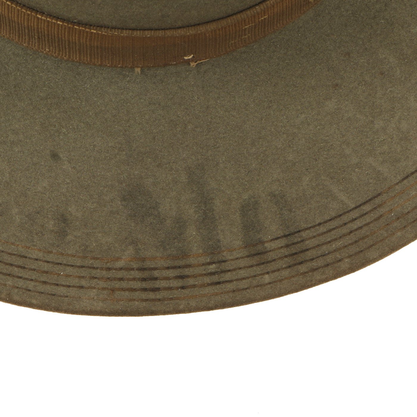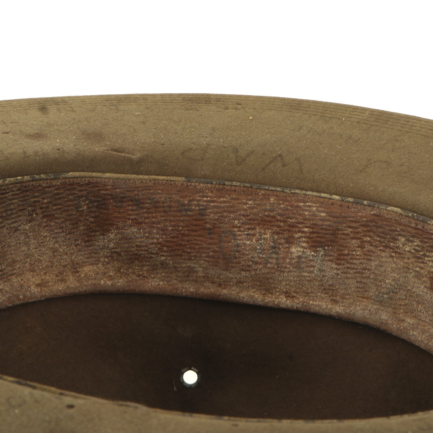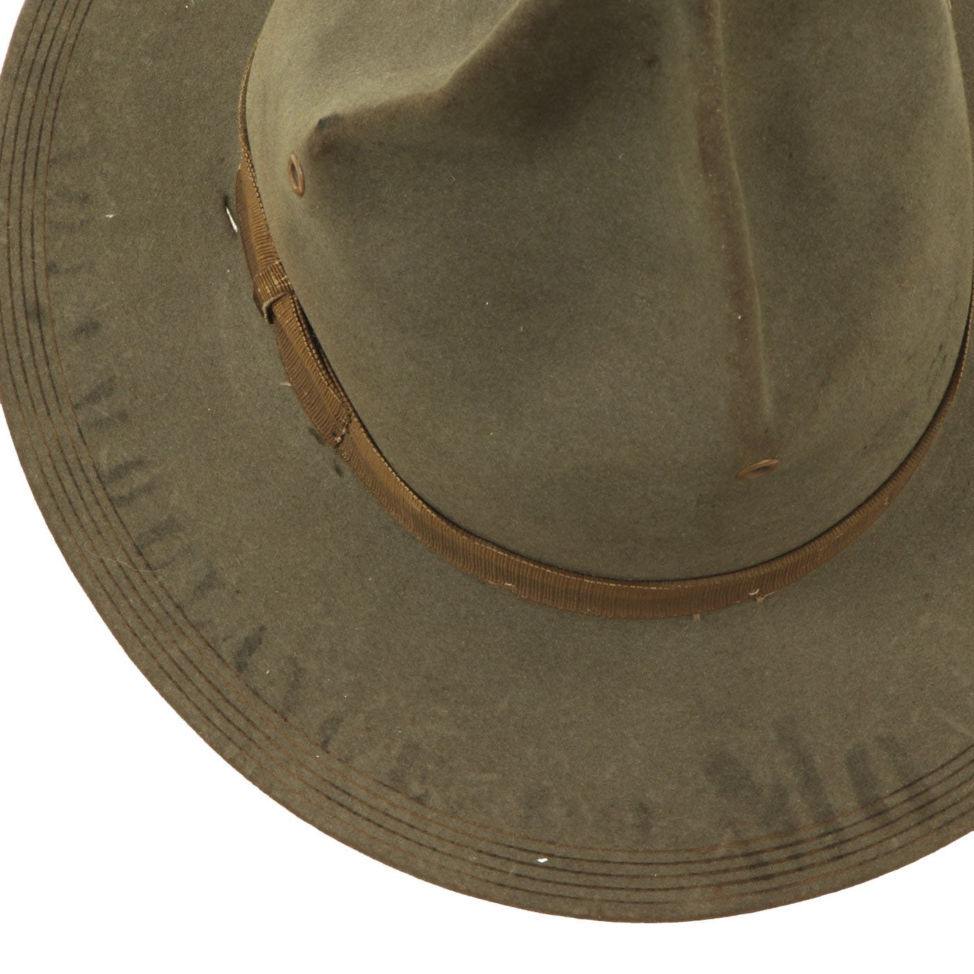 This is a private very nice WWI Era M1911 Campaign Hat, which was used during the "Pancho Villa Expedition", and during that time was decorated on the top and bottom of the brim. There are many names, unit designations, locations, dates, and other markings drawn on the bottom. There are two medic crosses, and mentions of an "AMBULANCE" on the bottom, so this cap may have been with one of the Field Medic units deployed during the expedition. Some of the markings are quite faint and/or not legible, but this would make a great research and transcription project. Please consult the pictures for further details, as we tried to get all of the markings that we could see. There are even some on the sweatband itself!