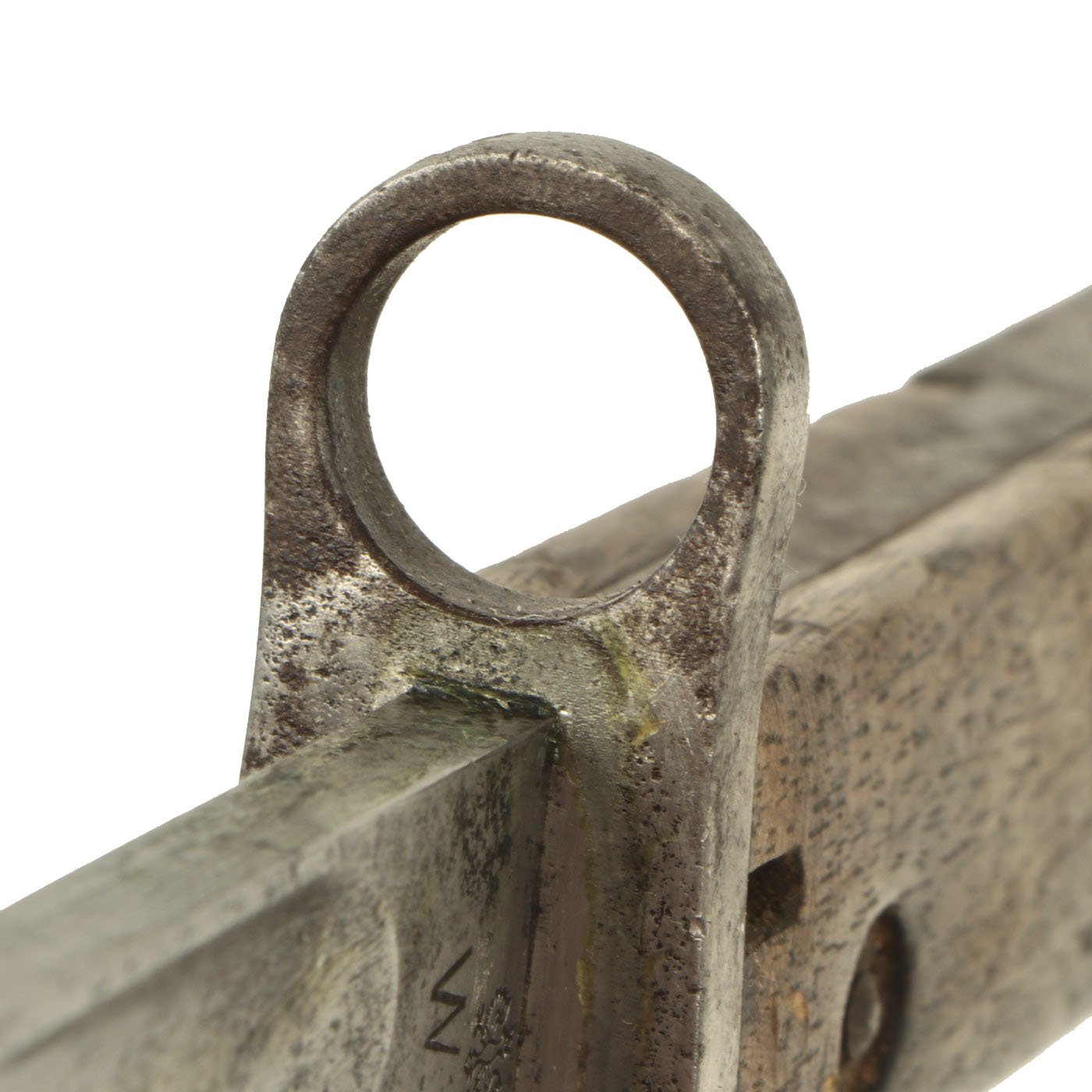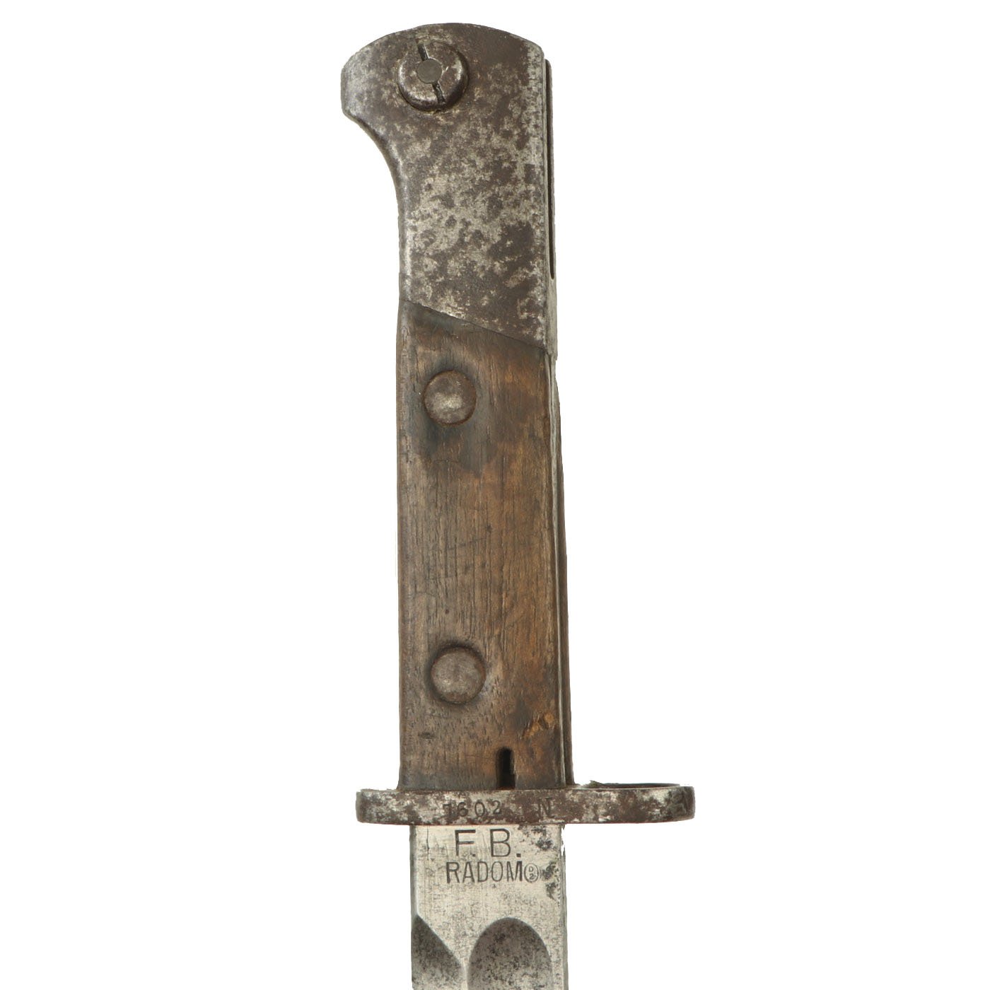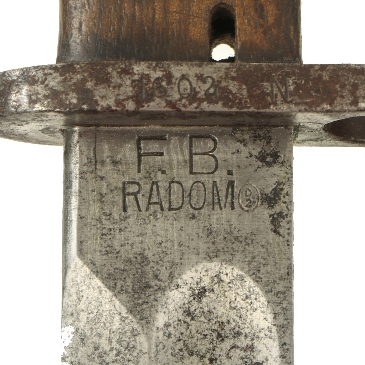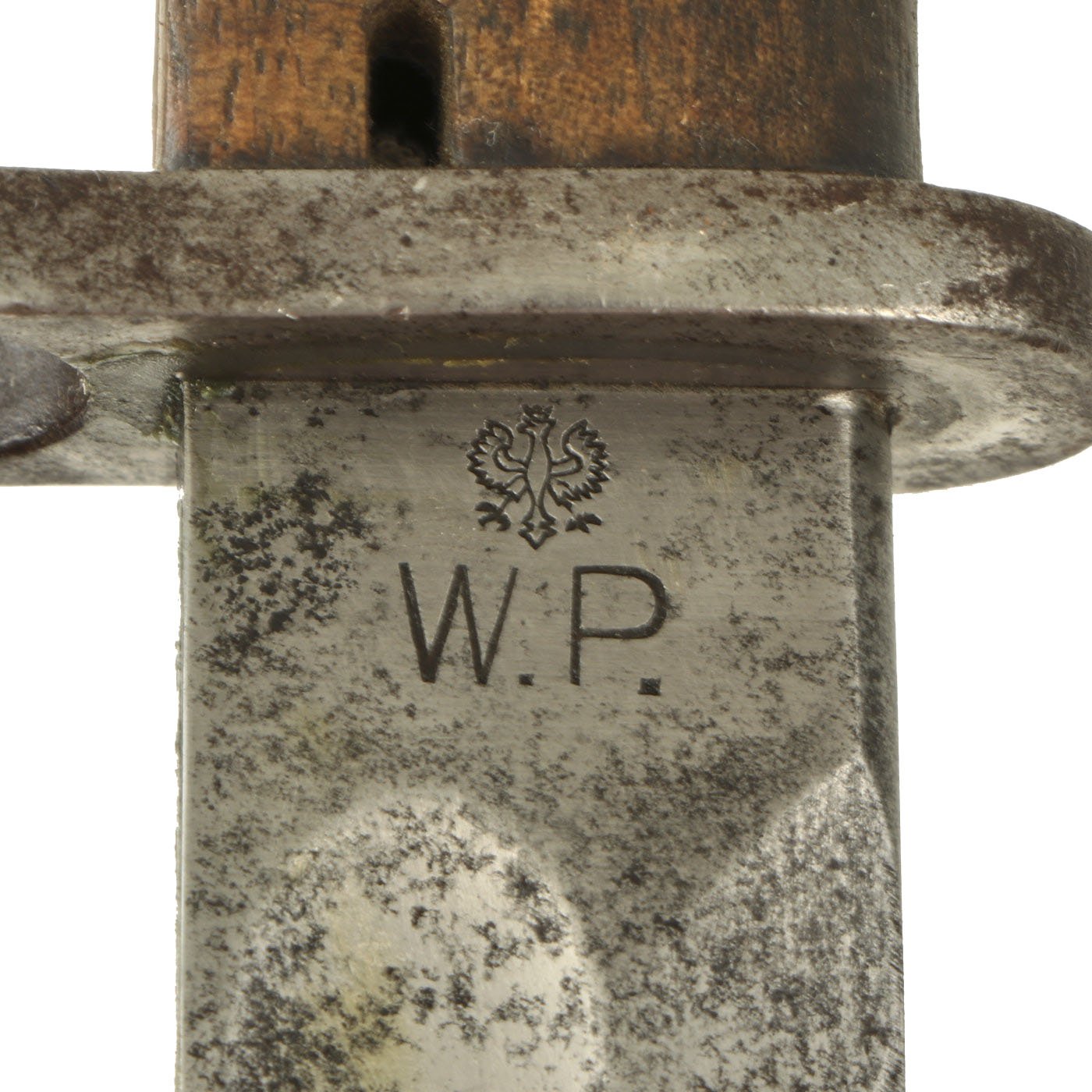 This example is marked F.B. / RADOM on the bayonet ricasso, for Fabryka Broni Radom (Weapons Factory Radom), the largest producer of arms in Poland. The reverse ricasso bears the Polish double headed eagle proof mark and the letters W.P. (Wojsko Polskie = Polish Army). This very rare example is fitted with a muzzle ring, which was only featured on the Pre-War M1930 version of the bayonet. Earlier and Mobilization issue bayonets had a cut off muzzle ring, similar to the German k98k bayonet. Additionally, many of the M1930 version were later modified by removing the ring.