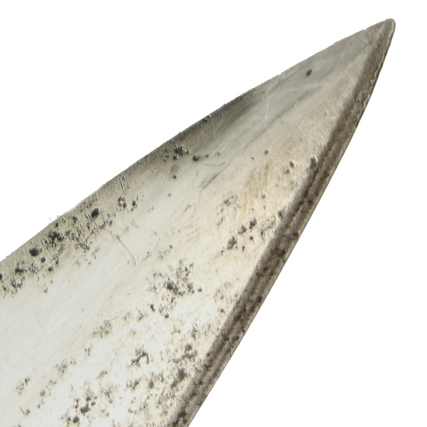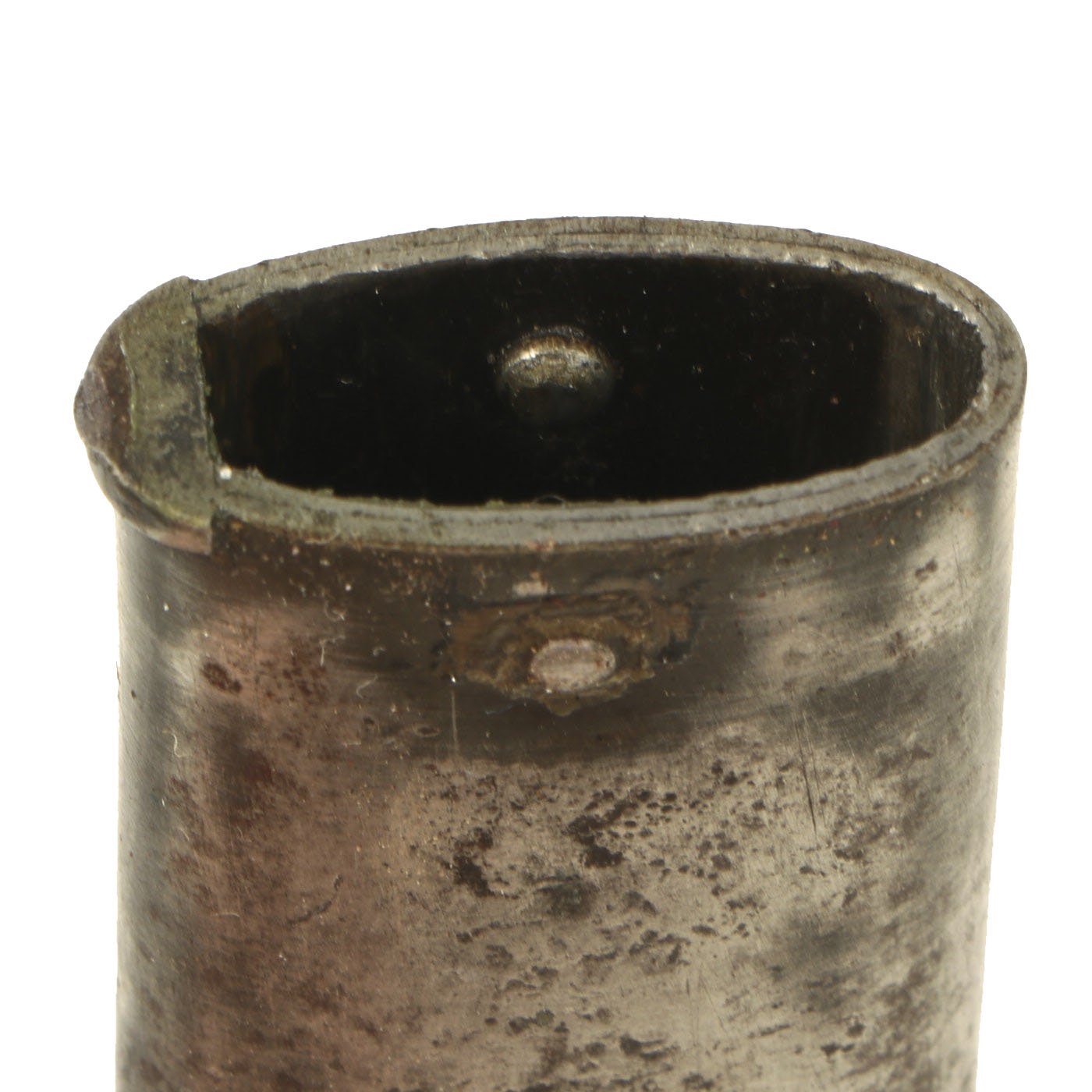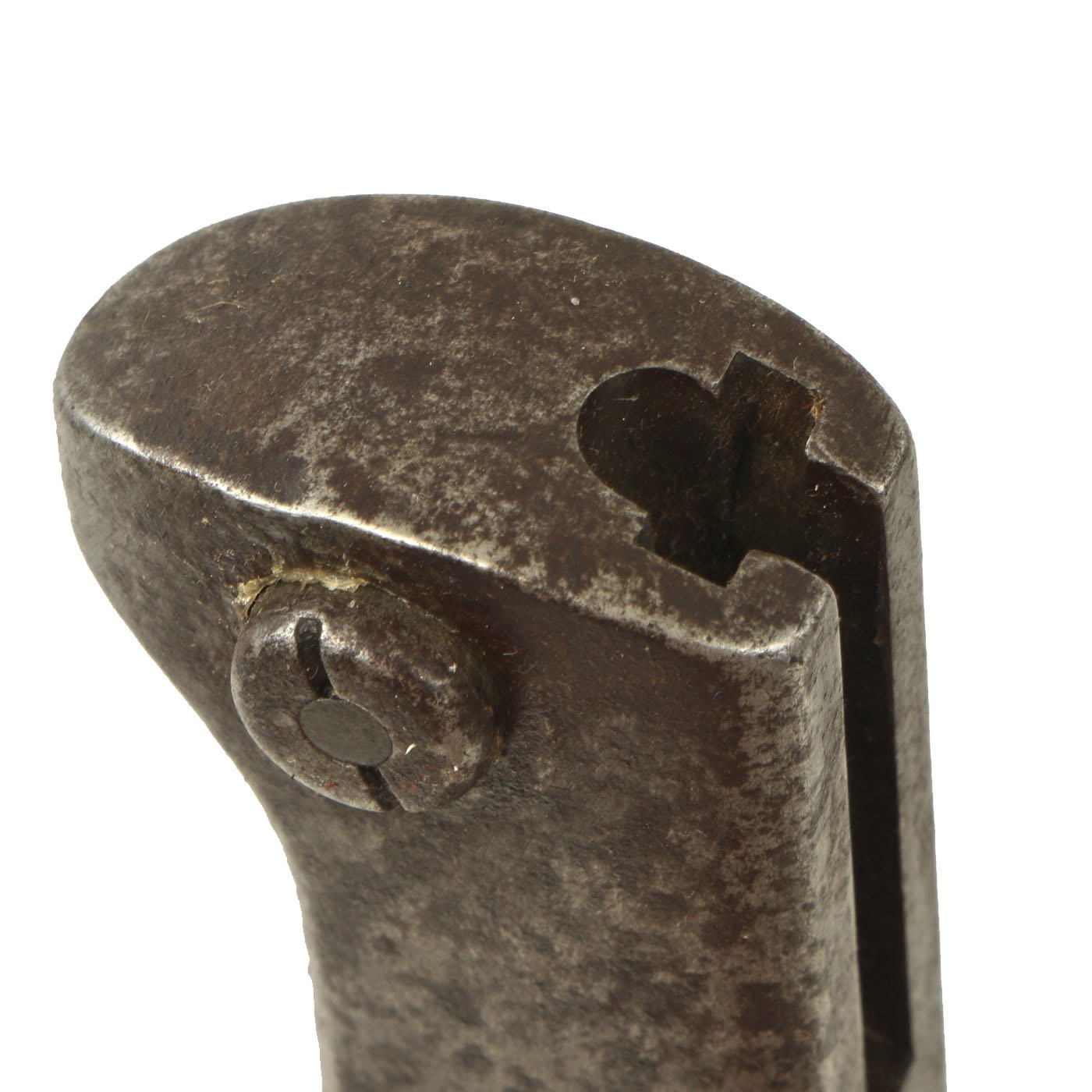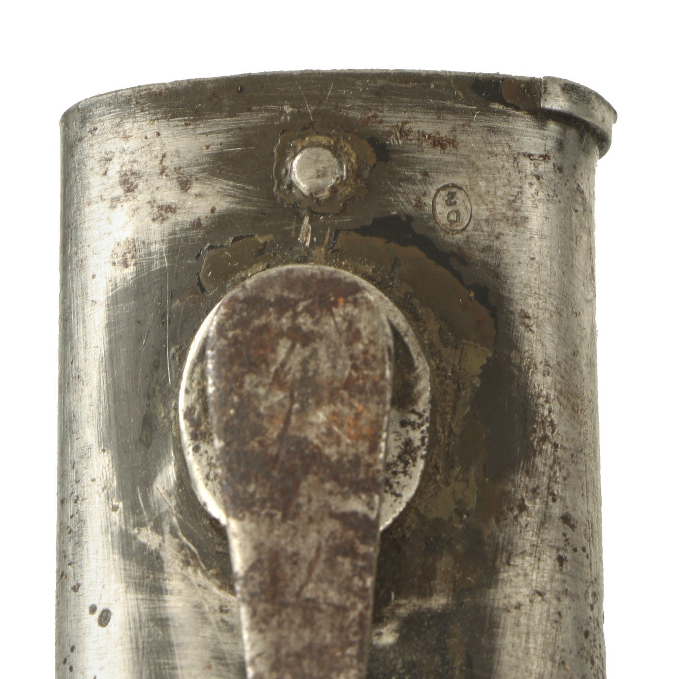 The bayonet is not fitted with a flash guard and has a 9.85" bright steel blade with a fuller down each side, and has the original bolt retained wooden grips. The bayonet catch is functional, and overall it is in good service used condition. Many of these were refinished in black after capture by German forces, but this example was definitely not refinished, though the bright steel is now stained in many areas. It comes with an original scabbard, which is in similar condition, with a stained steel patina as shown.