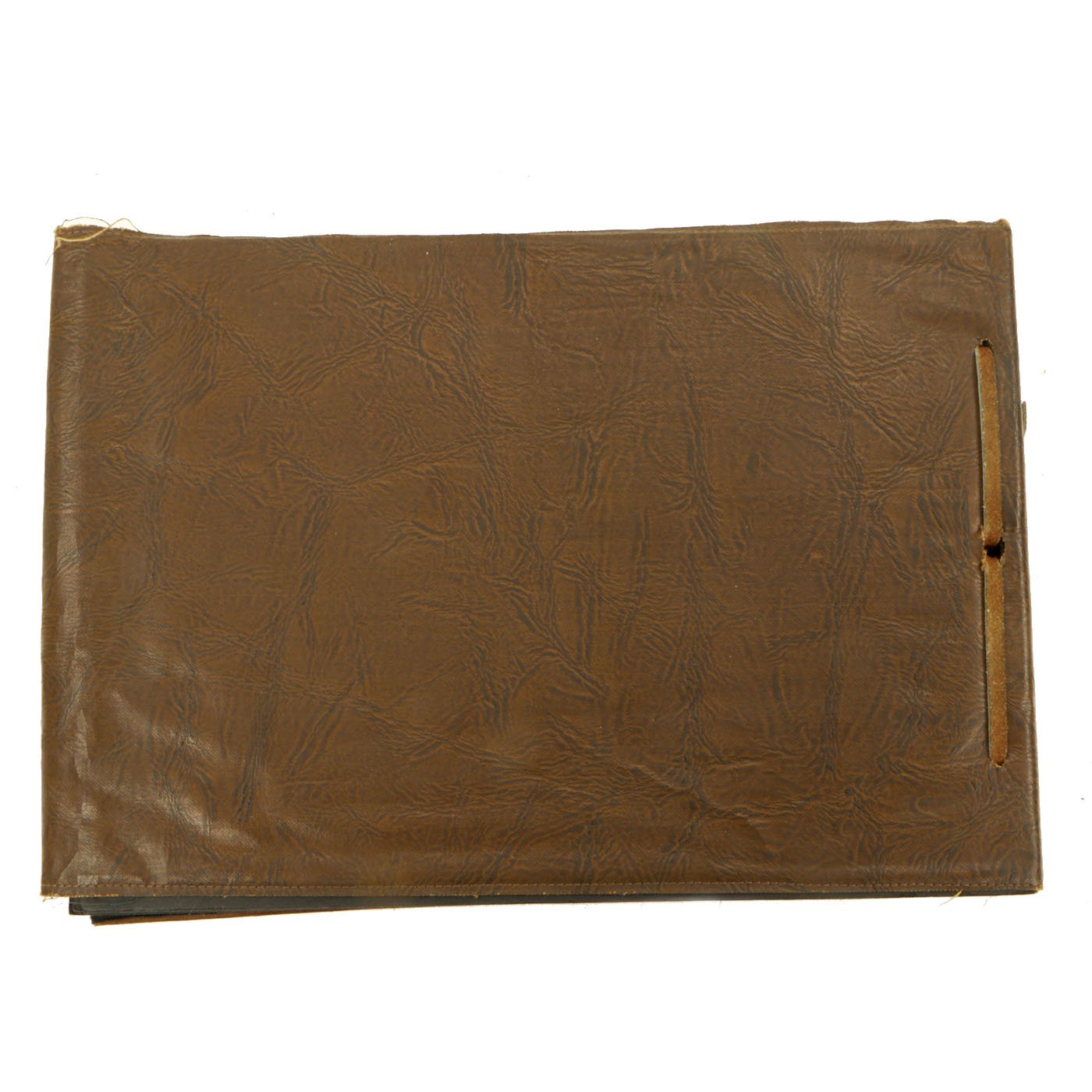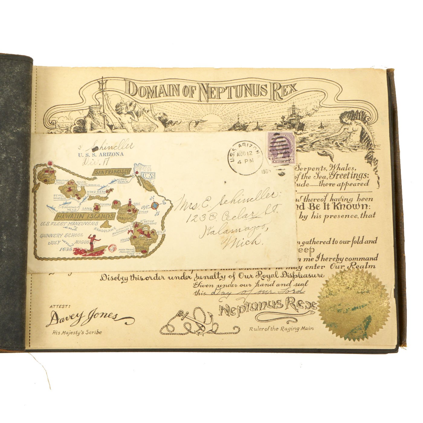 Original Item: One of a Kind. Pre-WWII Scrapbook attributed to Fireman 2nd Class Ernest Edward Schindler, who served aboard the U.S.S. Arizona in the 1930s. The leather covered album features a painted cover with a nautical theme. The first few pages inside the album are a Sailor’s Log, the first page of which is the “Domain of Neptunus Rex” Certificate, an unofficial award presented to sailors for crossing the equator. This particular award was given while Schindler crossed the equator while on board the Arizona in 1936. The following pages of the sailor’s log, however, are unfortunately blank.