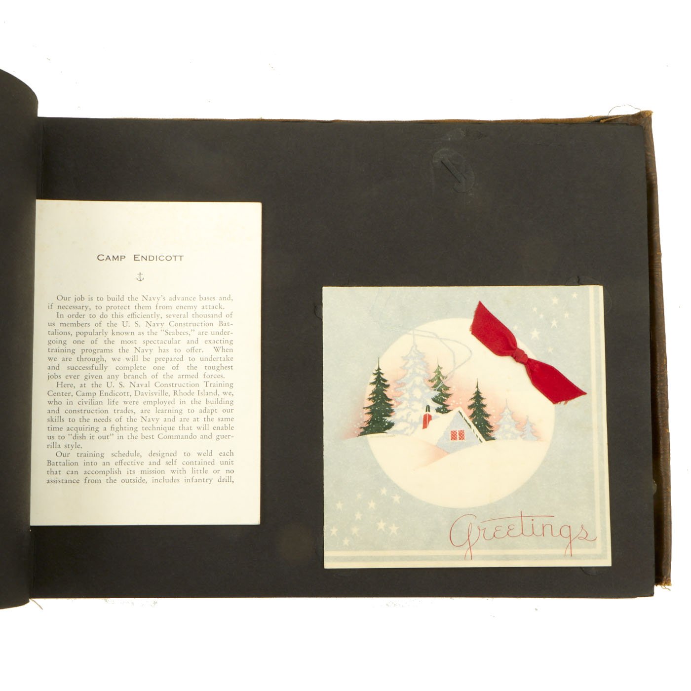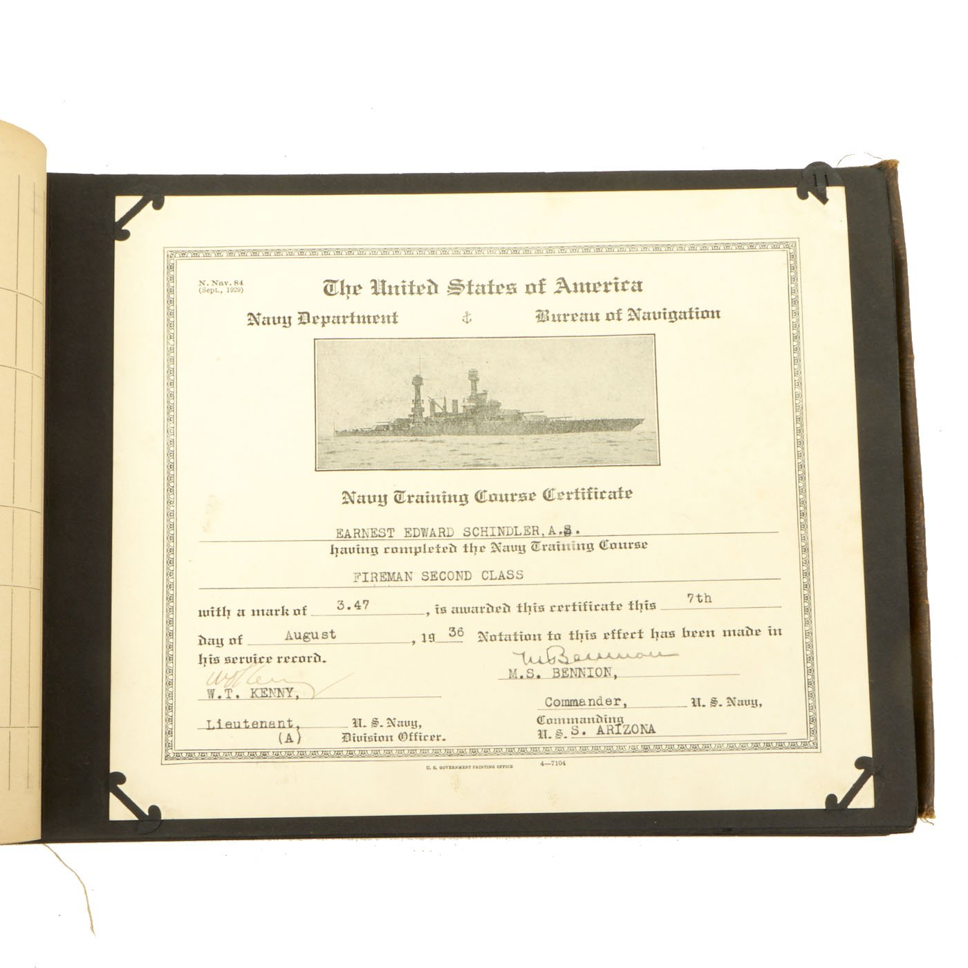 The first page of the photo album section has affixed inside Schindler’s Navy Training Certificate for completing his Fireman Training Course. The document was awarded 7th August, 1936, and is signed by the Commander of the U.S.S. Arizona, Mervyn S. Bennion. Bennion commanded the U.S.S. West Virginia on December 7, 1941 and was Killed In Action during the attack on Pearl Harbor. Commander Bennion was prosthumously awarded the Congressional Medal of Honor for his actions on December 7th.