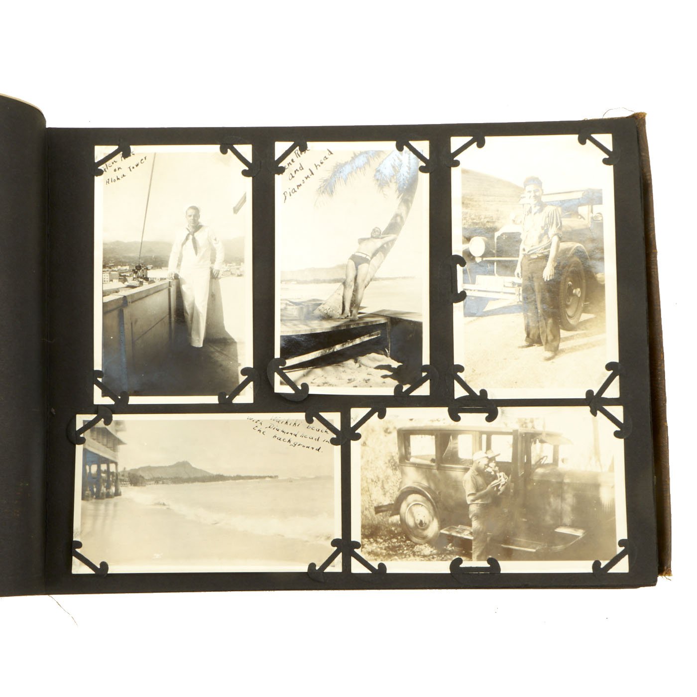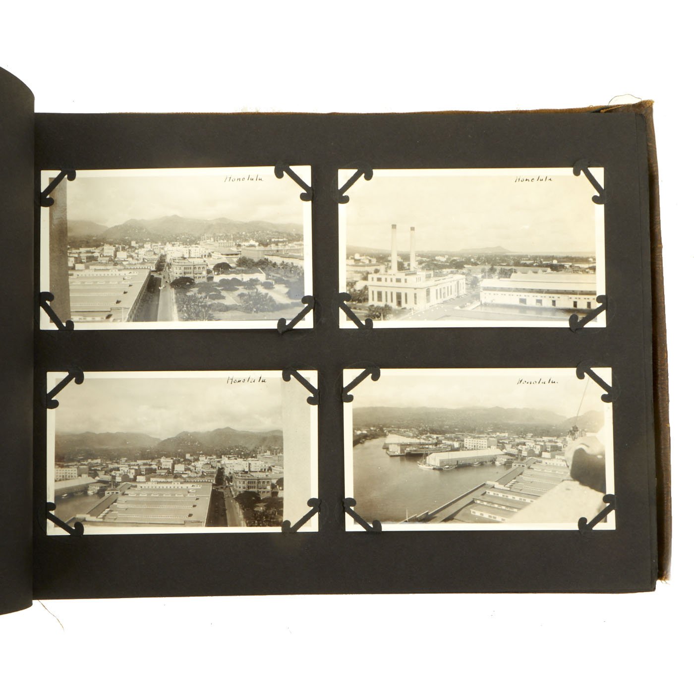 The following pages contain twenty-two photographs of sights around Waikiki, Honolulu, and of sailors on liberty in Hawaii. Three envelopes are contained in the album, two of which bear U.S.S. Arizona return addresses, and U.S.S. Arizona cancellation stamps.