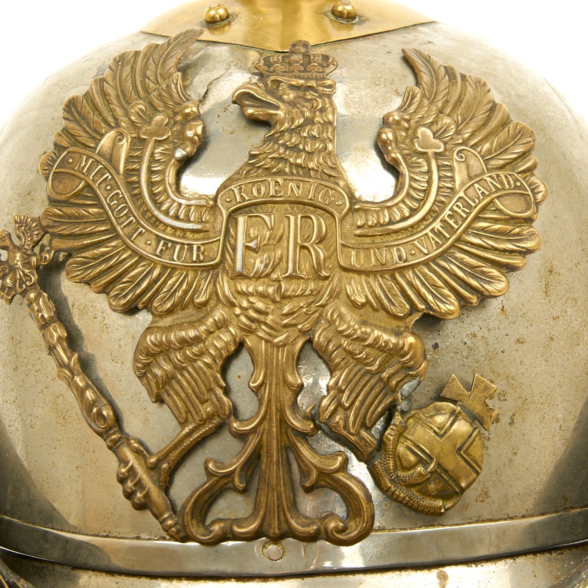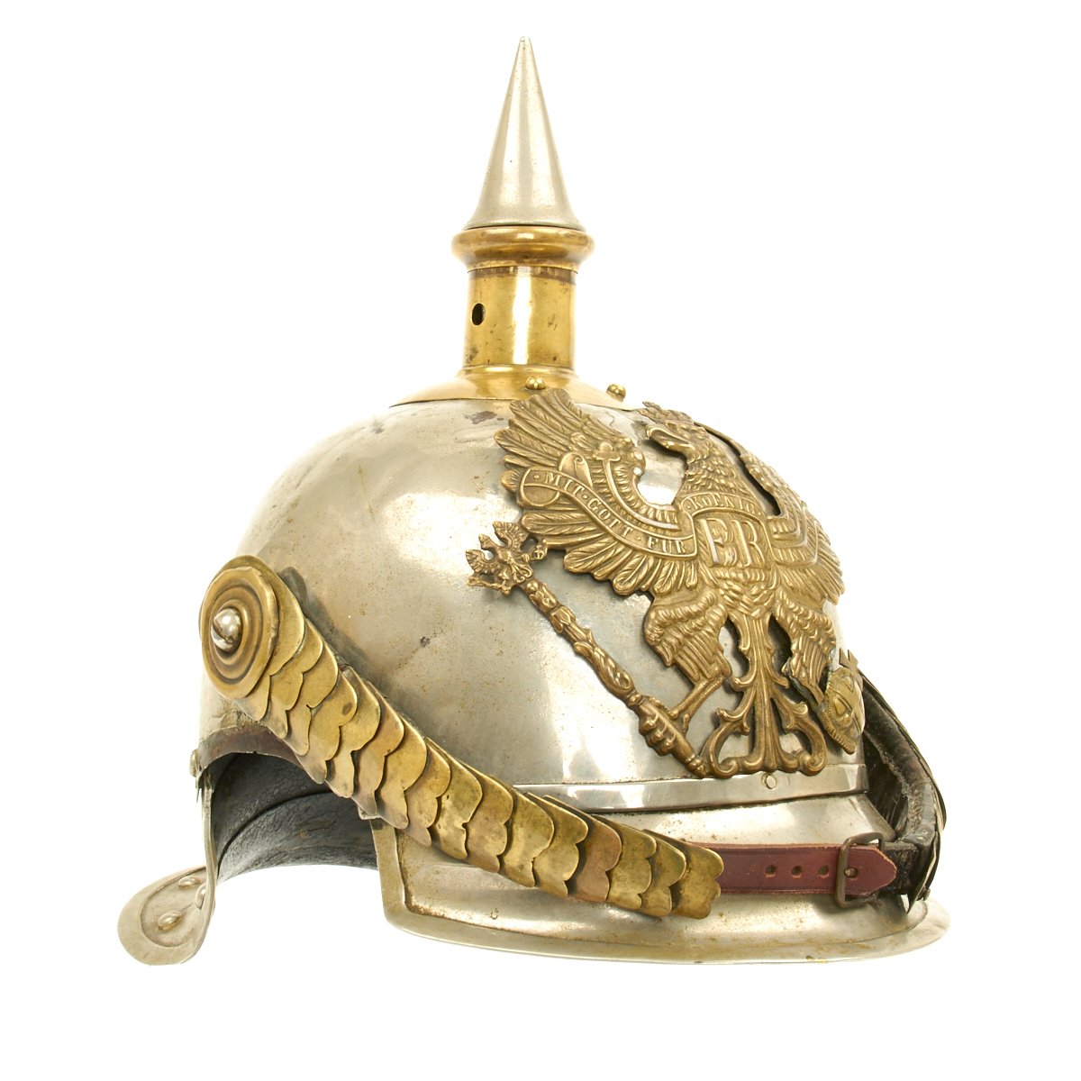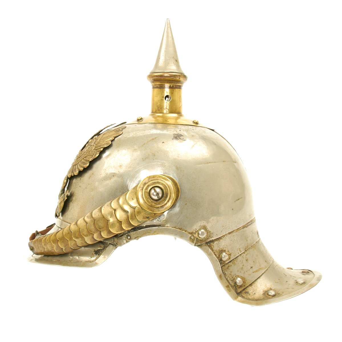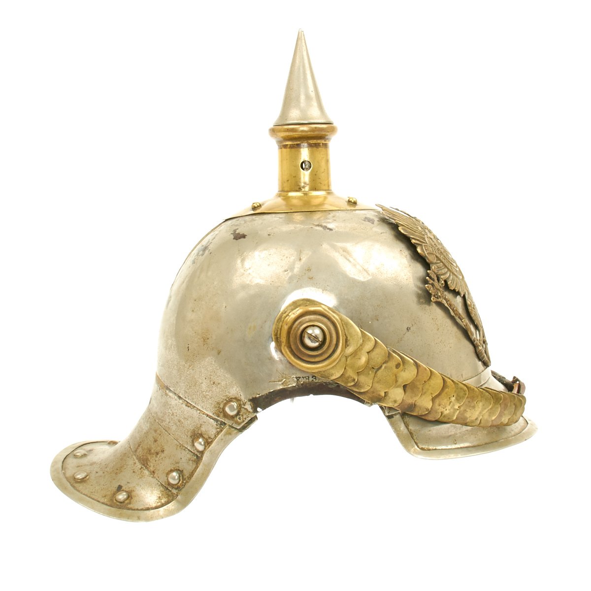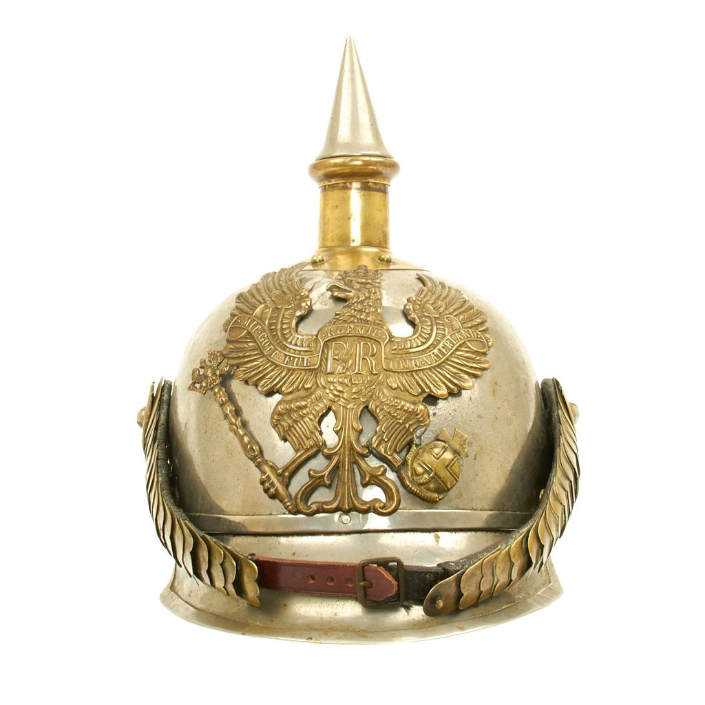 This helmet features a brass front plate (wappen) with the Prussian state eagle clutching a scepter and crown, over the King's motto, "Mit Gott Für Koenig und Vaterland" (With God for King and Country, i.e. Prussia). The crown of this leather helmet displays a vented removable nickel-plated spike. The spike is in excellent condition, and is easily removable. The helmet is also fitted with upper grade brass chin scales backed with leather, perhaps he was an N.C.O. The leather helmet liner is unfortunately absent. There are Maker's and possibly Unit markings impressed into the helmet body over each ear, which we unfortunately were not able to decypher.