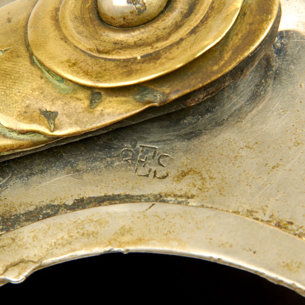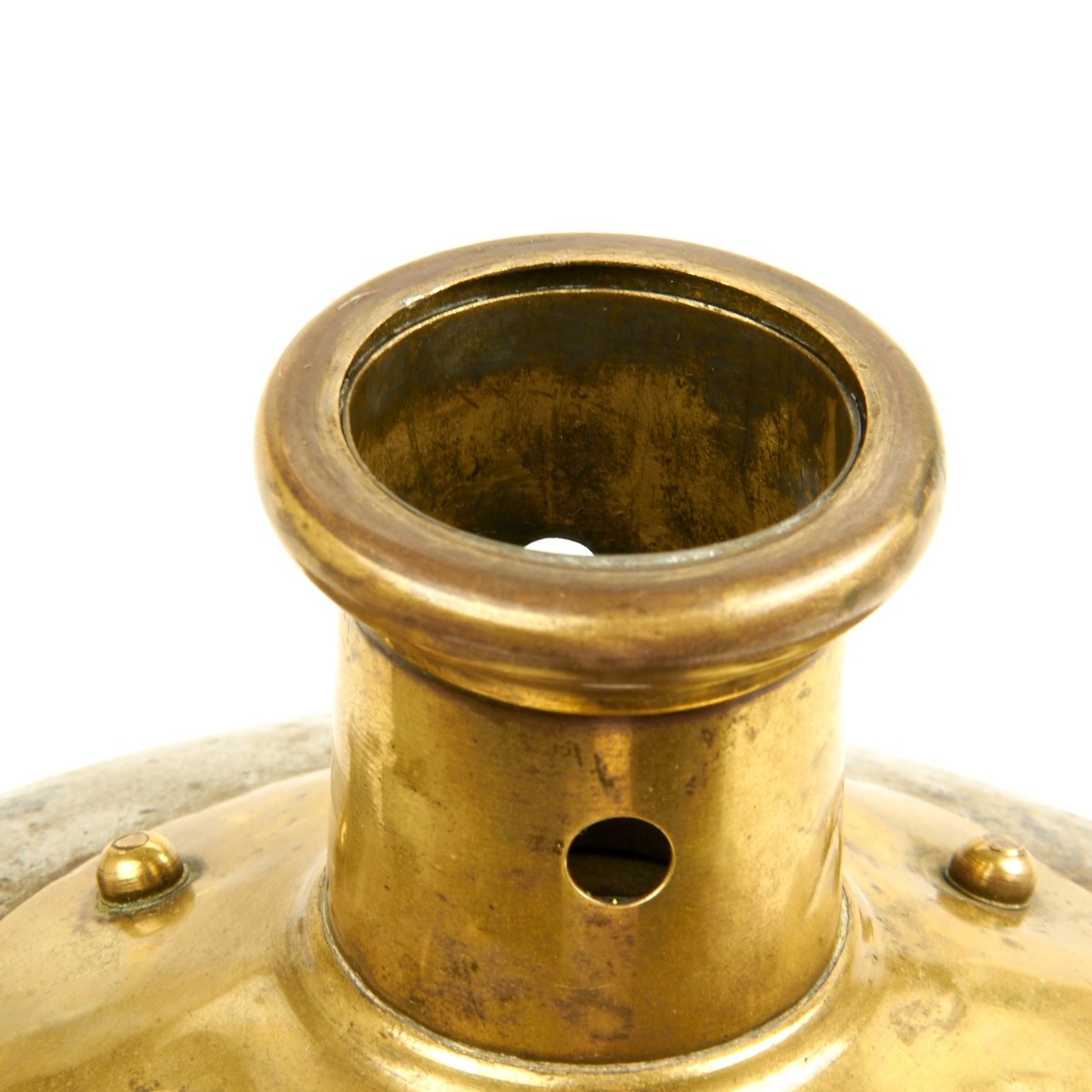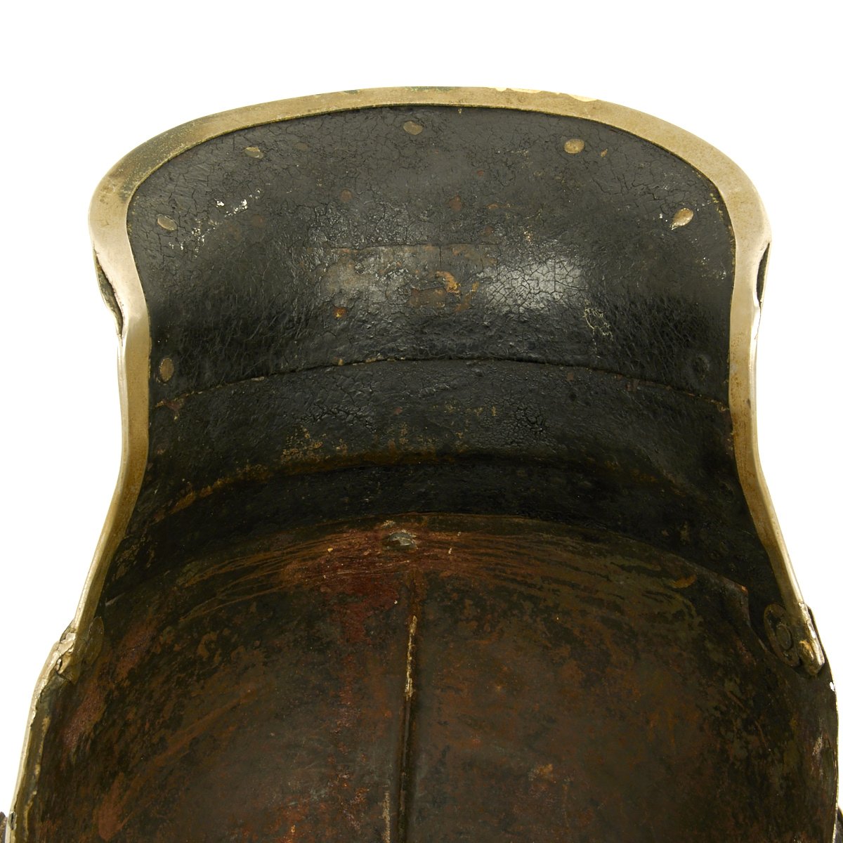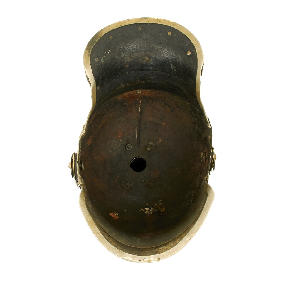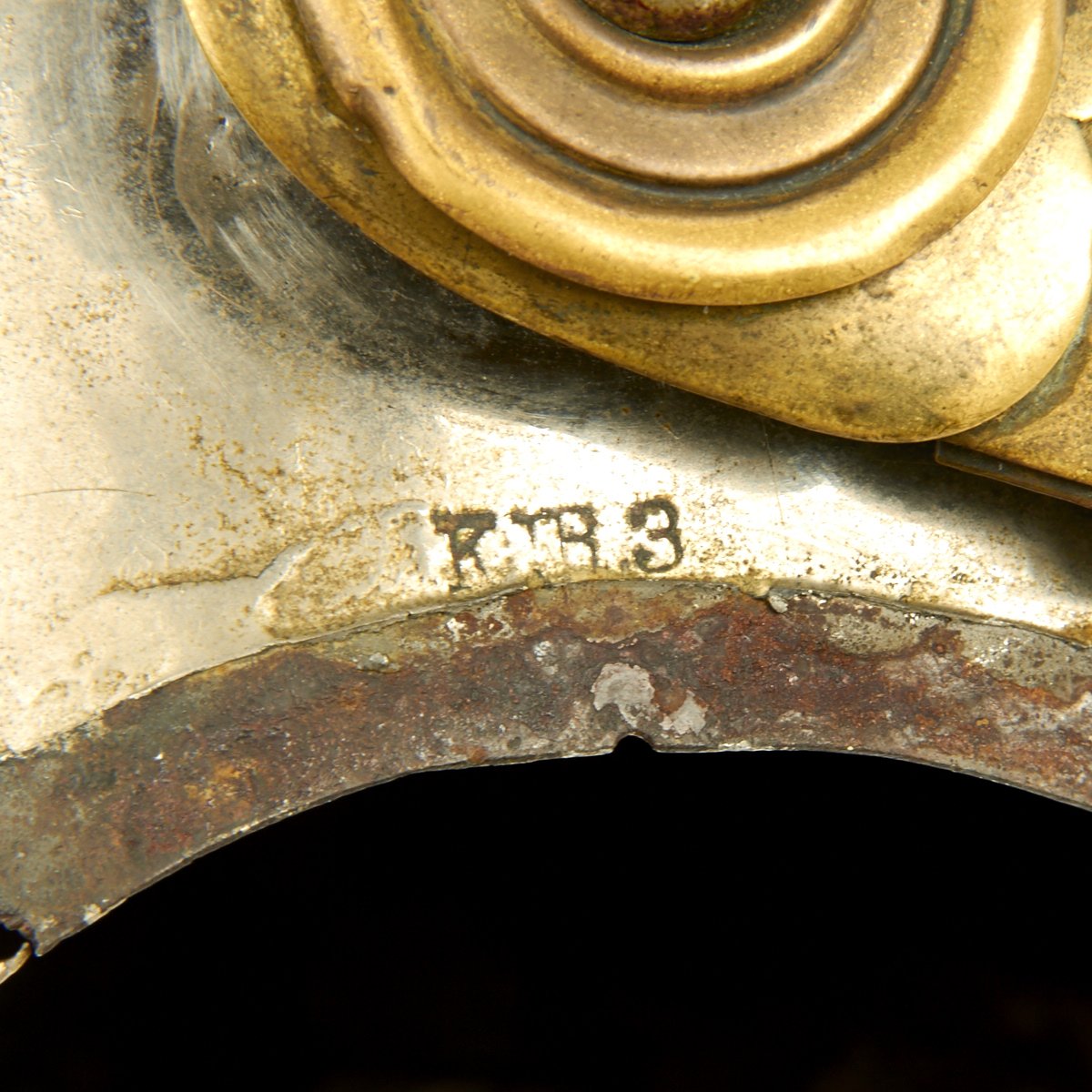 This helmet features a brass front plate (wappen) with the Prussian state eagle clutching a scepter and crown, over the King's motto, "Mit Gott Für Koenig und Vaterland" (With God for King and Country, i.e. Prussia). The crown of this leather helmet displays a vented removable nickel-plated spike. The spike is in excellent condition, and is easily removable. The helmet is also fitted with upper grade brass chin scales backed with leather, perhaps he was an N.C.O. The leather helmet liner is unfortunately absent. There are Maker's and possibly Unit markings impressed into the helmet body over each ear, which we unfortunately were not able to decypher.