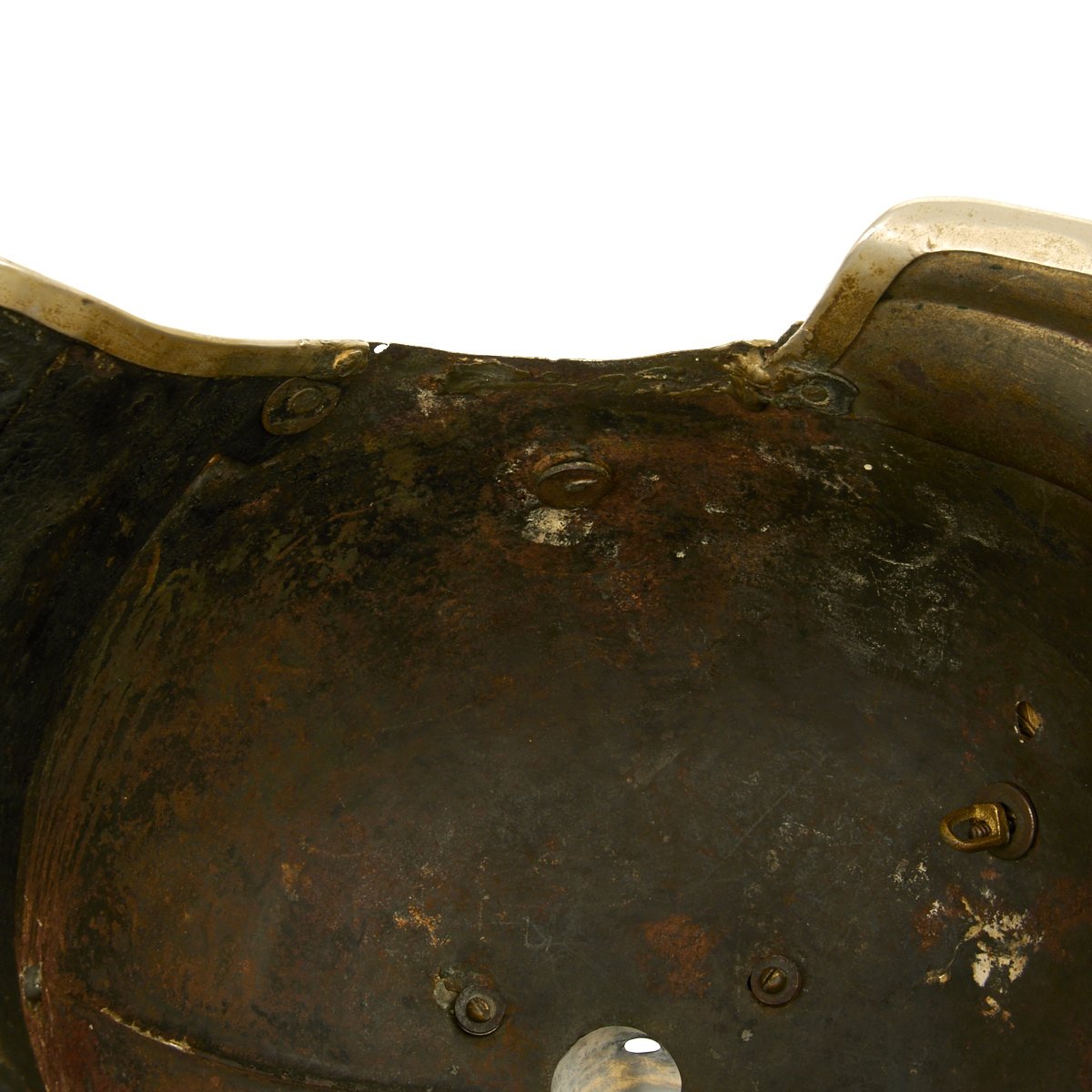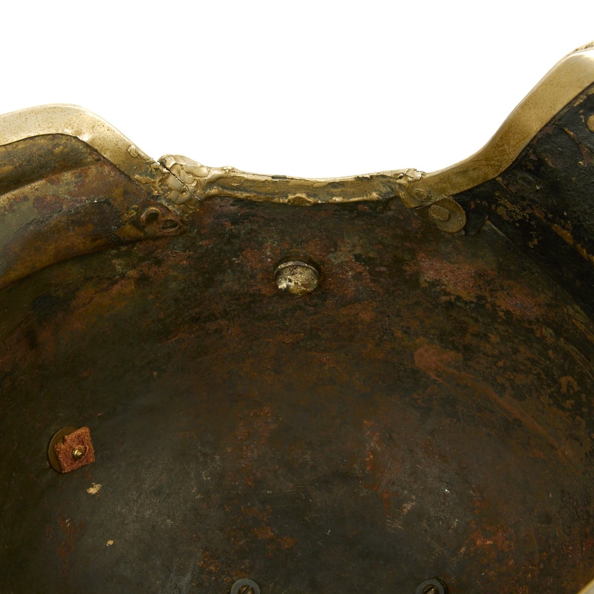 Original Item: Only One Available. This is a very nice example of a Prussian M1867 Kürassier Metalhelme, or Cuirassier Metal Helmet. It differed from the earlier Model of 1862 in that it has a metal strip connecting the front and rear visor, though in this example the right side piece has been knocked off. Cuirassiers were a type of Heavy Cavalry, equipped with armor and firearms, and the Prussian groups wore all metal spiked helmets such as this one. The early examples from the Franco Prussian War of 1870/71 had "stepped" front peak. The helmet itself is nickel plated steel with mounts of brass.