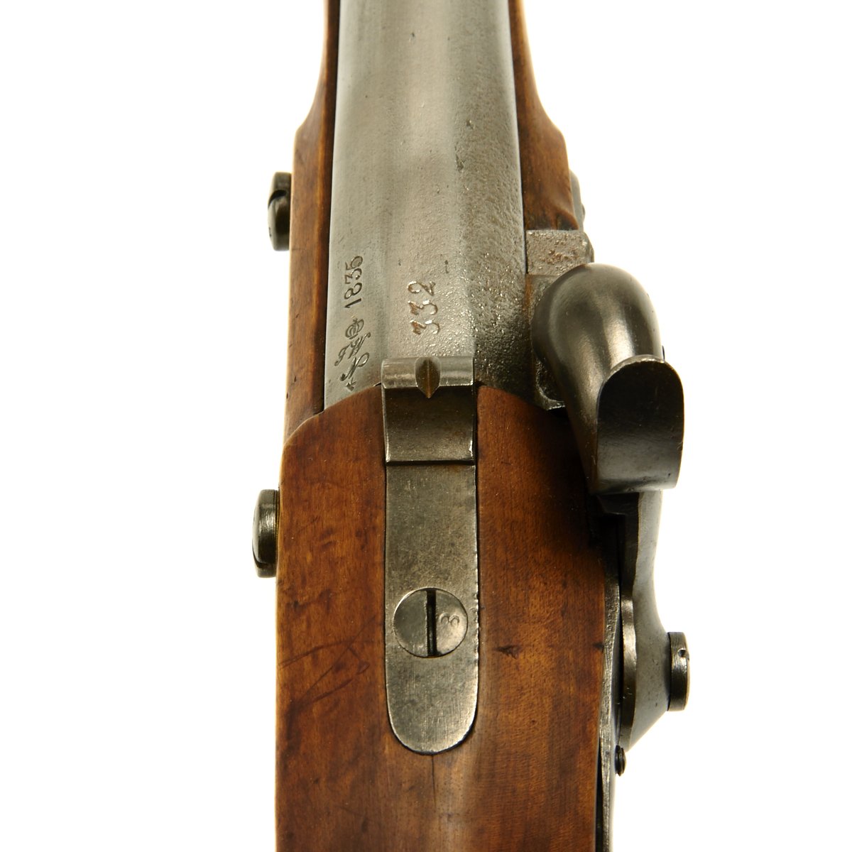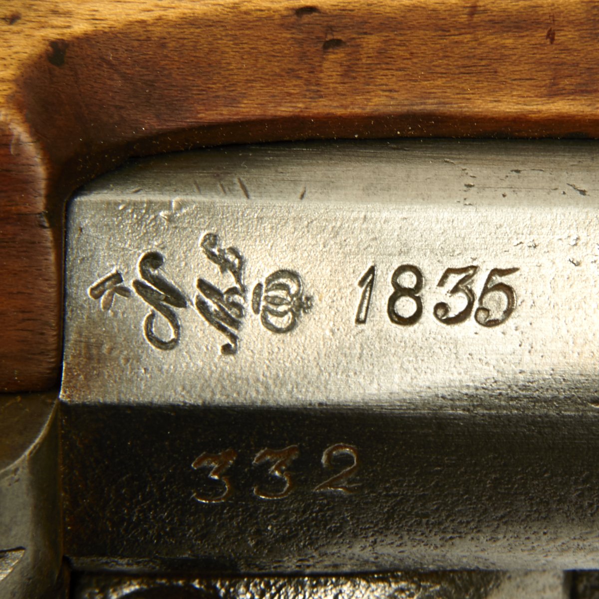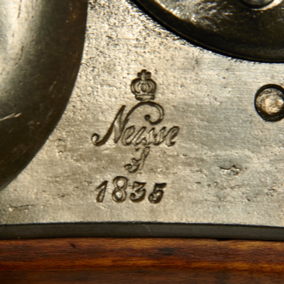 Original Item: Only One Available. Original Prussian .75" (17mm) smoothbore musket marked with a Crown over NEISSE 1835 on the lock plate and again on the barrel. The brass butt plate is regimentally marked 23 .L.W.R.