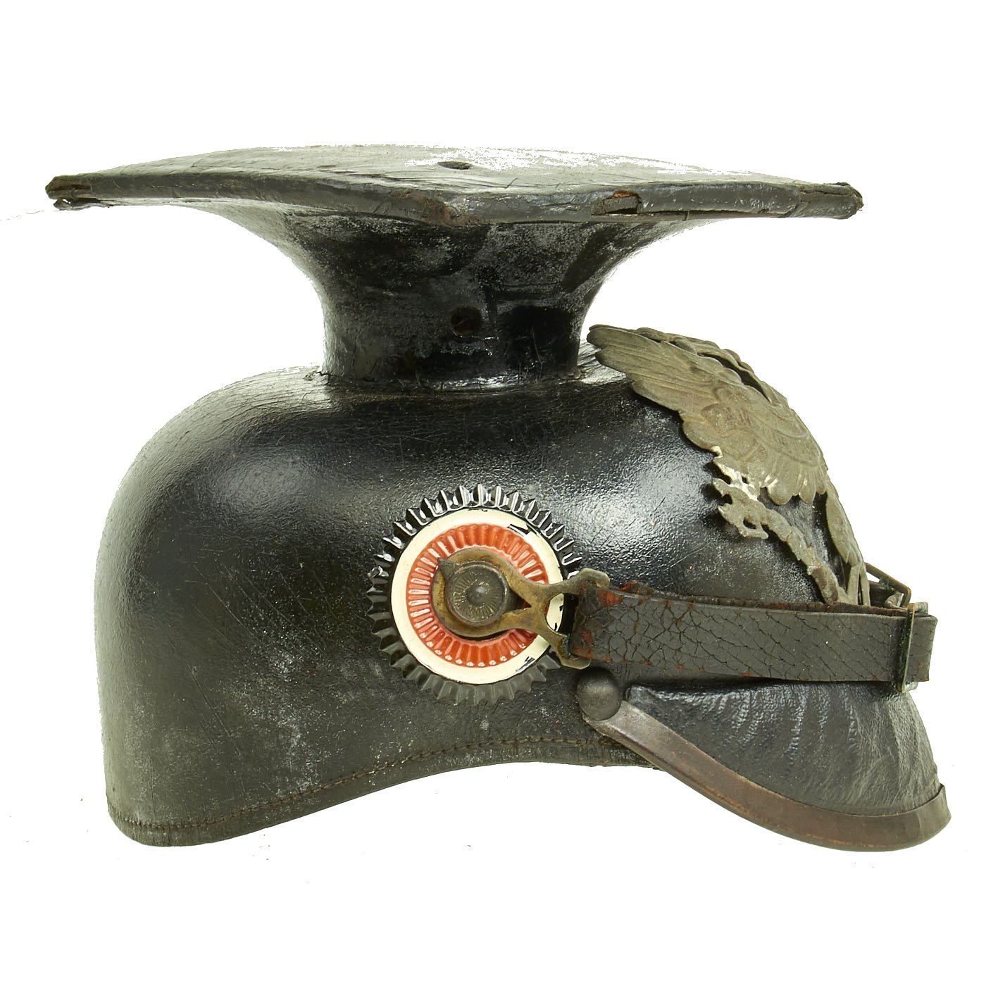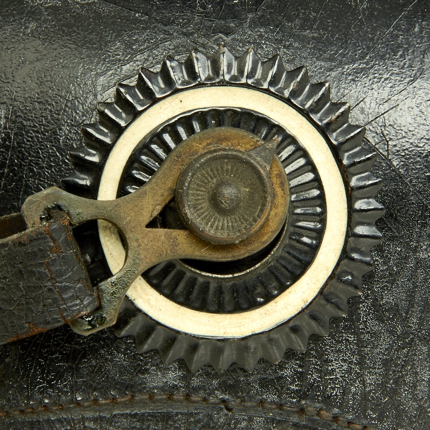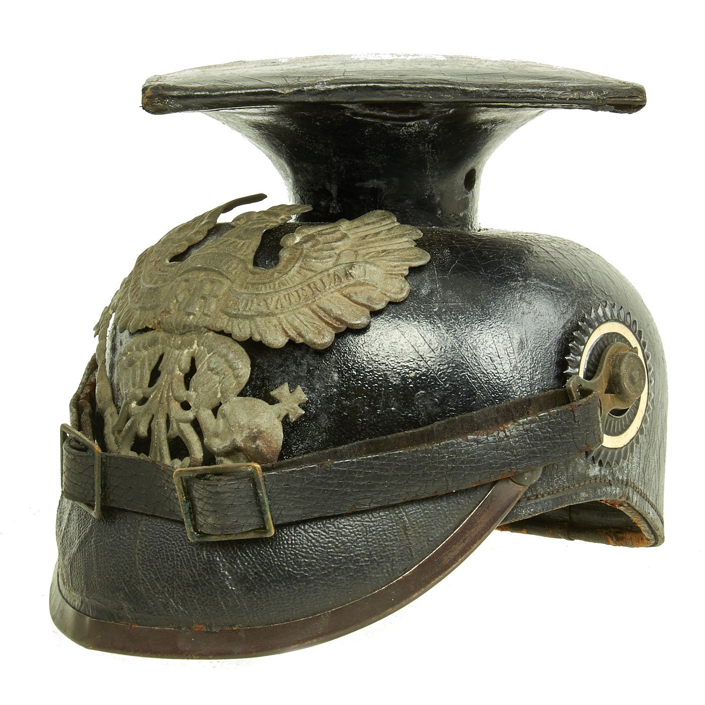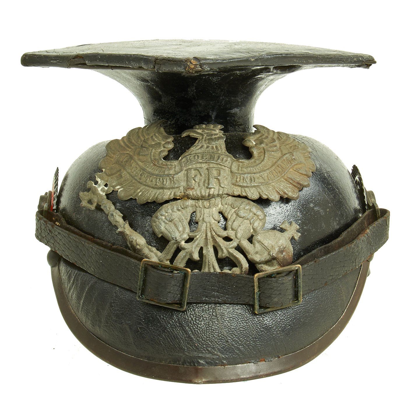 This M1867 / 94 Preußen Mannschaften (Other Ranks) Tschapka with brass fittings. Nice original Wappen. Retains original and leather chinstrap. It is complete with the Prussian (black and white) and German National Colors (red white and black) Kokarden (cockades) around the chin strap lugs. In 1897 the new Reichs-Kokarde in Red-White-Black was introduced for all ranks to commemorate the 100th anniversary of the birth of Kaiser Wilhelm 1st. The Reichs-Kokarde was to be worn on the right side of the helmet, and the state Kokarde was moved to the left, as on this helmet.