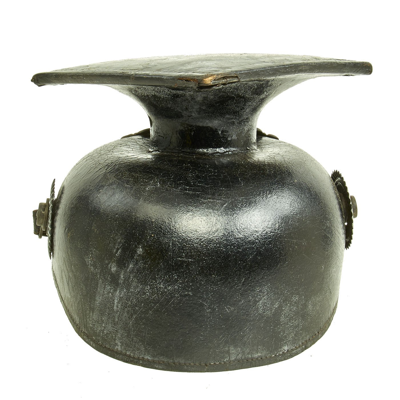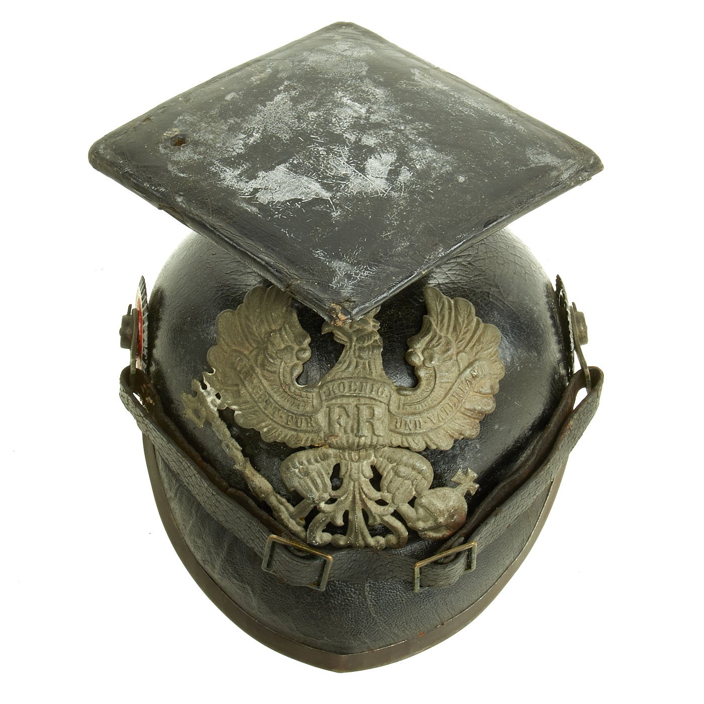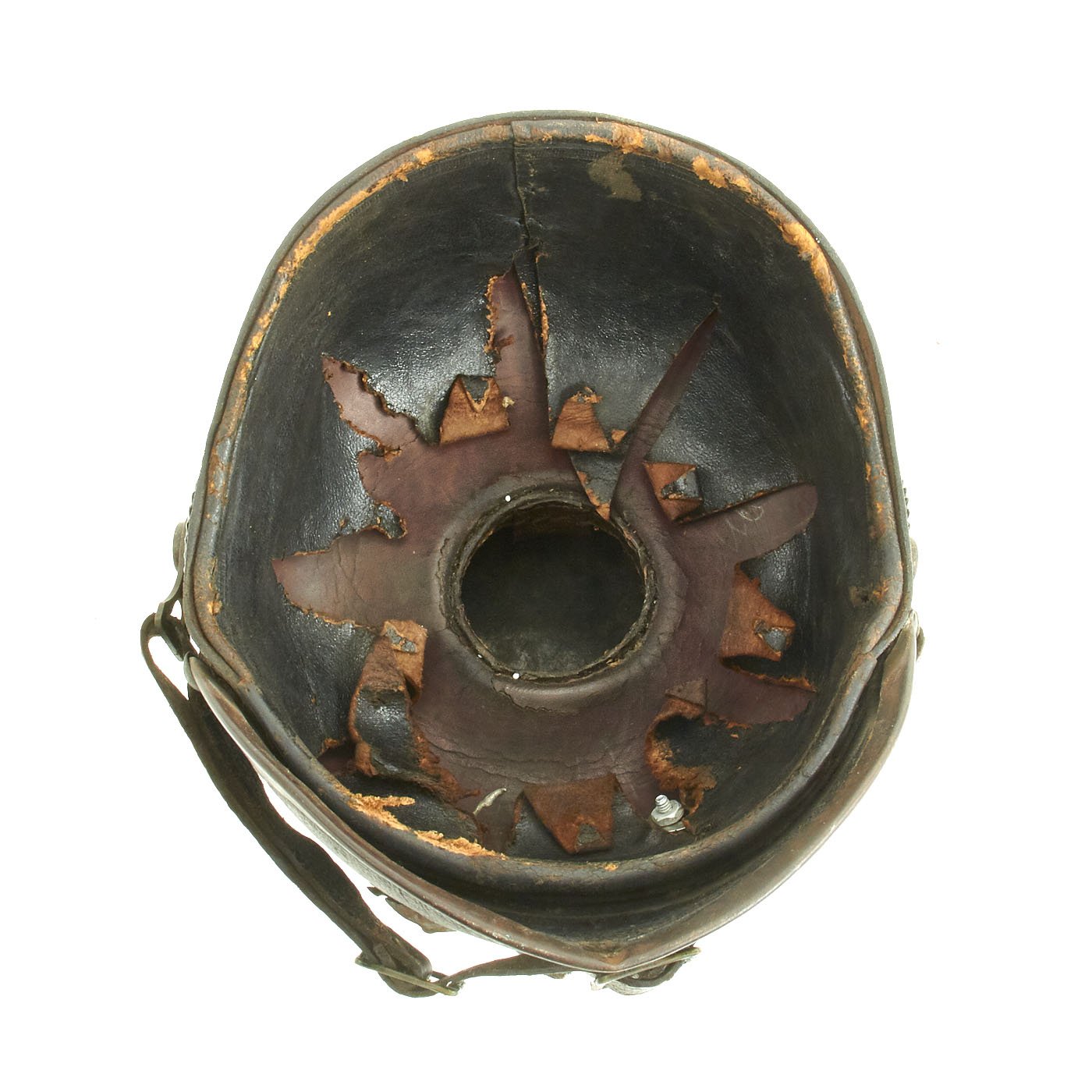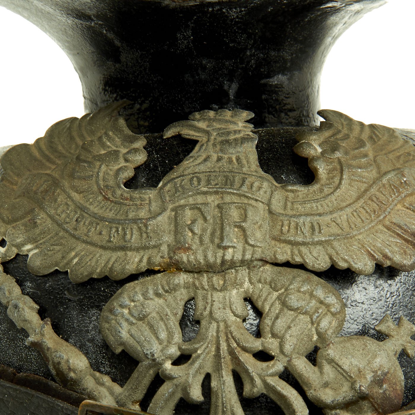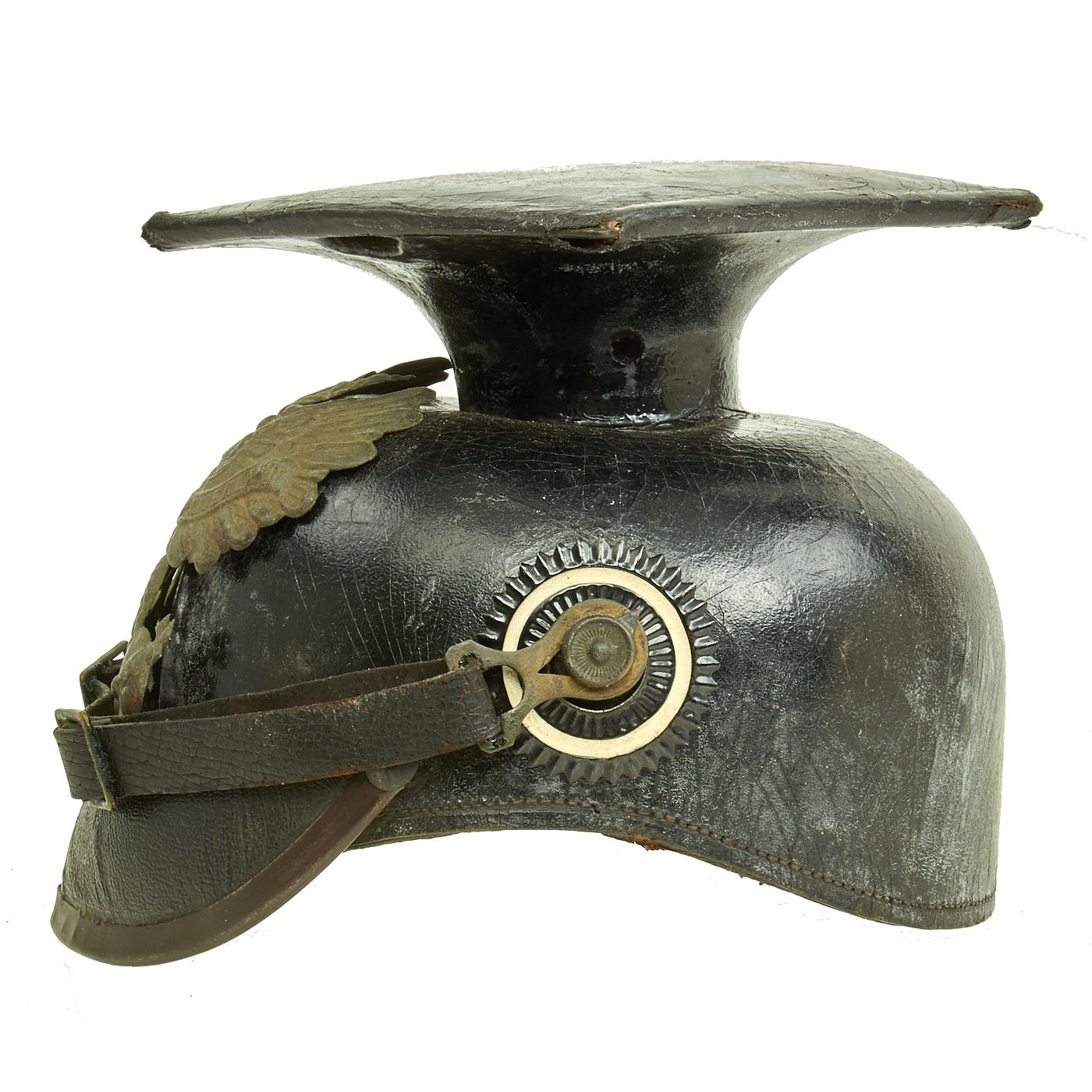 This M1867 / 94 Preußen Mannschaften (Other Ranks) Tschapka with brass fittings. Nice original Wappen. Retains original and leather chinstrap. It is complete with the Prussian (black and white) and German National Colors (red white and black) Kokarden (cockades) around the chin strap lugs. In 1897 the new Reichs-Kokarde in Red-White-Black was introduced for all ranks to commemorate the 100th anniversary of the birth of Kaiser Wilhelm 1st. The Reichs-Kokarde was to be worn on the right side of the helmet, and the state Kokarde was moved to the left, as on this helmet.