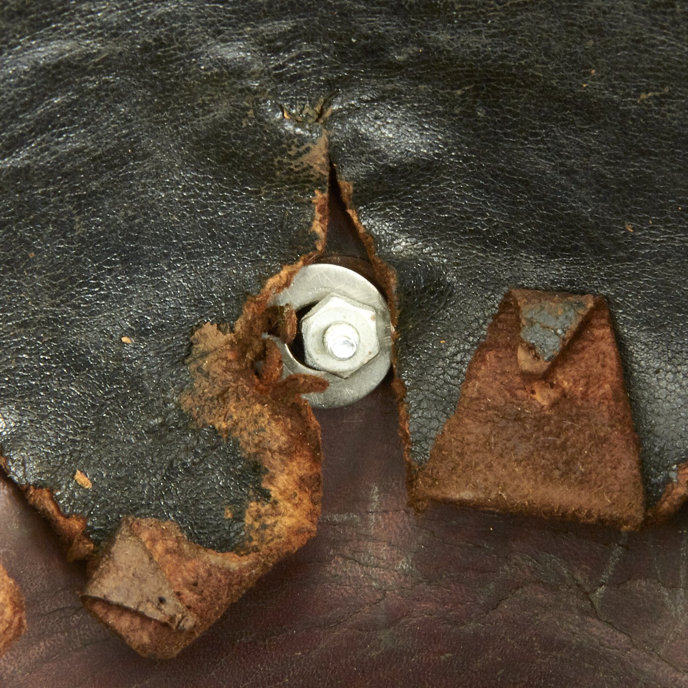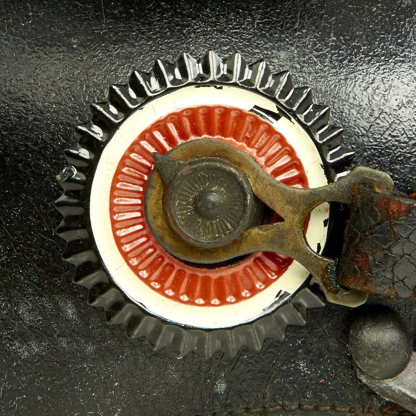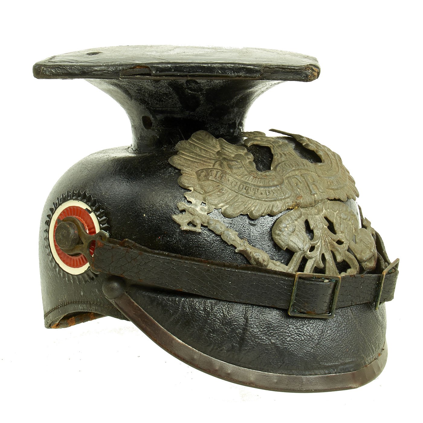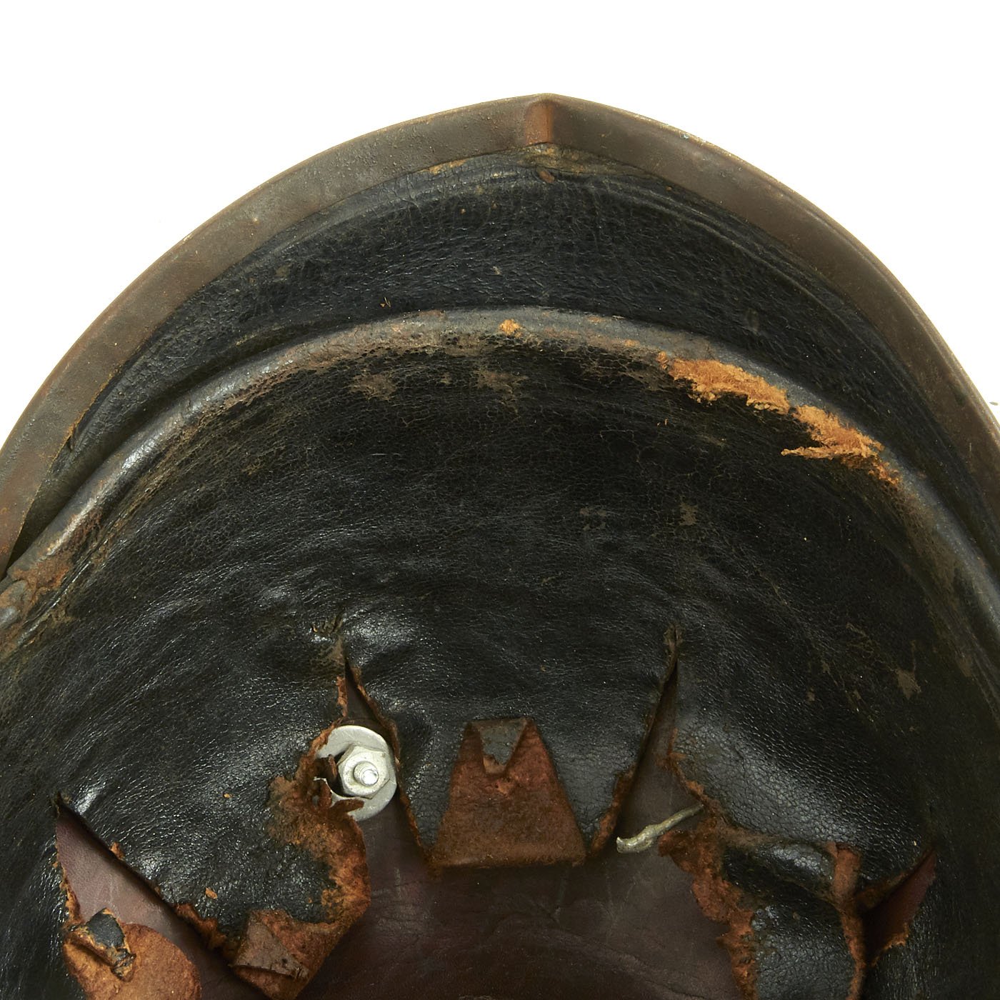 This M1867 / 94 Preußen Mannschaften (Other Ranks) Tschapka with brass fittings. Nice original Wappen. Retains original and leather chinstrap. It is complete with the Prussian (black and white) and German National Colors (red white and black) Kokarden (cockades) around the chin strap lugs. In 1897 the new Reichs-Kokarde in Red-White-Black was introduced for all ranks to commemorate the 100th anniversary of the birth of Kaiser Wilhelm 1st. The Reichs-Kokarde was to be worn on the right side of the helmet, and the state Kokarde was moved to the left, as on this helmet.