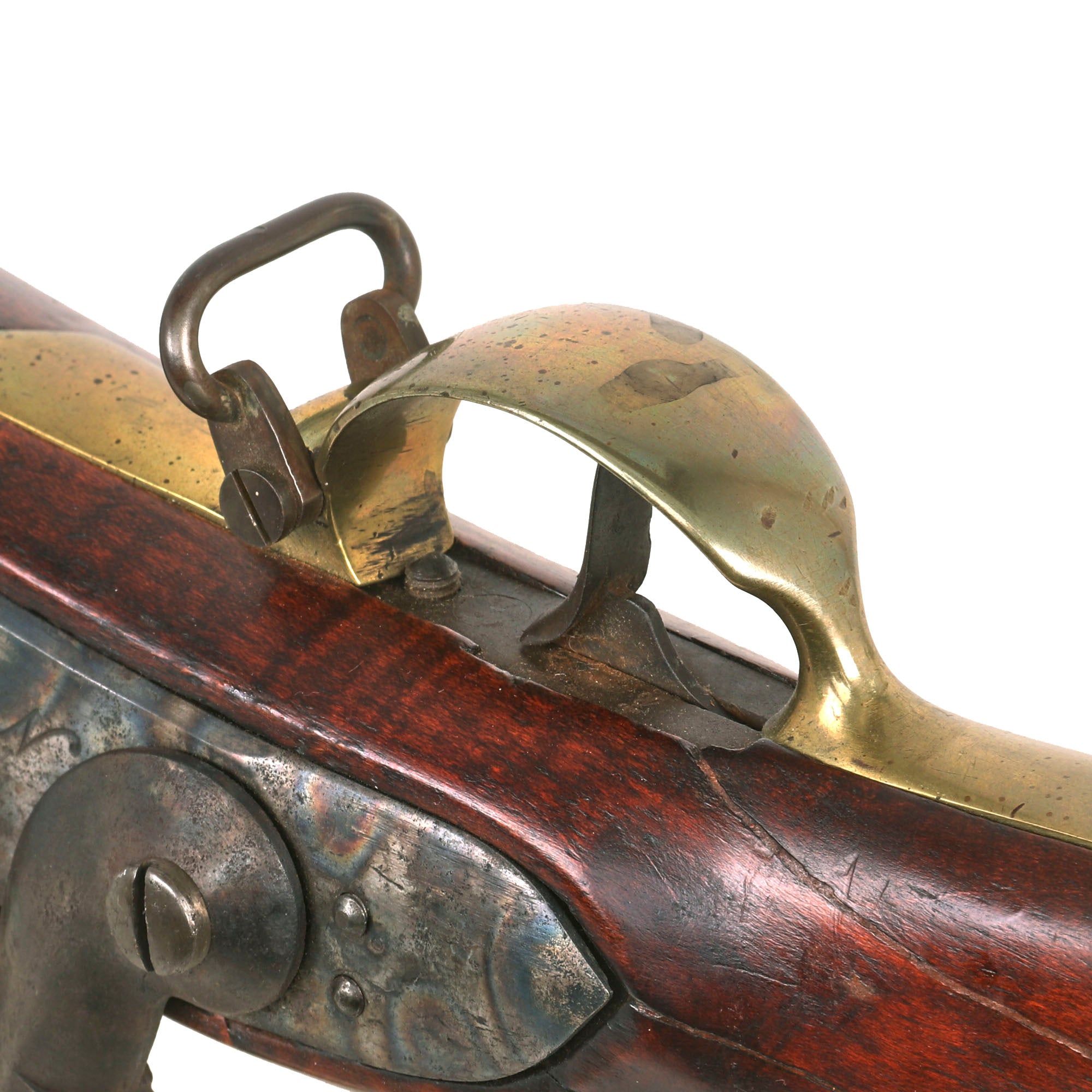 The finials of the trigger guard and the toe of the butt plate terminate in distinct three-pointed ends, correct for this model. It looks like the trigger guard rear broke away at some point, and another piece was added in its place. Black walnut stock with its recessed cheek piece is quite handsome, with a great color, and a good amount of flame figuring to the wood. There is a ramrod under the stock, but it is definitely a fabricated replacement.