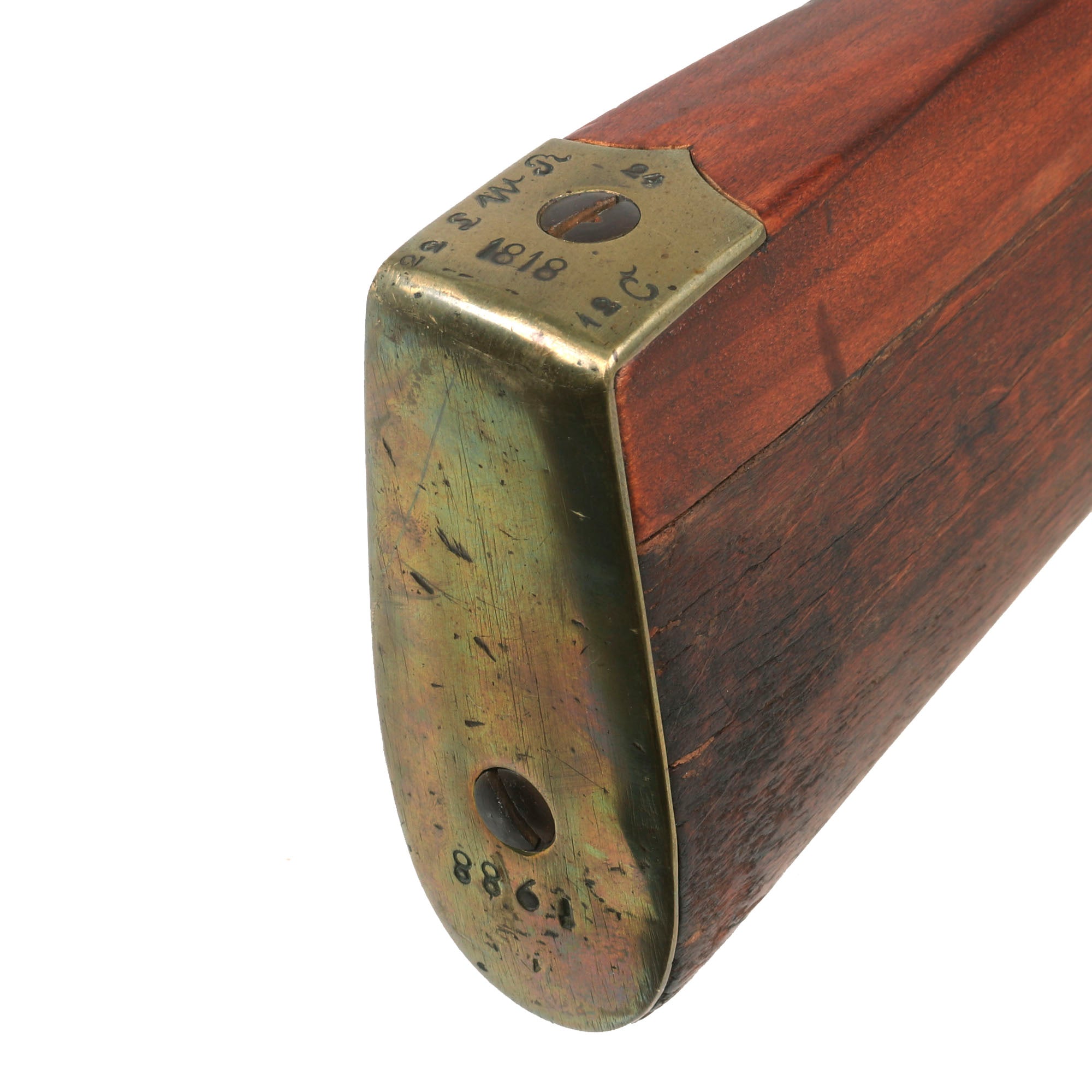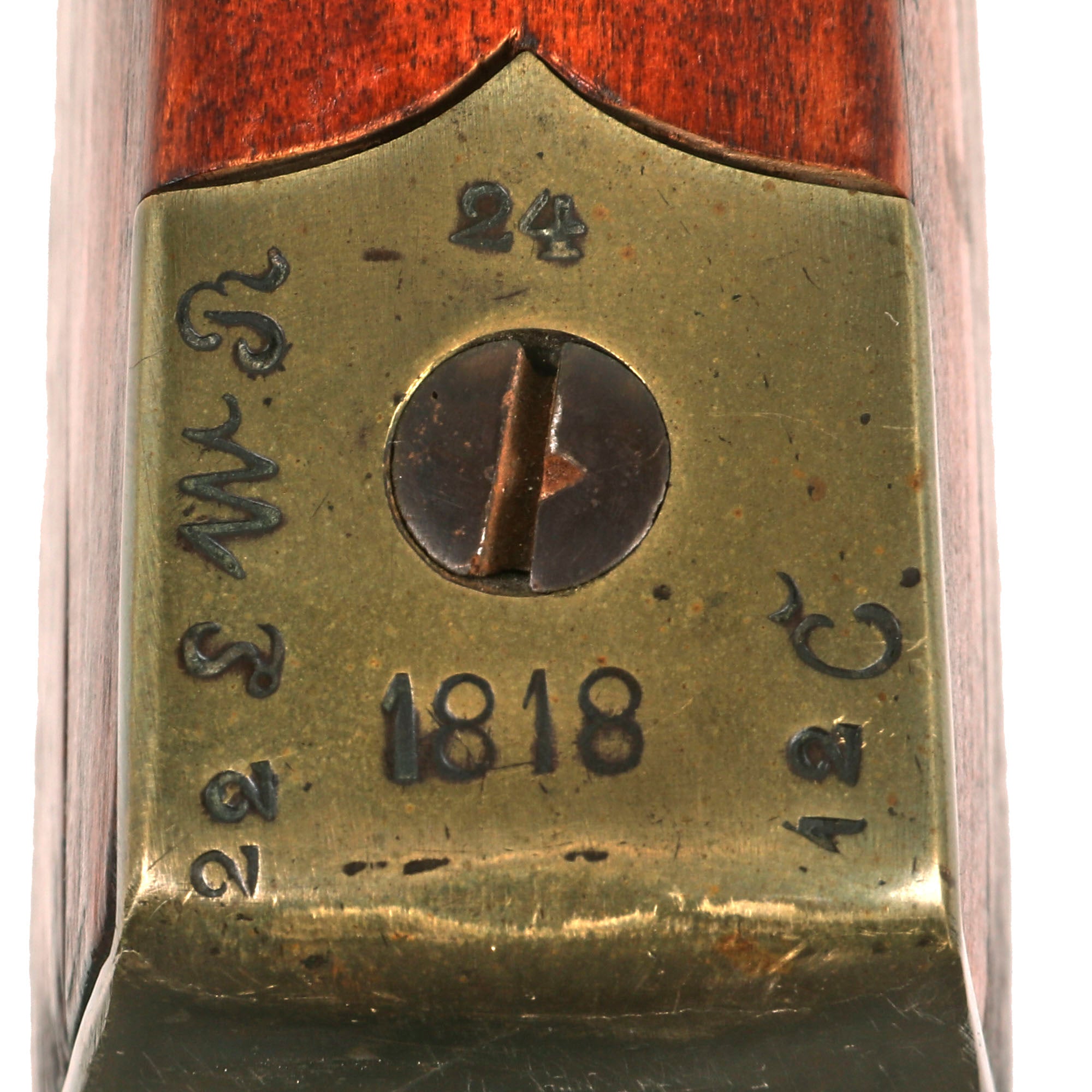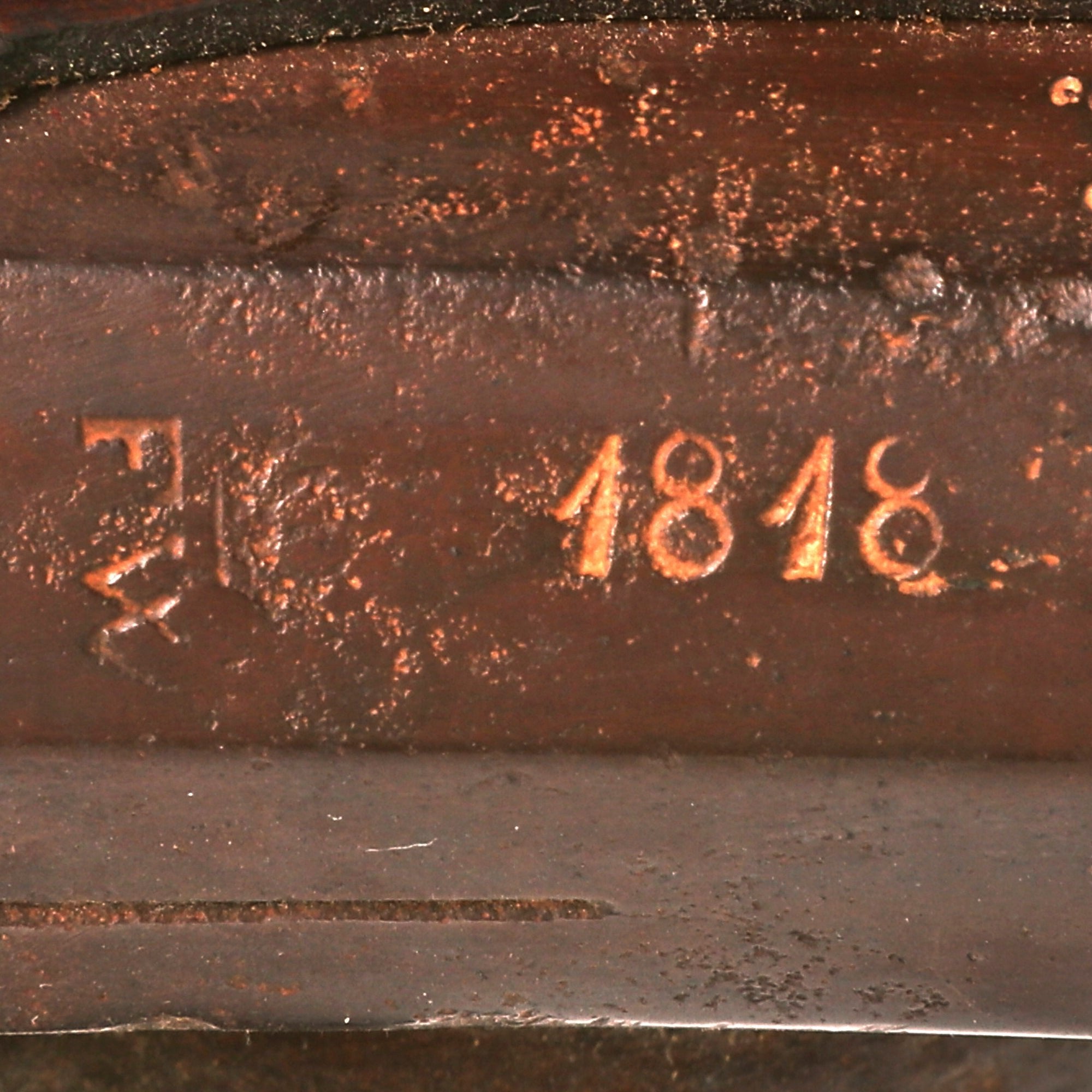The barrel nocks form features a Prussian Crown over FW monogram, for Prussian King Frederick William III, who reigned 1797 - 1840, next to a date of 1818. The musket features an iron butt plate, which is also dated 1818, matching the barrel. It also looks to be marked with 22 L W R / 12 C, a German regimental marking. There are markings stamped into the right side and bottom of the butt stock, which we are unfortunately unable to read accurately due to wear to the wood.