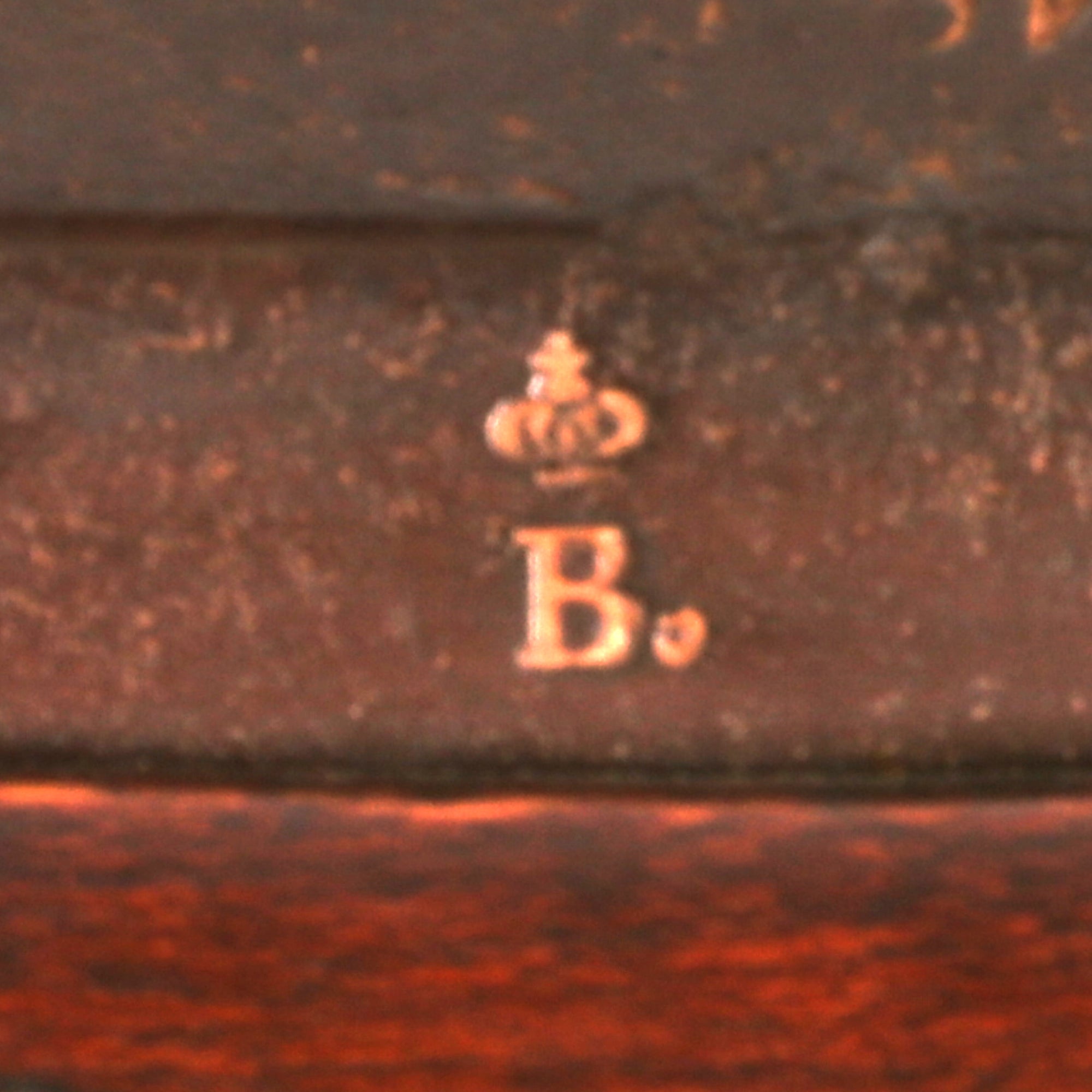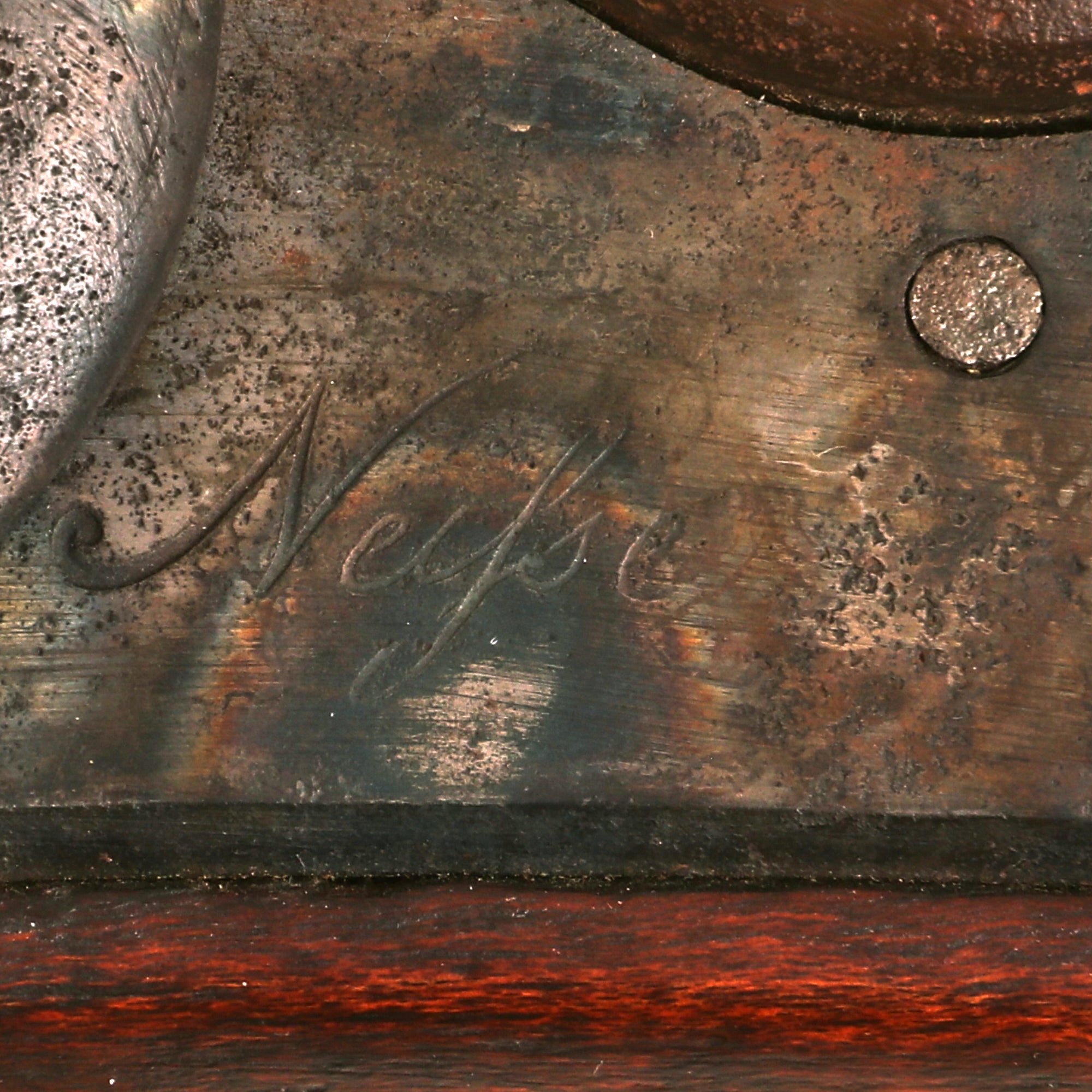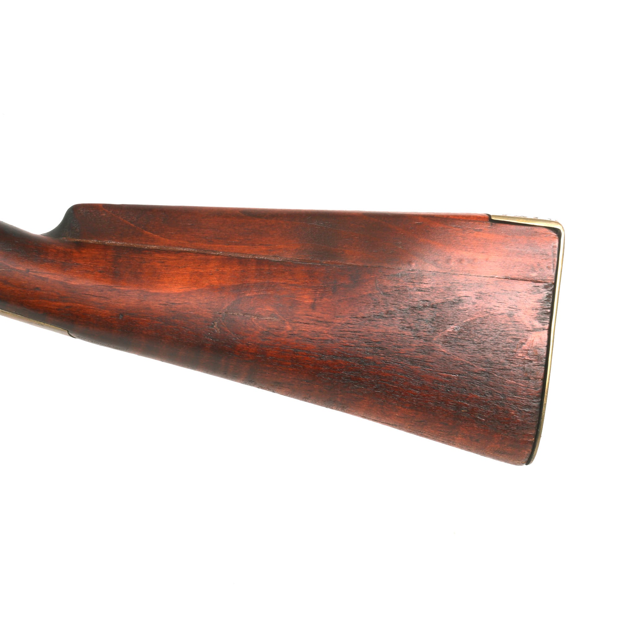 The musket does show powder burn on and around the cap nipple cone bolster, so it definitely did see use after conversion. The cleanout and cap nipple come were replaced during the restoration process as well. It is still in the original 0.74" caliber with a smoothbore barrel. The lockplate surface has a lovely lightly oxidized patina, looking to have been refinished with case hardening, and has a curved tail that terminates into a small teat that differentiates it from the later 1839 model. Markings are standard with none found behind the hammer. Forward of the hammer, the markings are mostly clear show a very faint CROWN over Neisſe, a known marking on these muskets. It most likely indicates they were produced at an arsenal near the Neisse river, which today is the border between Southwest Poland and Germany, but at that point was part of one of the German states. The securing spots for the frizzen and spring can still be seen, though they are now plugged.