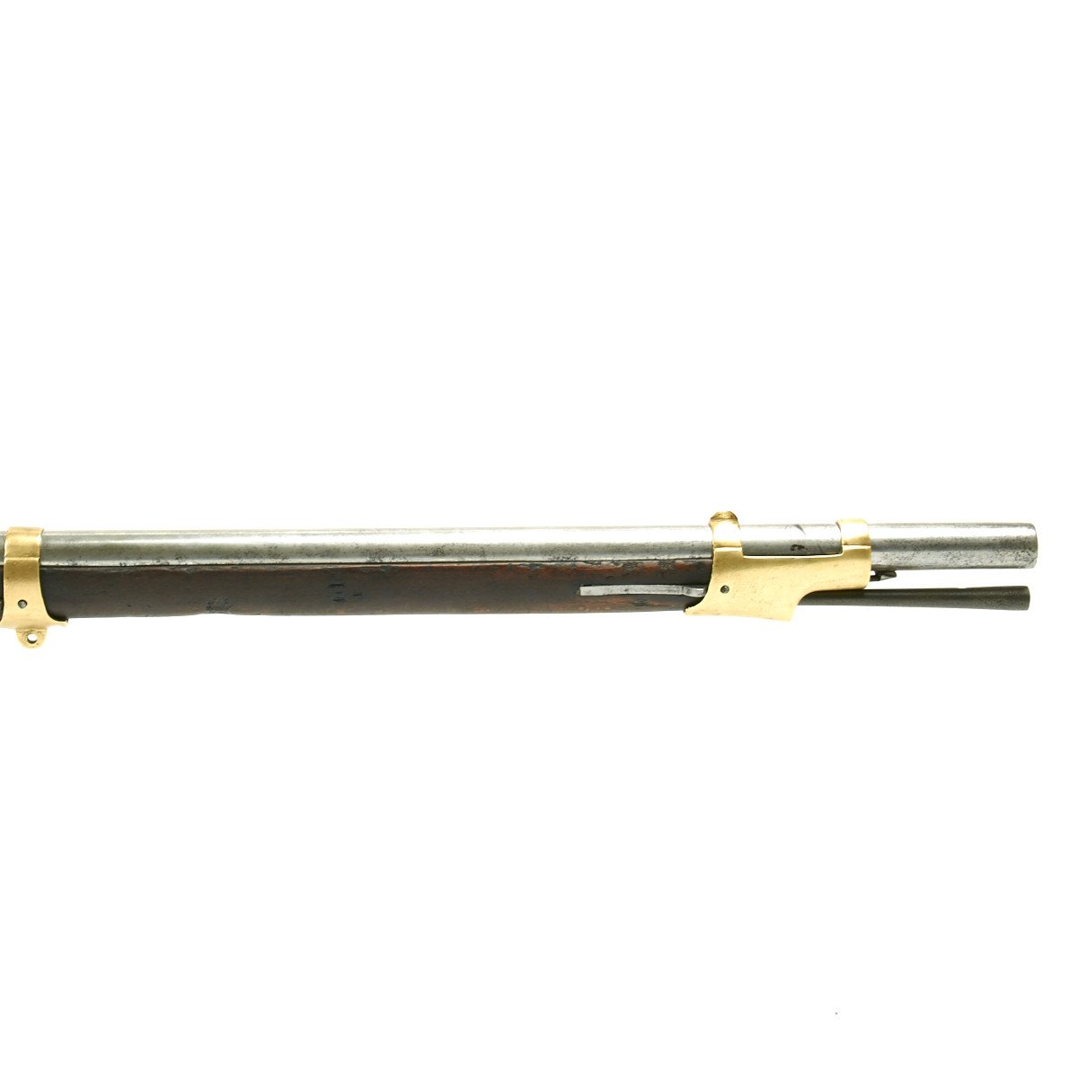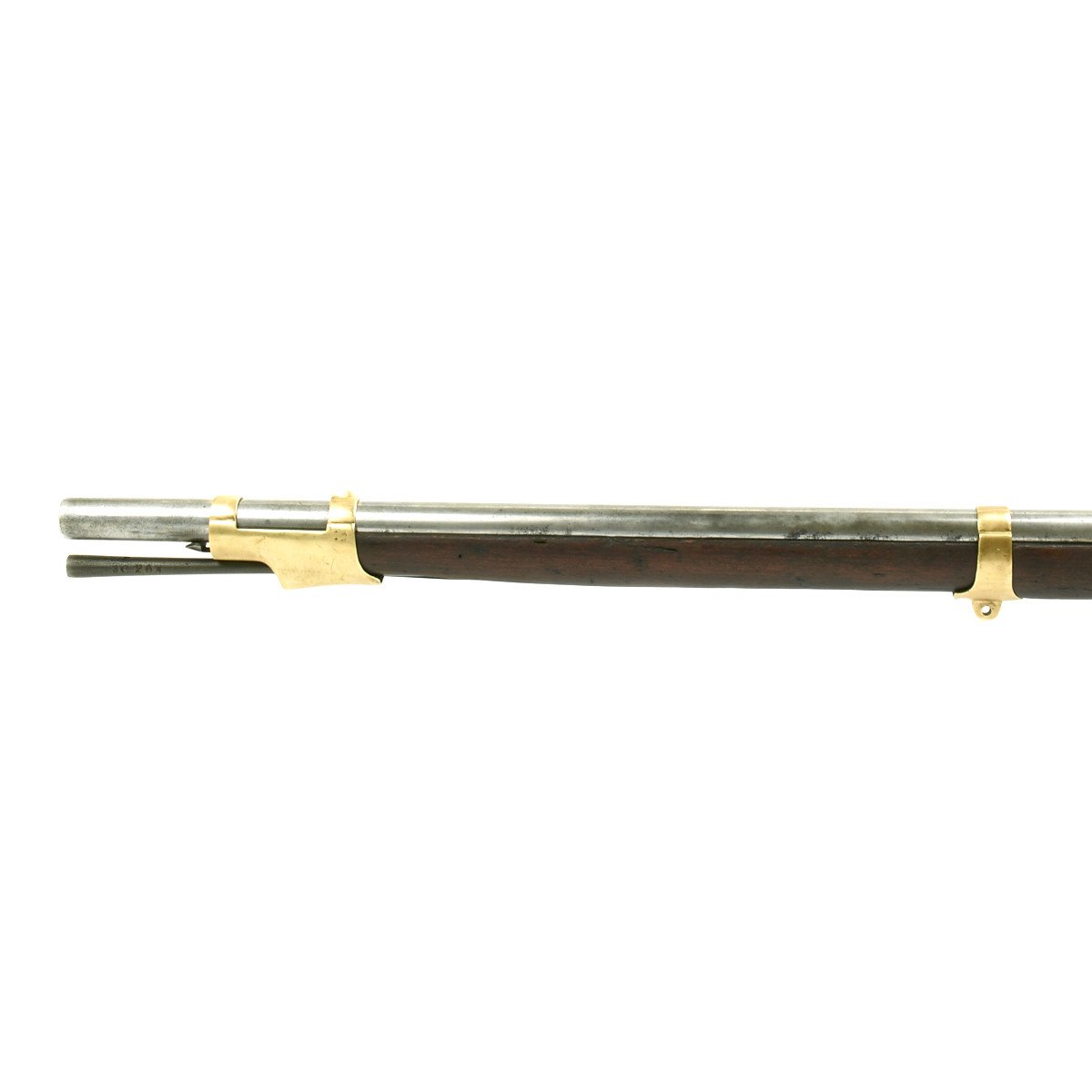 Black walnut stock with its recessed cheek piece is handsome and strong. Wood surface is dark and un-cleaned. No cracks visible but stock does show minor dings, dents and light scuffs from age and use. Tapered ramrod is original and bears inspector markings at the tip. A fine Prussian Potsdam Pattern 1809 smoothbore musket.