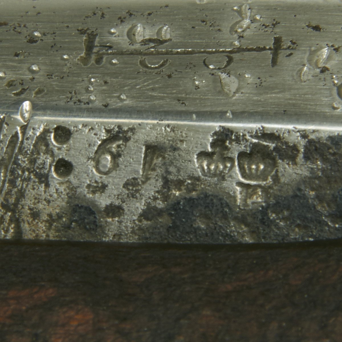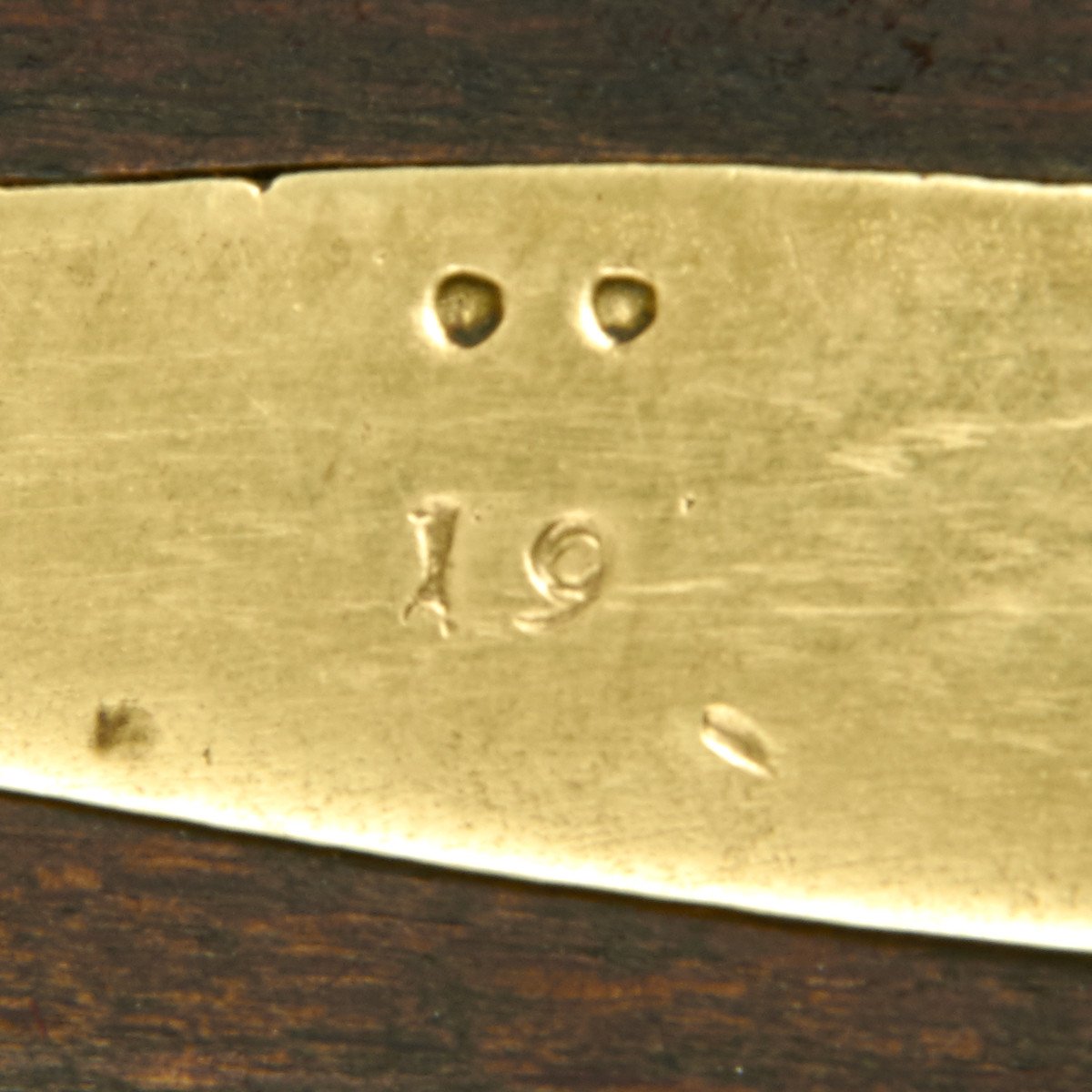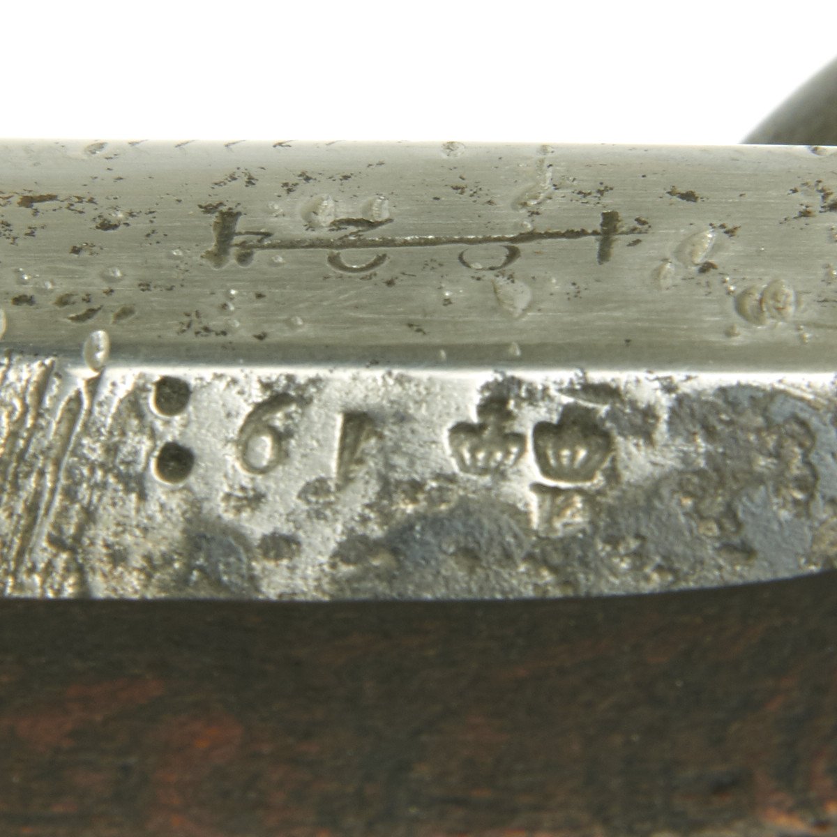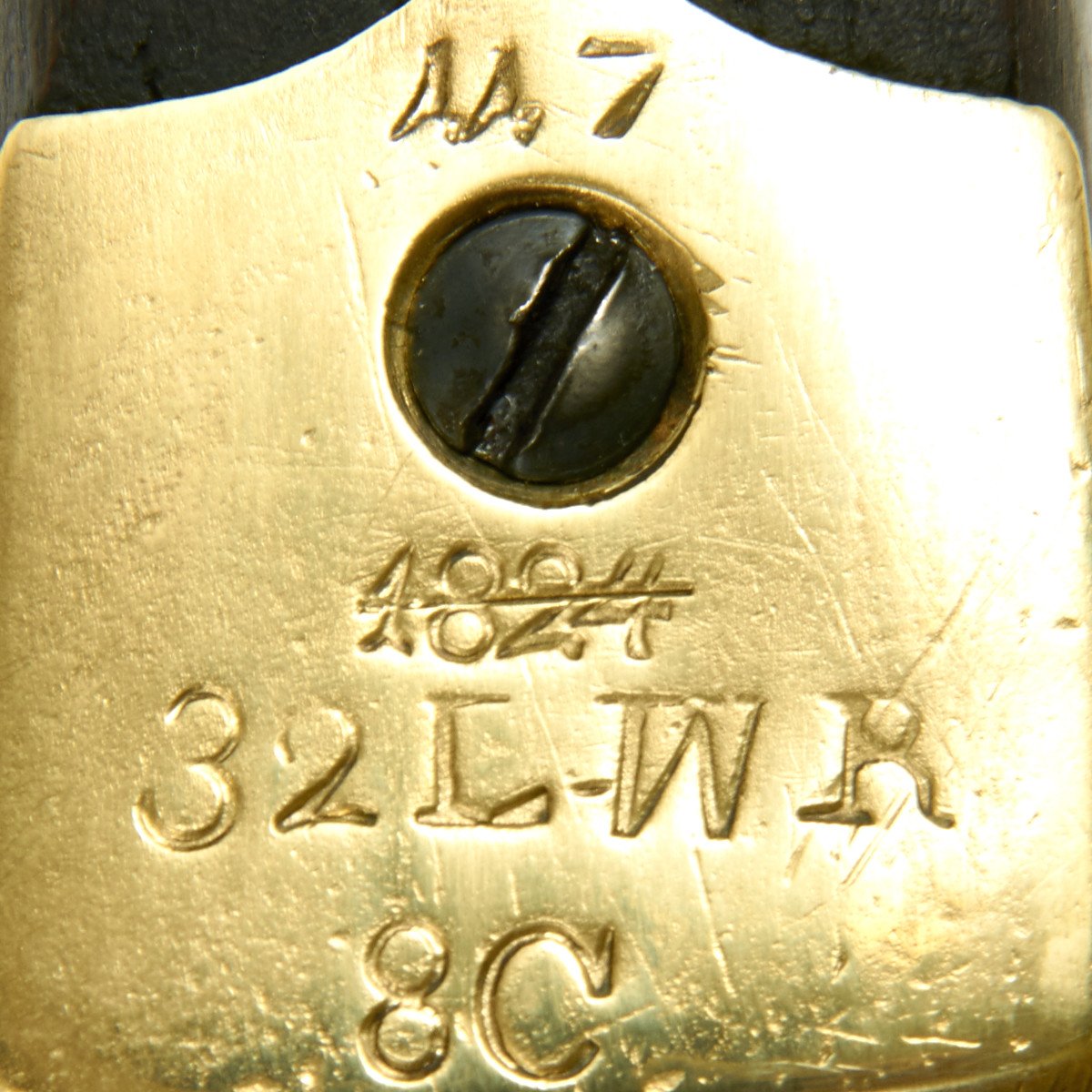 All brass wears a mellow bronze patina. Finials of the trigger guard and the toe of the butt plate terminate in distinct three-pointed ends. Butt plate is stamped with numerous stampings including: regimental markings, 32LWR 8C and 1824 the date of conversion from flint to percussion.