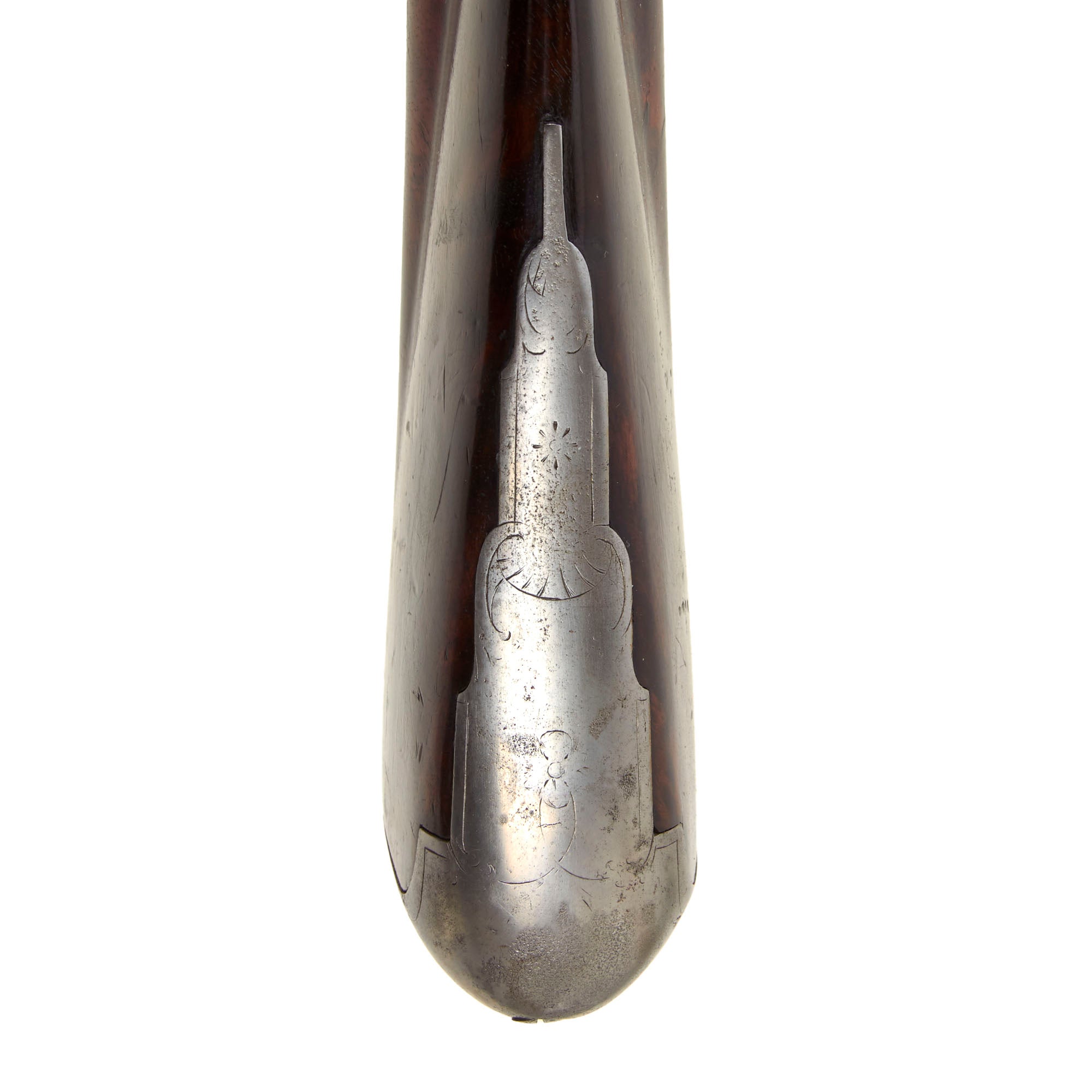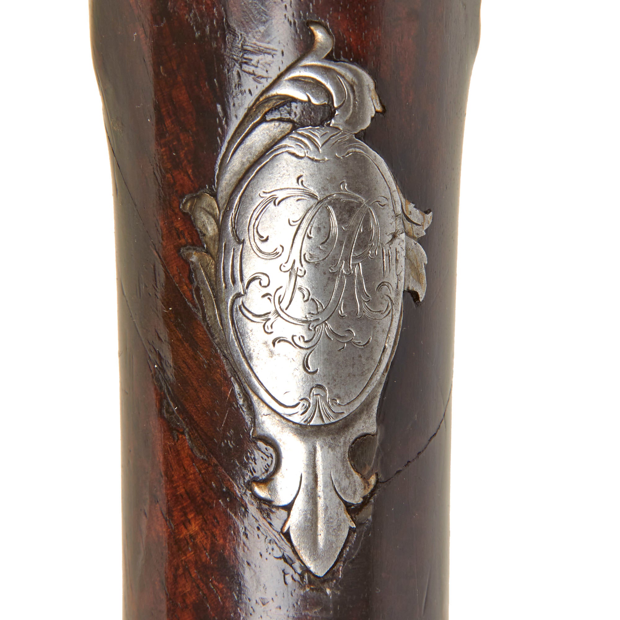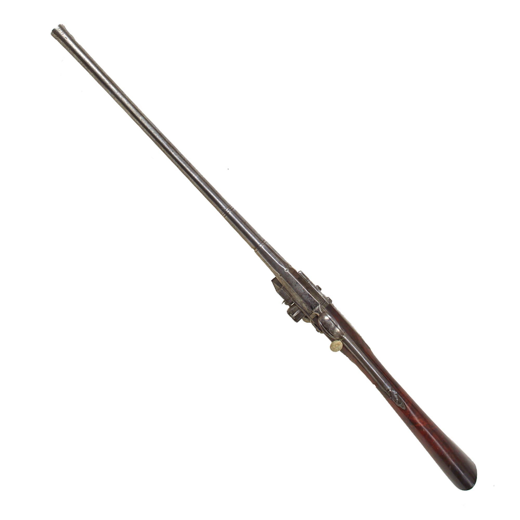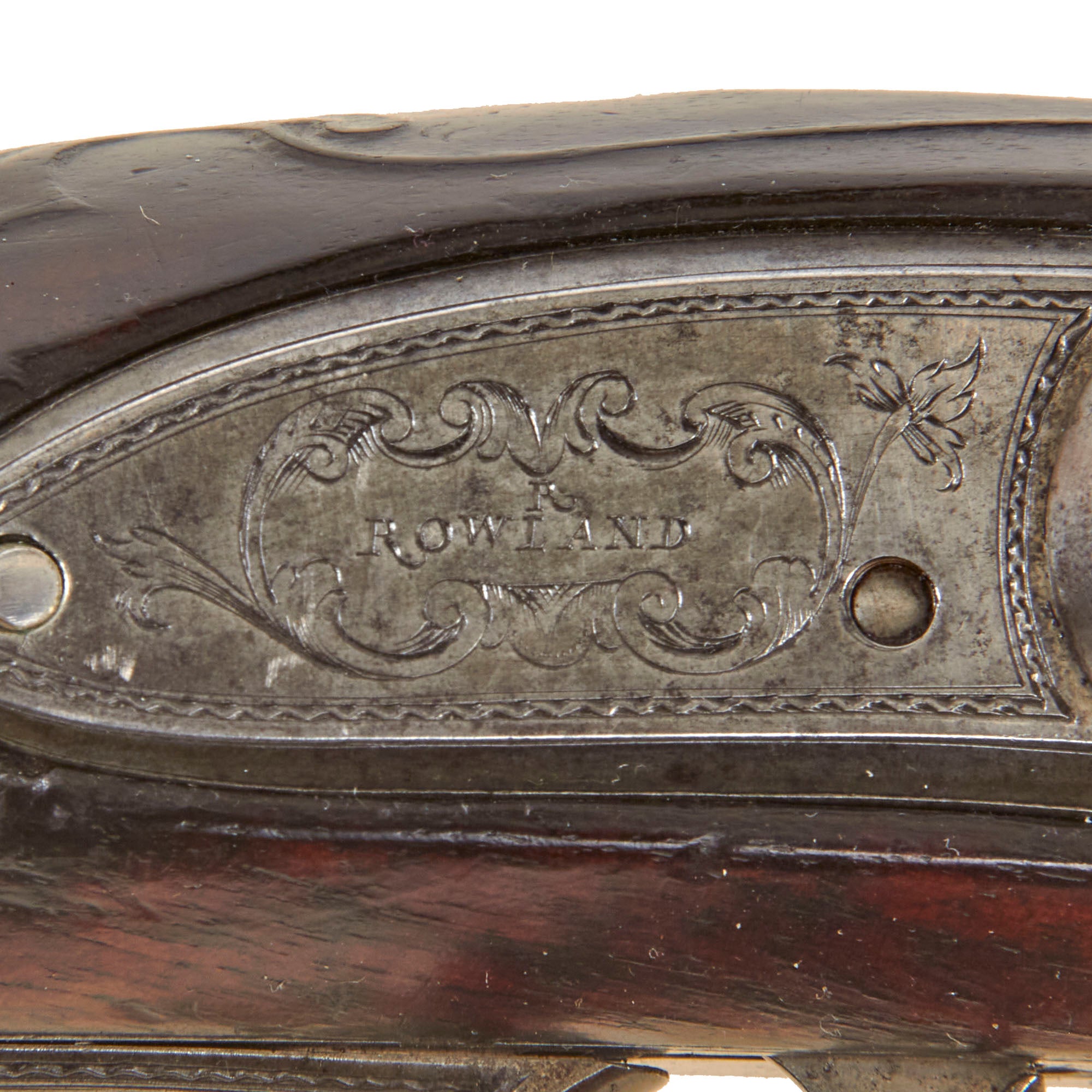 The lock plate is marked R / ROWLAND, while the top of the octagonal breech is inscribed R - ROWLAND - LONDINI, identifying the maker as Robert Rowland of London. “Londini” is the Latinized form of London, commonly used during the period. Rowland was admitted to the freedom of the Gunmakers’ Company by redemption on April 7, 1715, and died in 1721. He is known to have produced firearms for the London merchant John Tournay (“Near London Bridge or near Kingston in Surrey”), including both a gun and a rifle dated 1718, each employing the same breech-loading and self-priming system seen here. The left facet of the barrel bears the CROWN / GP gunmaker’s proof mark and the CROWN / V viewed mark from the London Proof House, with an R within a Vase mark between them, likely a personal proof mark used by Rowland.