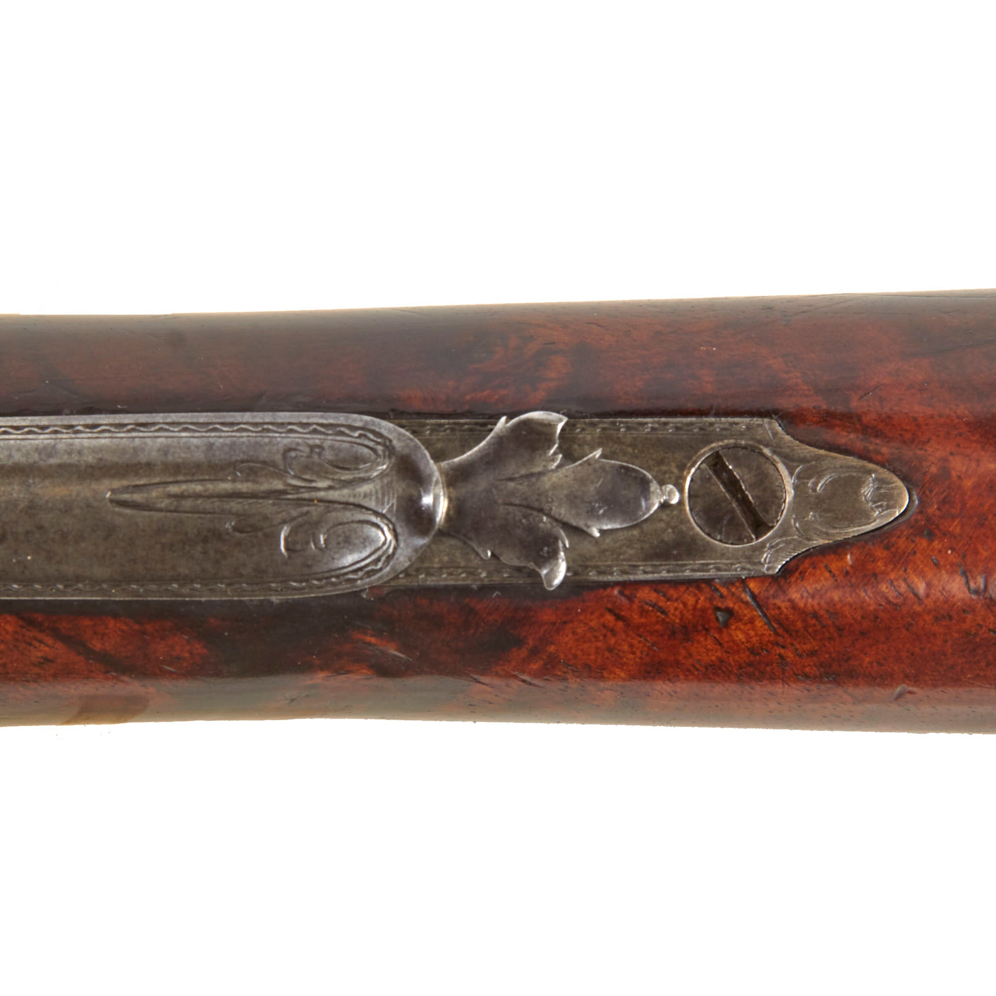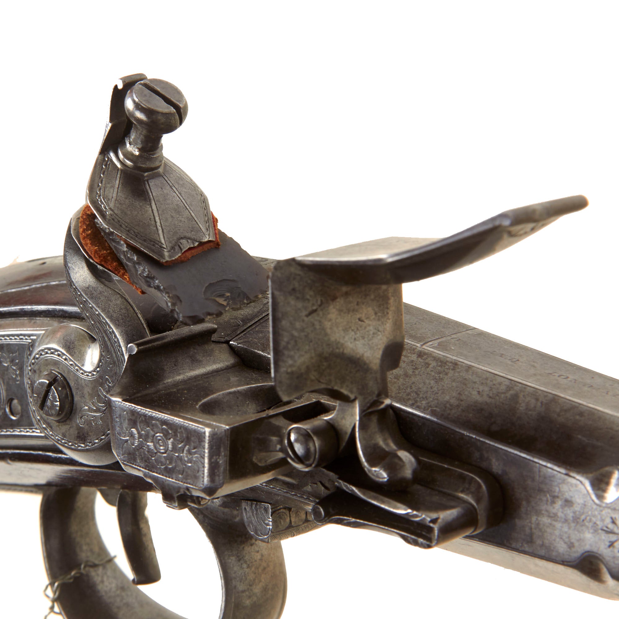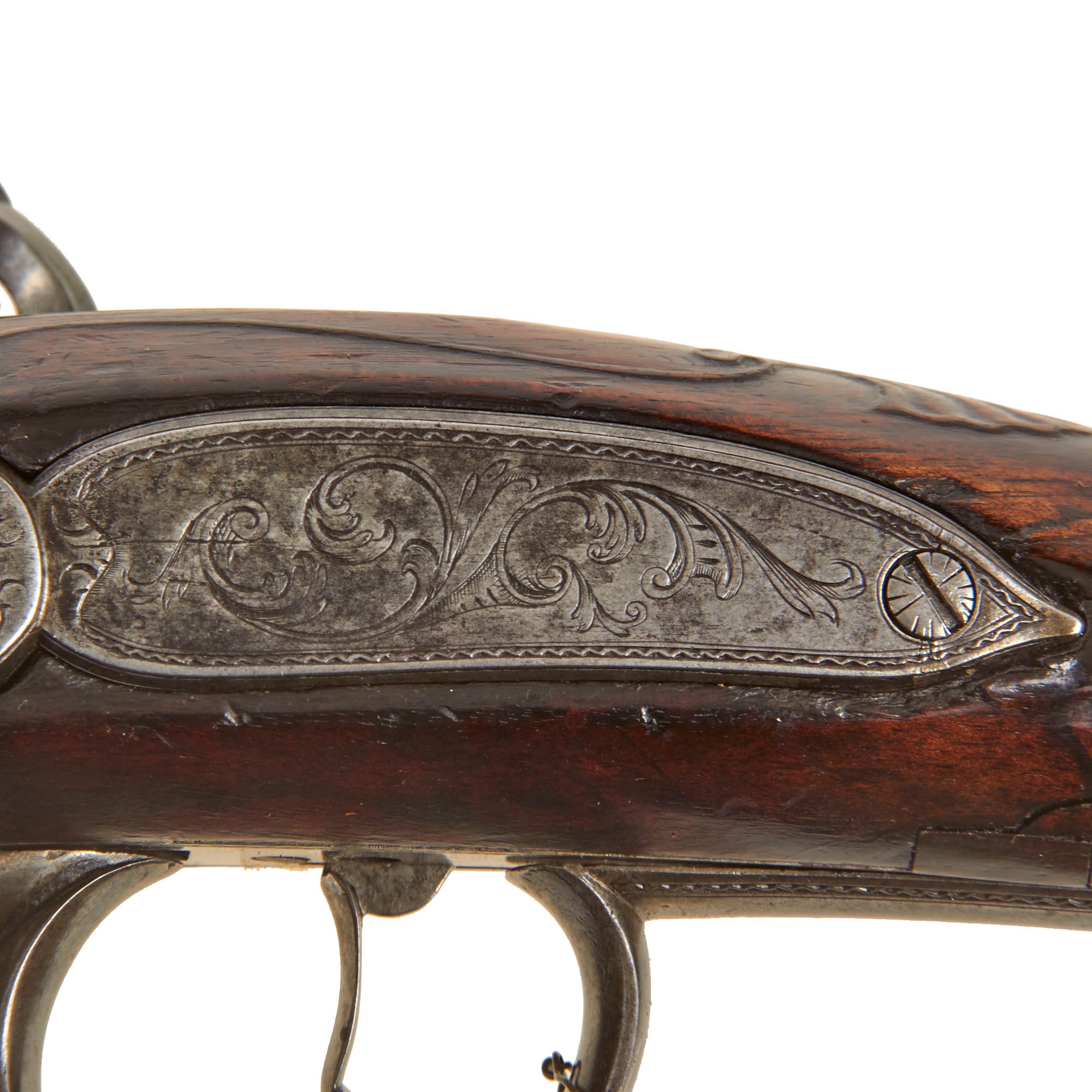 The lock plate is marked R / ROWLAND, while the top of the octagonal breech is inscribed R - ROWLAND - LONDINI, identifying the maker as Robert Rowland of London. “Londini” is the Latinized form of London, commonly used during the period. Rowland was admitted to the freedom of the Gunmakers’ Company by redemption on April 7, 1715, and died in 1721. He is known to have produced firearms for the London merchant John Tournay (“Near London Bridge or near Kingston in Surrey”), including both a gun and a rifle dated 1718, each employing the same breech-loading and self-priming system seen here. The left facet of the barrel bears the CROWN / GP gunmaker’s proof mark and the CROWN / V viewed mark from the London Proof House, with an R within a Vase mark between them, likely a personal proof mark used by Rowland.