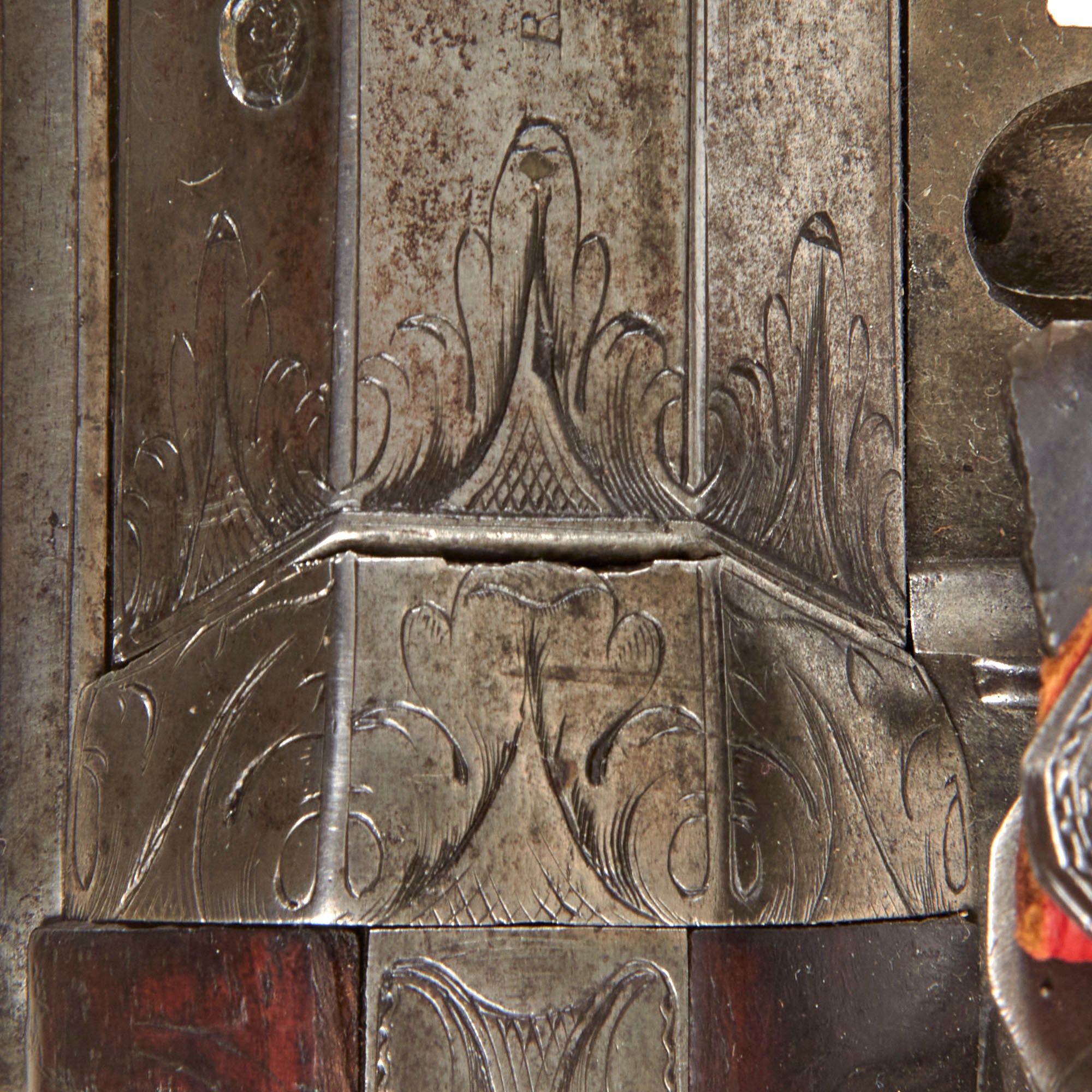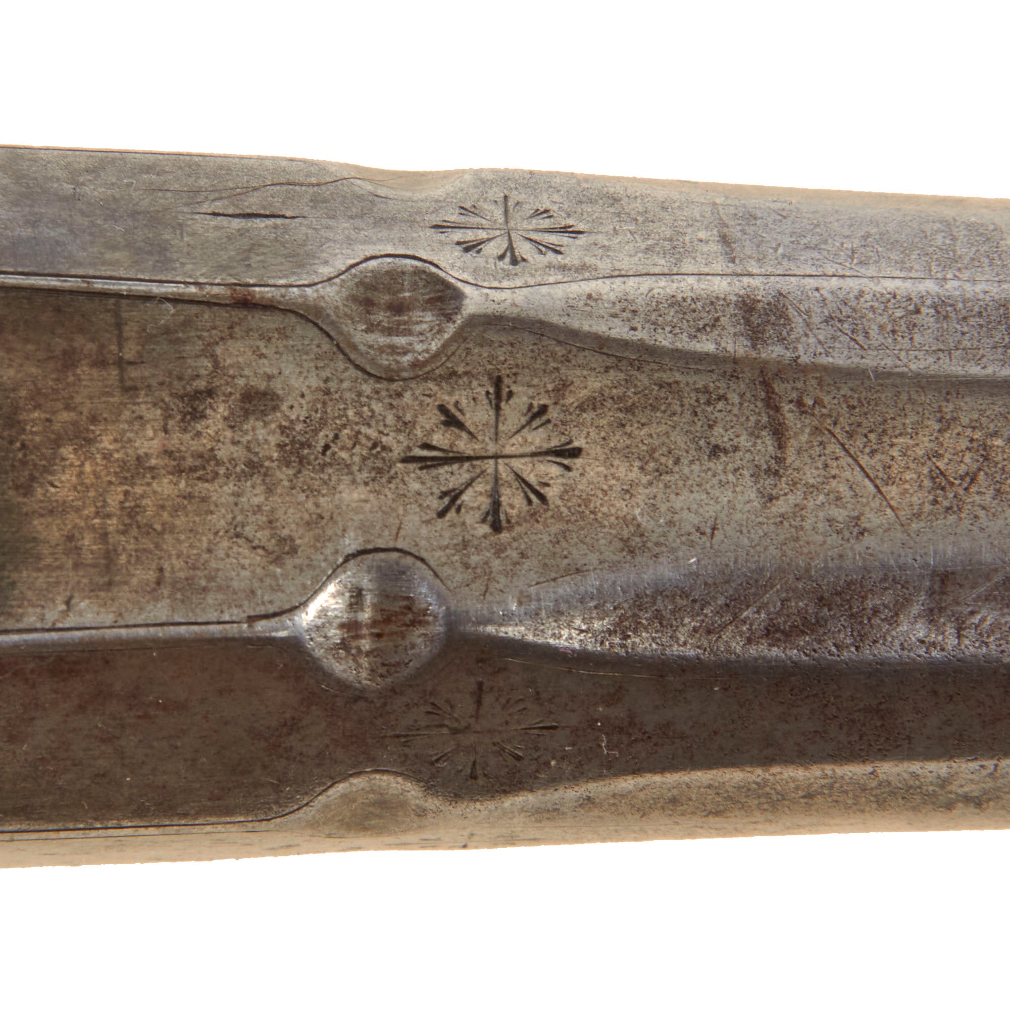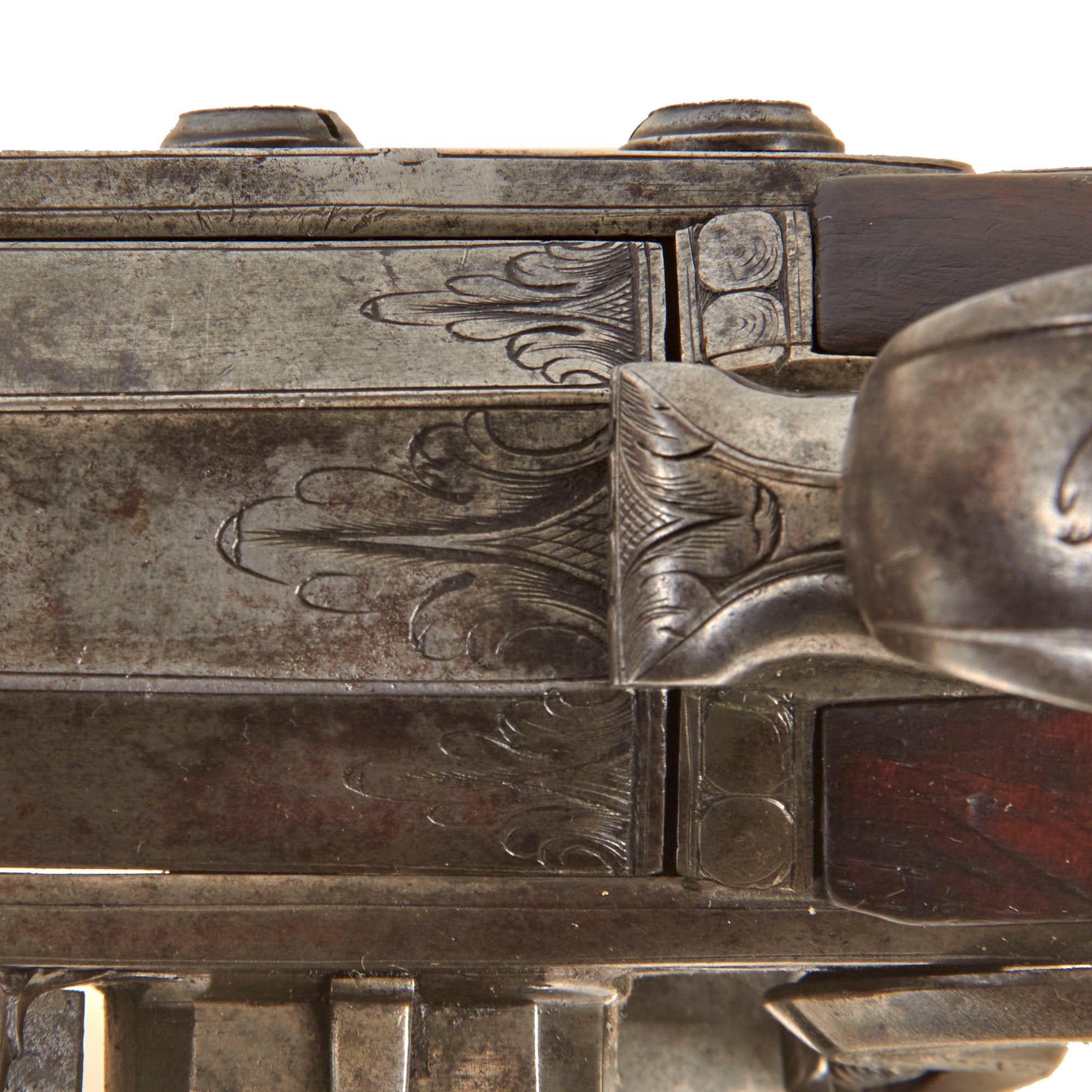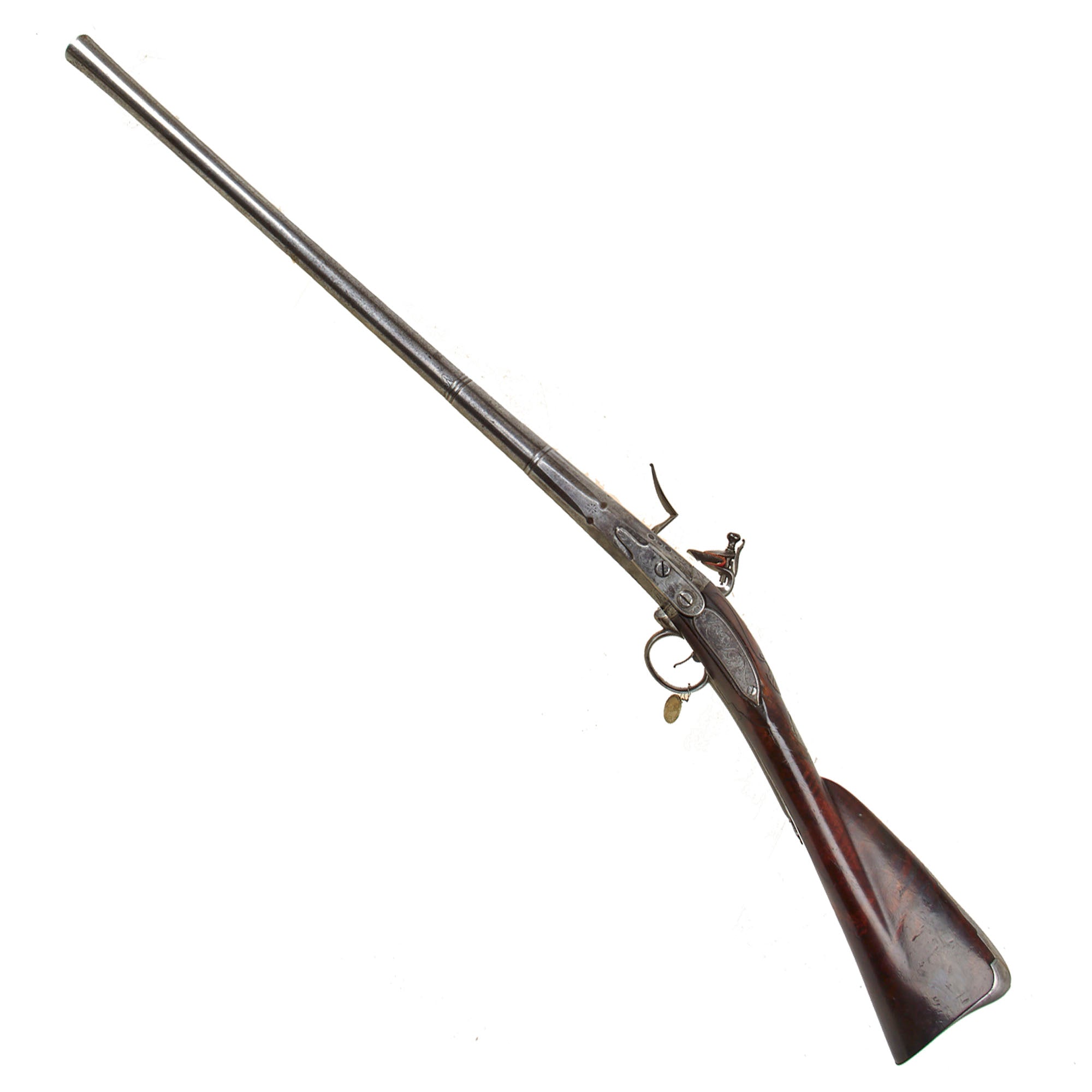 The lock plate is marked R / ROWLAND, while the top of the octagonal breech is inscribed R - ROWLAND - LONDINI, identifying the maker as Robert Rowland of London. “Londini” is the Latinized form of London, commonly used during the period. Rowland was admitted to the freedom of the Gunmakers’ Company by redemption on April 7, 1715, and died in 1721. He is known to have produced firearms for the London merchant John Tournay (“Near London Bridge or near Kingston in Surrey”), including both a gun and a rifle dated 1718, each employing the same breech-loading and self-priming system seen here. The left facet of the barrel bears the CROWN / GP gunmaker’s proof mark and the CROWN / V viewed mark from the London Proof House, with an R within a Vase mark between them, likely a personal proof mark used by Rowland.