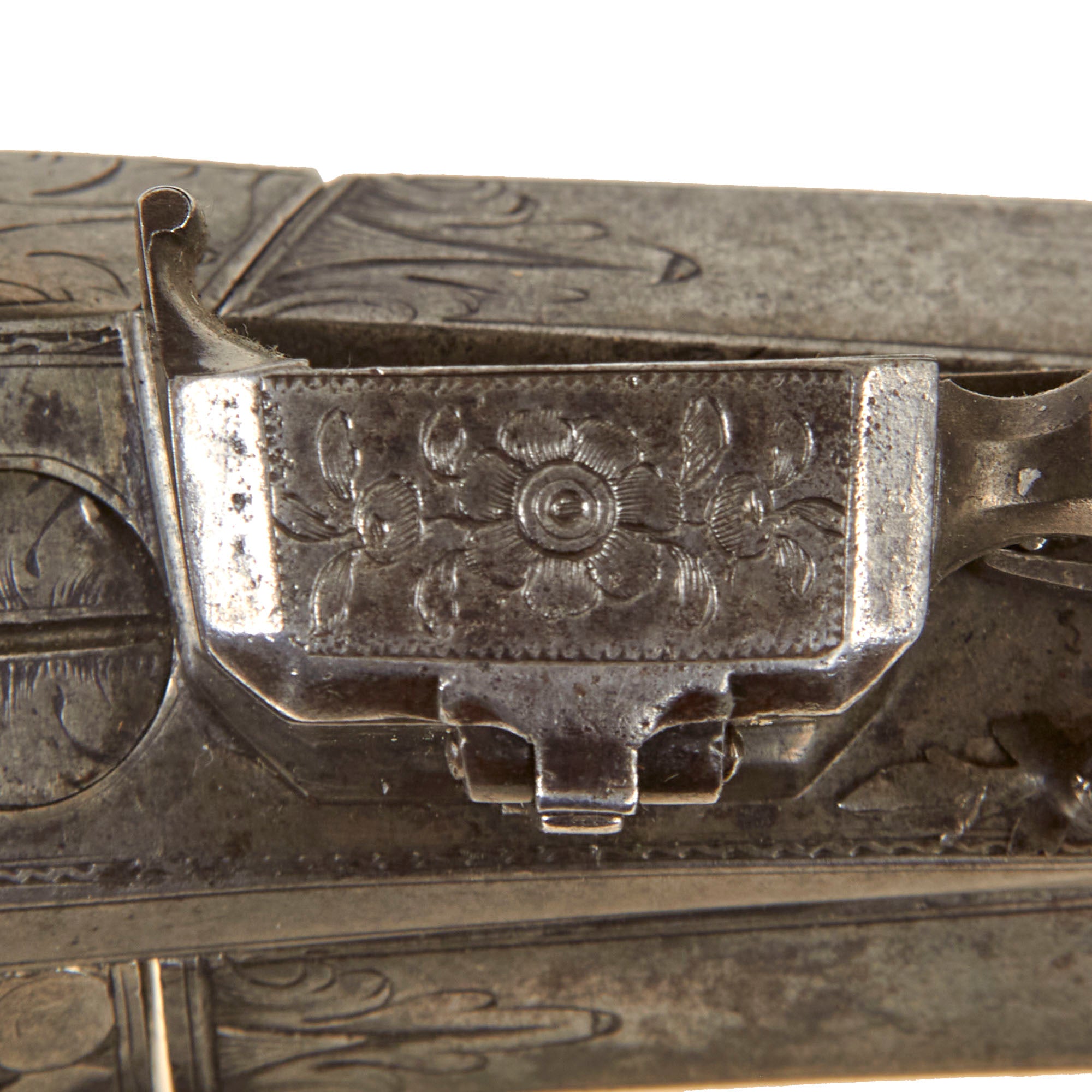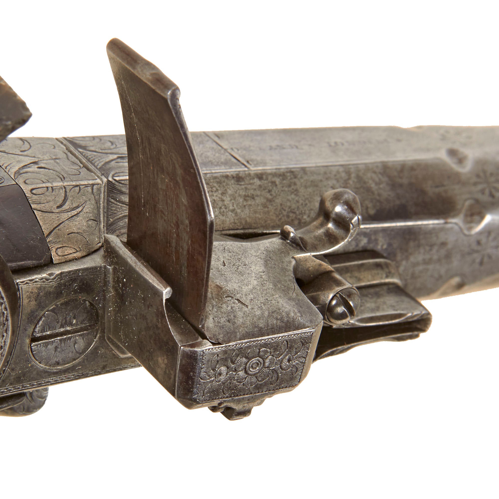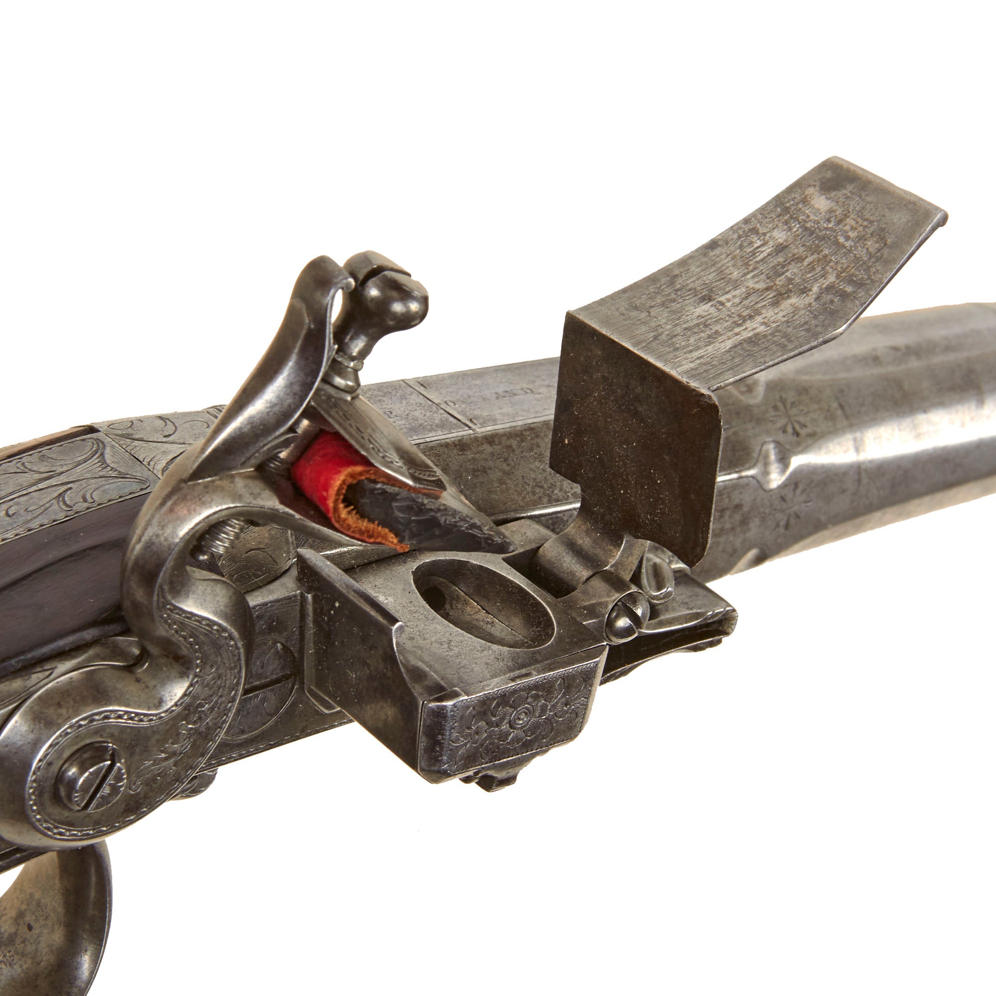 Original Item: One of a Kind. This exceptional piece represents a remarkable opportunity for collectors, offering a fine example of an extremely rare early breech-loading system that utilizes a reloadable steel “cartridge.” The mechanism operates by pulling back the sliding trigger guard, which allows the action to break open and the barrel to tip upward, permitting removal of the cartridge from the breech. Simultaneously, the flash pan rotates and opens toward a small adjacent compartment, automatically “self-priming” with powder for the next discharge. This ingenious system was far ahead of its time and required a very high level of craftsmanship to execute.