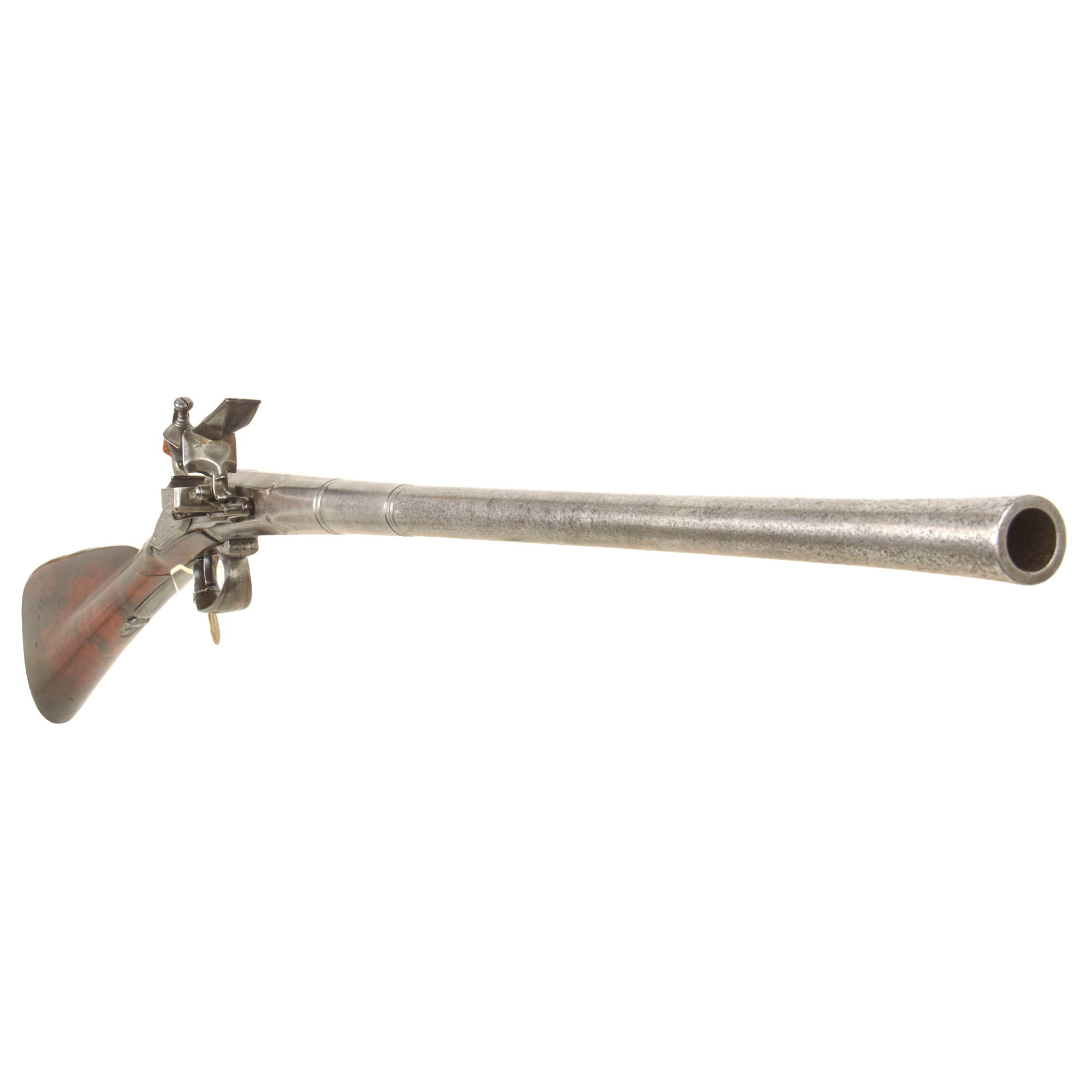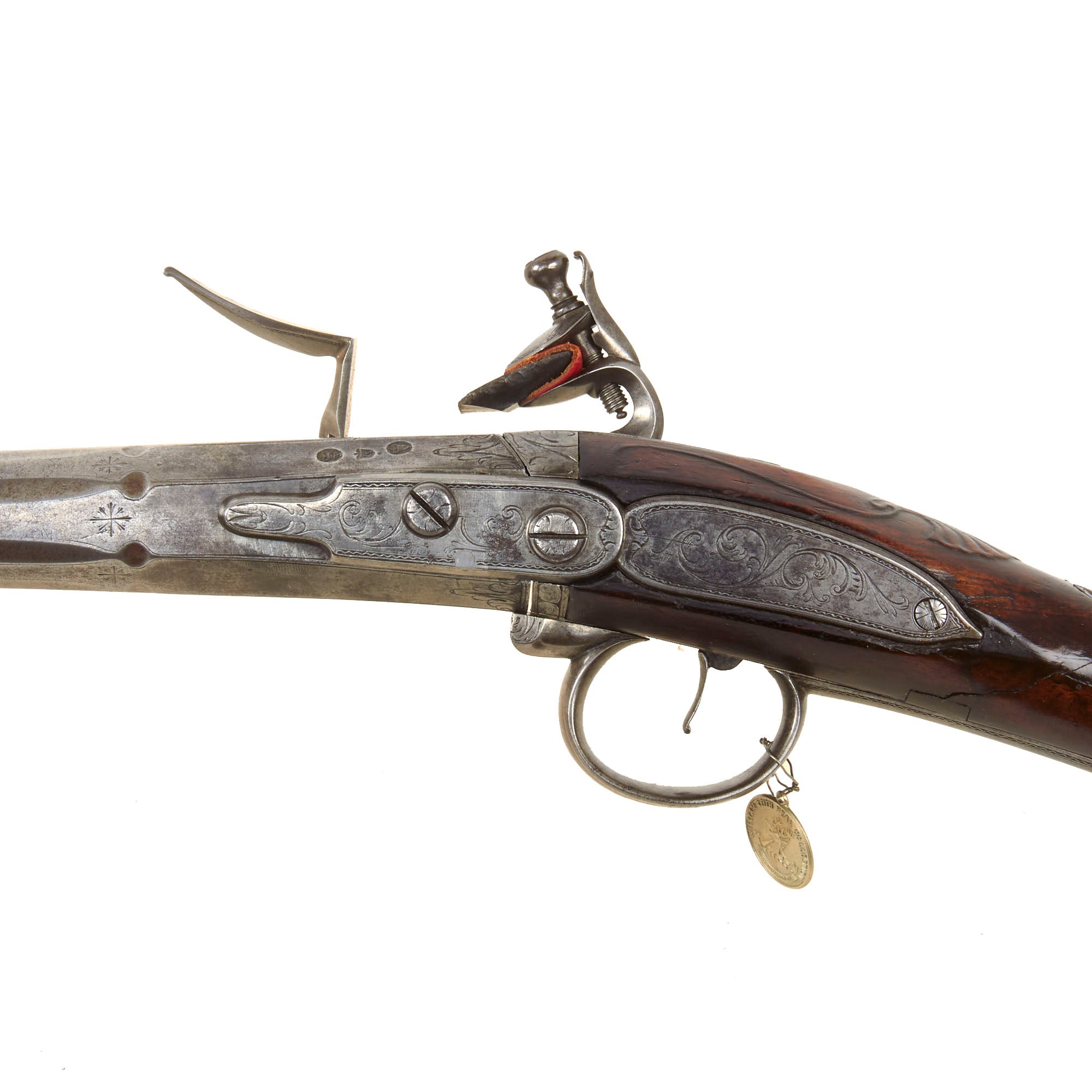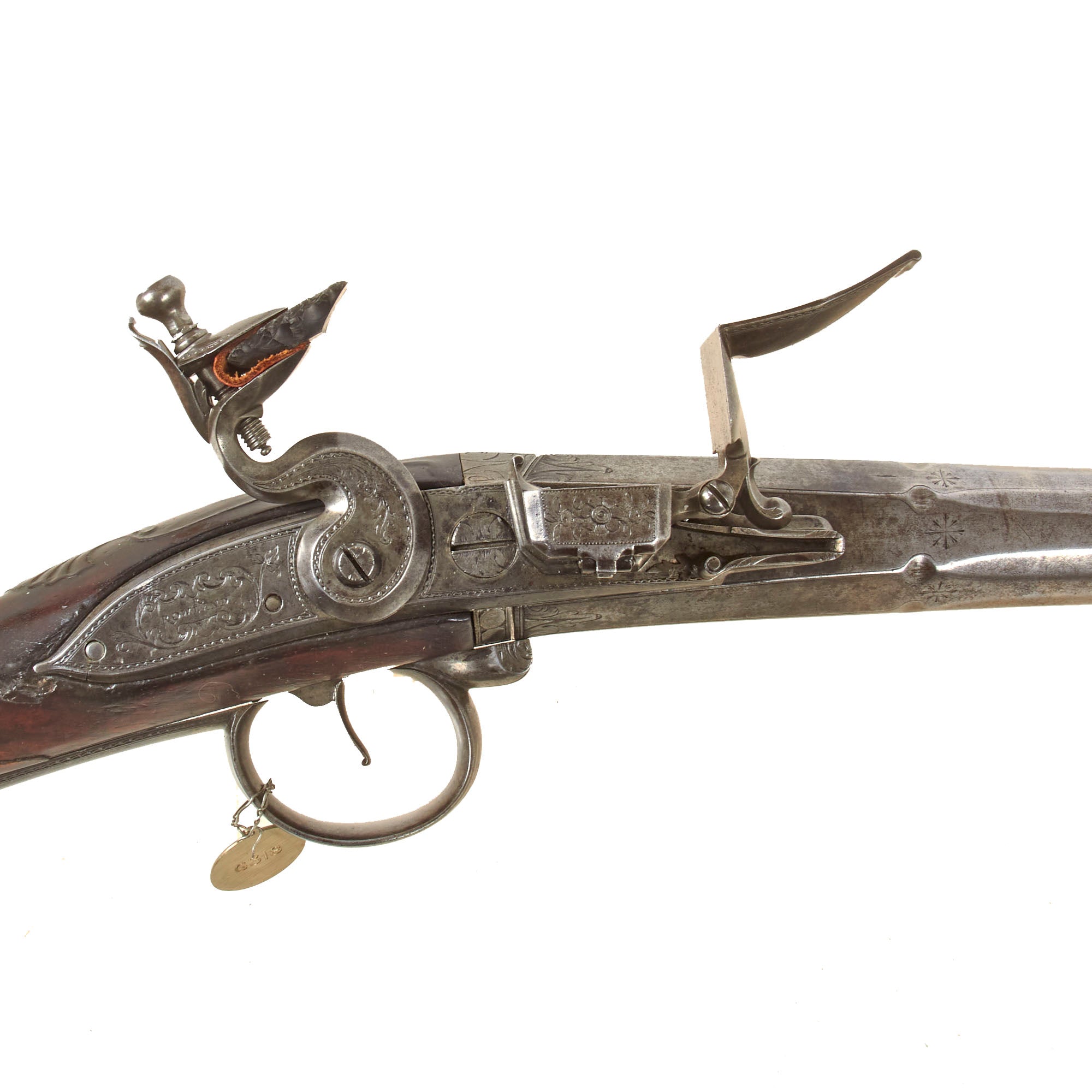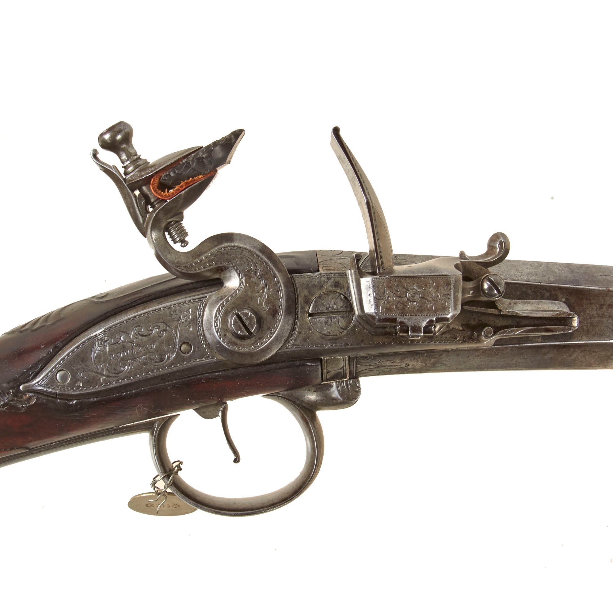 Attached by a wire to the trigger guard is a nickel die stamped collection tag reading WILLIAM KEITH NEAL COLLECTION, featuring crossed guns surmounted by a stag’s head emblem. Beneath this appears the motto TRUTH WILL CONQUER, while the reverse is stamped with collection number G318. W. Keith Neal was a renowned English writer, collector, and firearms enthusiast who assembled one of the most important private collections of antique firearms ever known. This specific style of early breech-loader by Rowland is documented in Great British Gunmakers, 1570–1740 by W. Keith Neal and D.H.L. Back (pp. 403–404, plates 169 a–e). While we do not have a copy of this work to confirm whether this exact firearm is illustrated, it is confirmed as having been part of the renown Keith Neal collection.