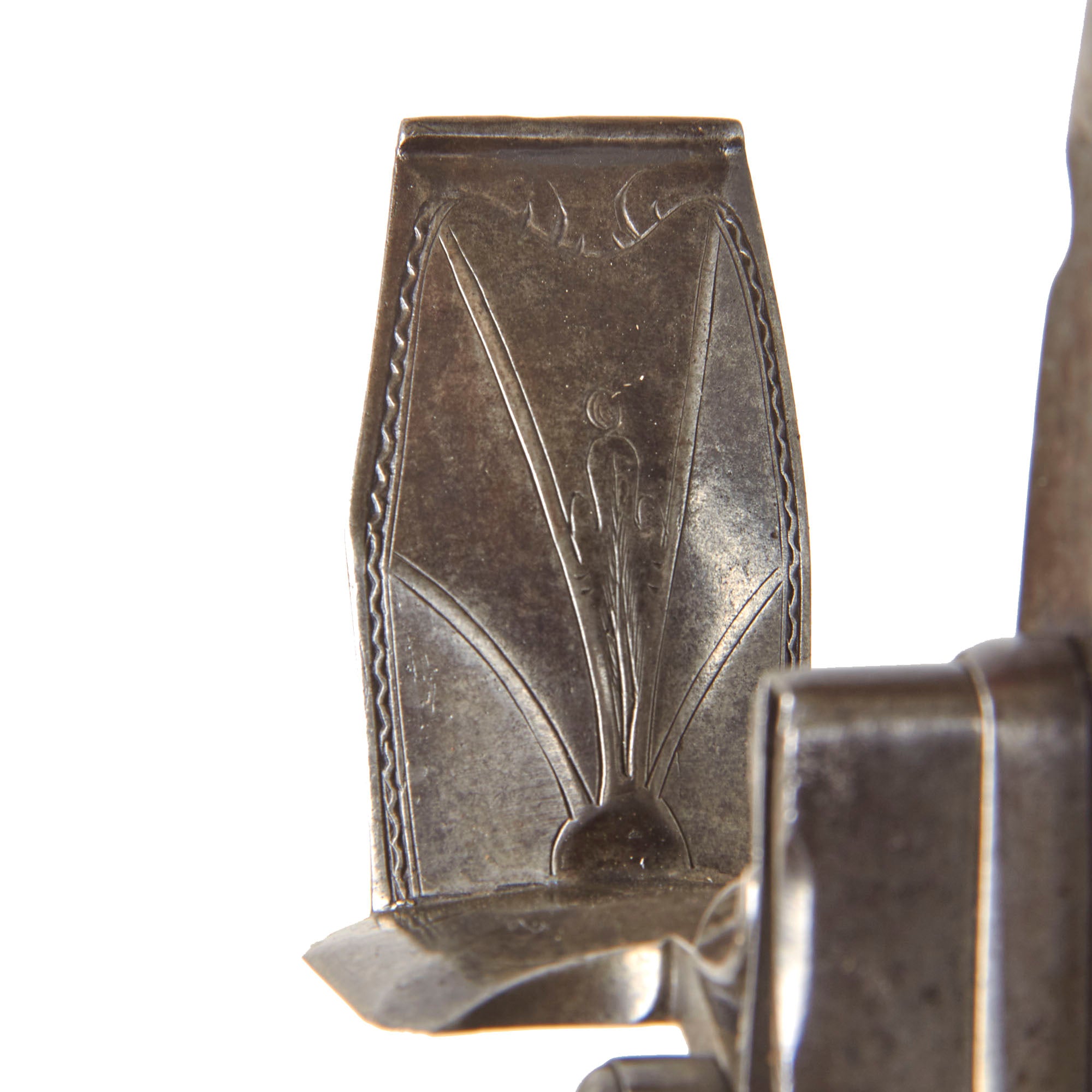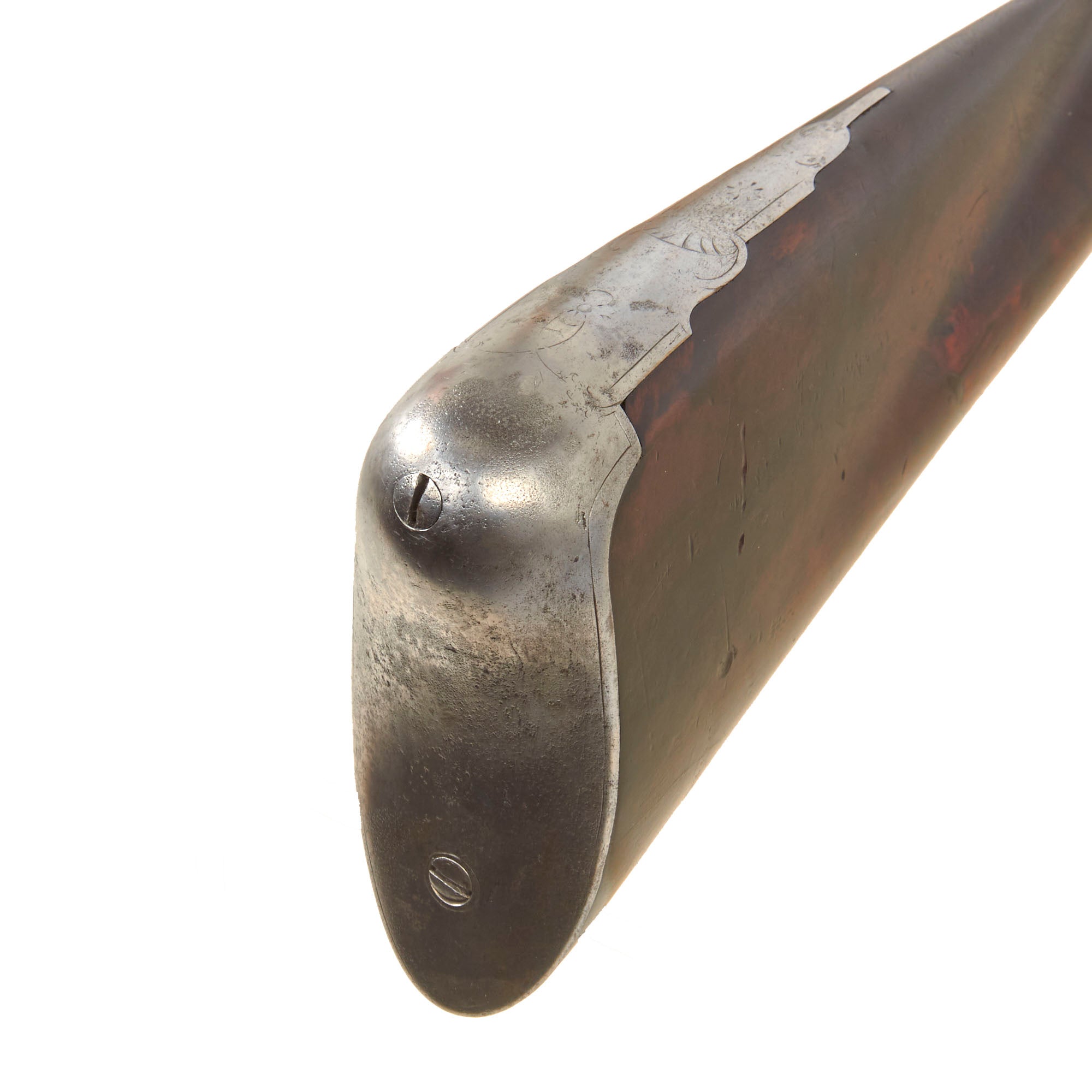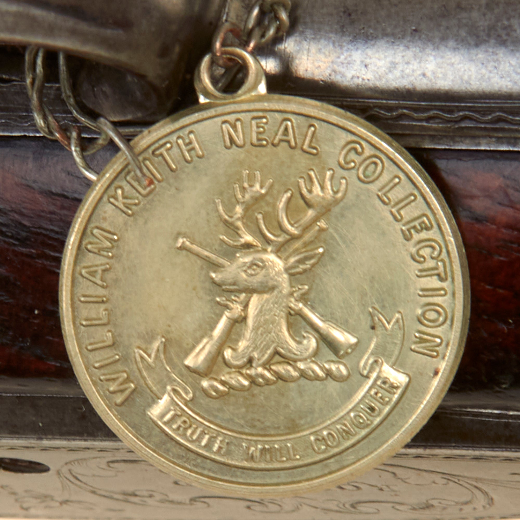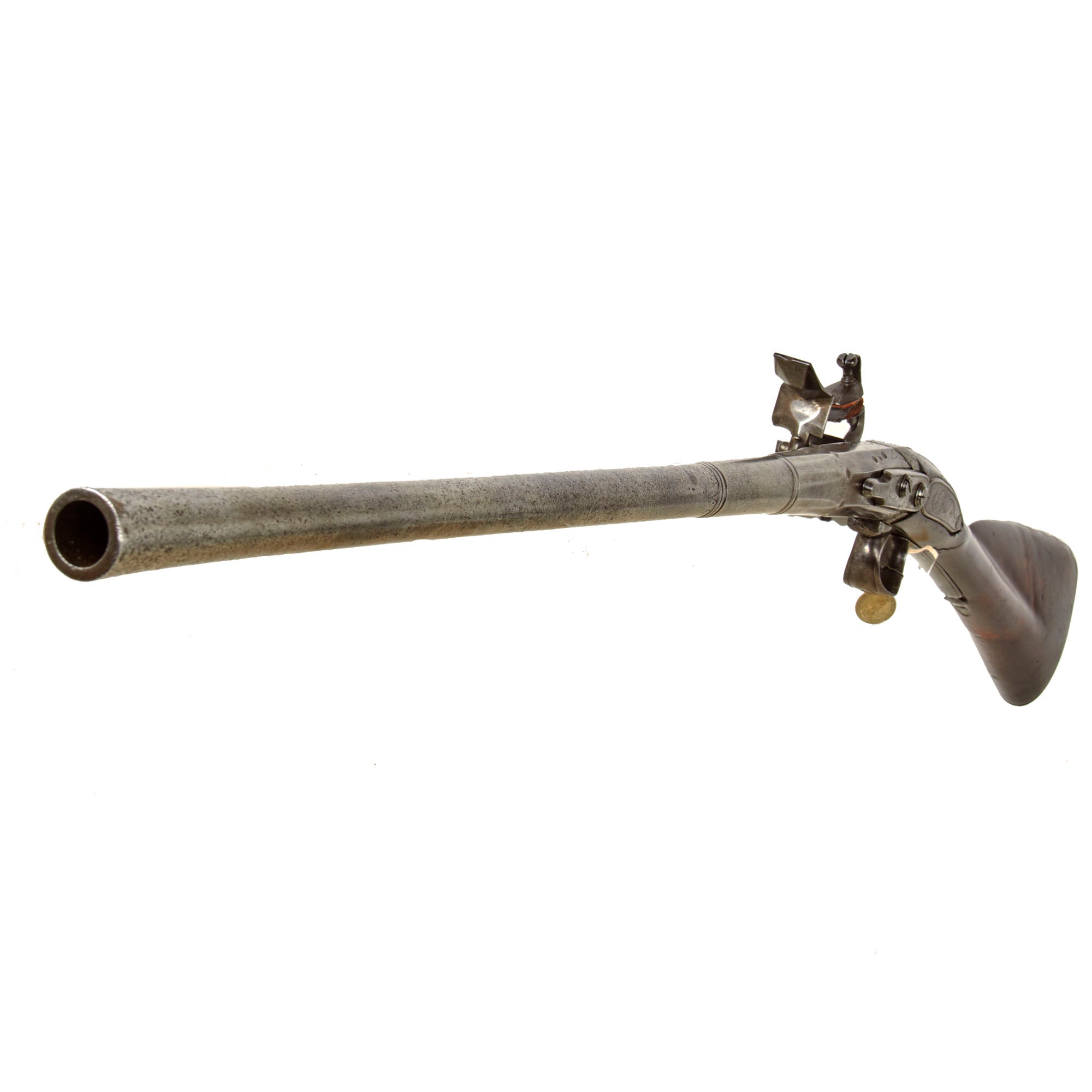 Attached by a wire to the trigger guard is a nickel die stamped collection tag reading WILLIAM KEITH NEAL COLLECTION, featuring crossed guns surmounted by a stag’s head emblem. Beneath this appears the motto TRUTH WILL CONQUER, while the reverse is stamped with collection number G318. W. Keith Neal was a renowned English writer, collector, and firearms enthusiast who assembled one of the most important private collections of antique firearms ever known. This specific style of early breech-loader by Rowland is documented in Great British Gunmakers, 1570–1740 by W. Keith Neal and D.H.L. Back (pp. 403–404, plates 169 a–e). While we do not have a copy of this work to confirm whether this exact firearm is illustrated, it is confirmed as having been part of the renown Keith Neal collection.