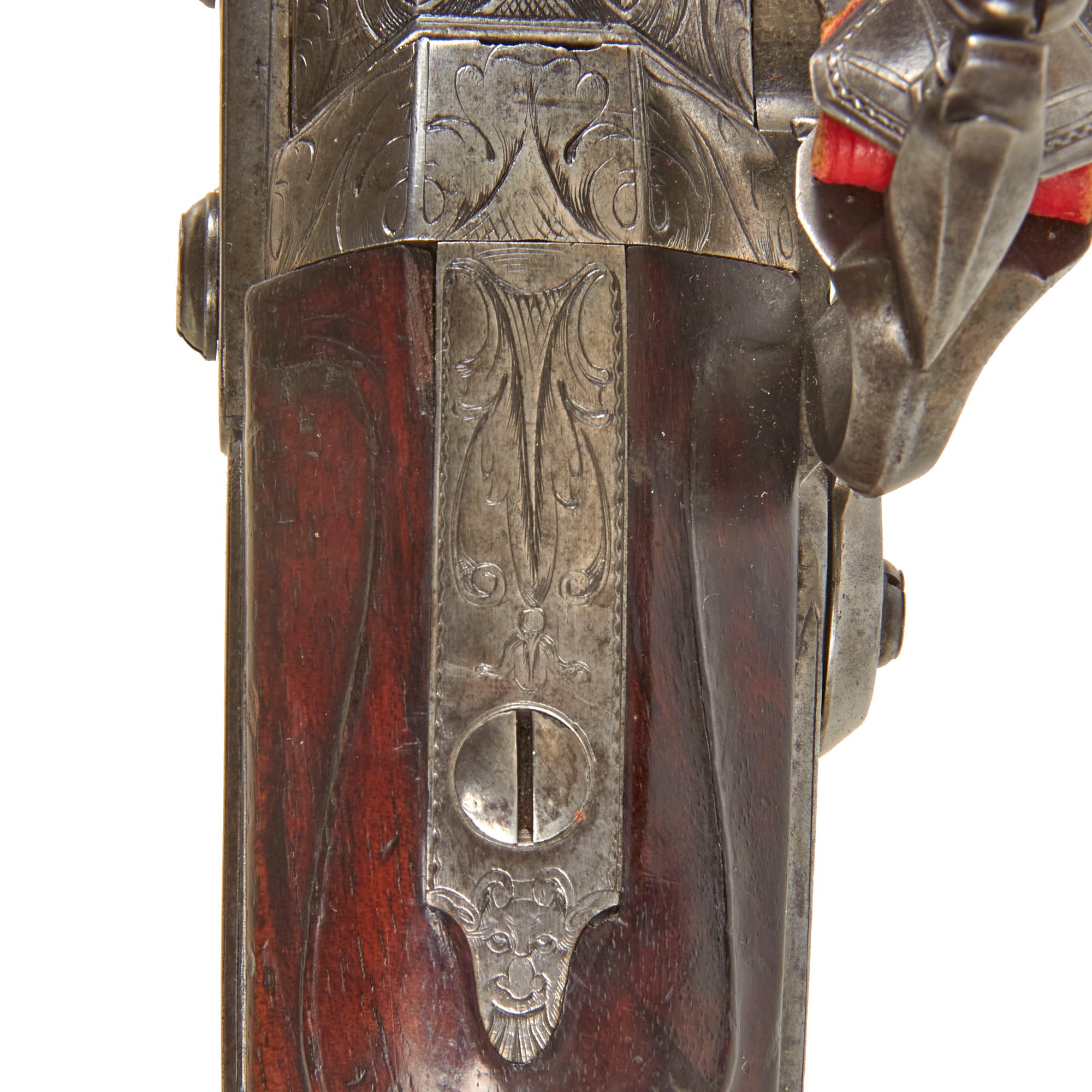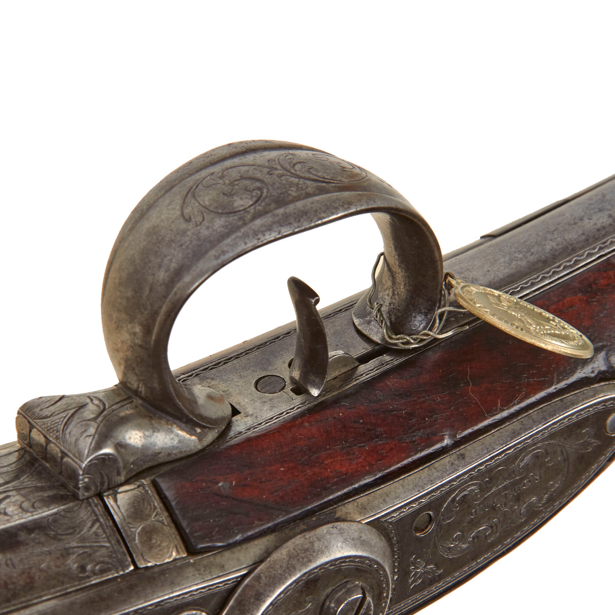 The firearm measures 42 1/4 inches in overall length and features a 26 5/8 inch 10-bore swamped, three-stage tip-up barrel engraved with acanthus foliage. The gun is extensively decorated throughout, including a distinctive “Devil’s Mask” engraved on the finial of the barrel tang. It is stocked in beautifully figured walnut, with a carved shell relief surrounding the tang. There is an old repaired crack at the grip area, which has not been altered. The rear of the wrist is fitted with a decorative escutcheon bearing the owner’s monogram, which appears to read either “PR” or “TR.”