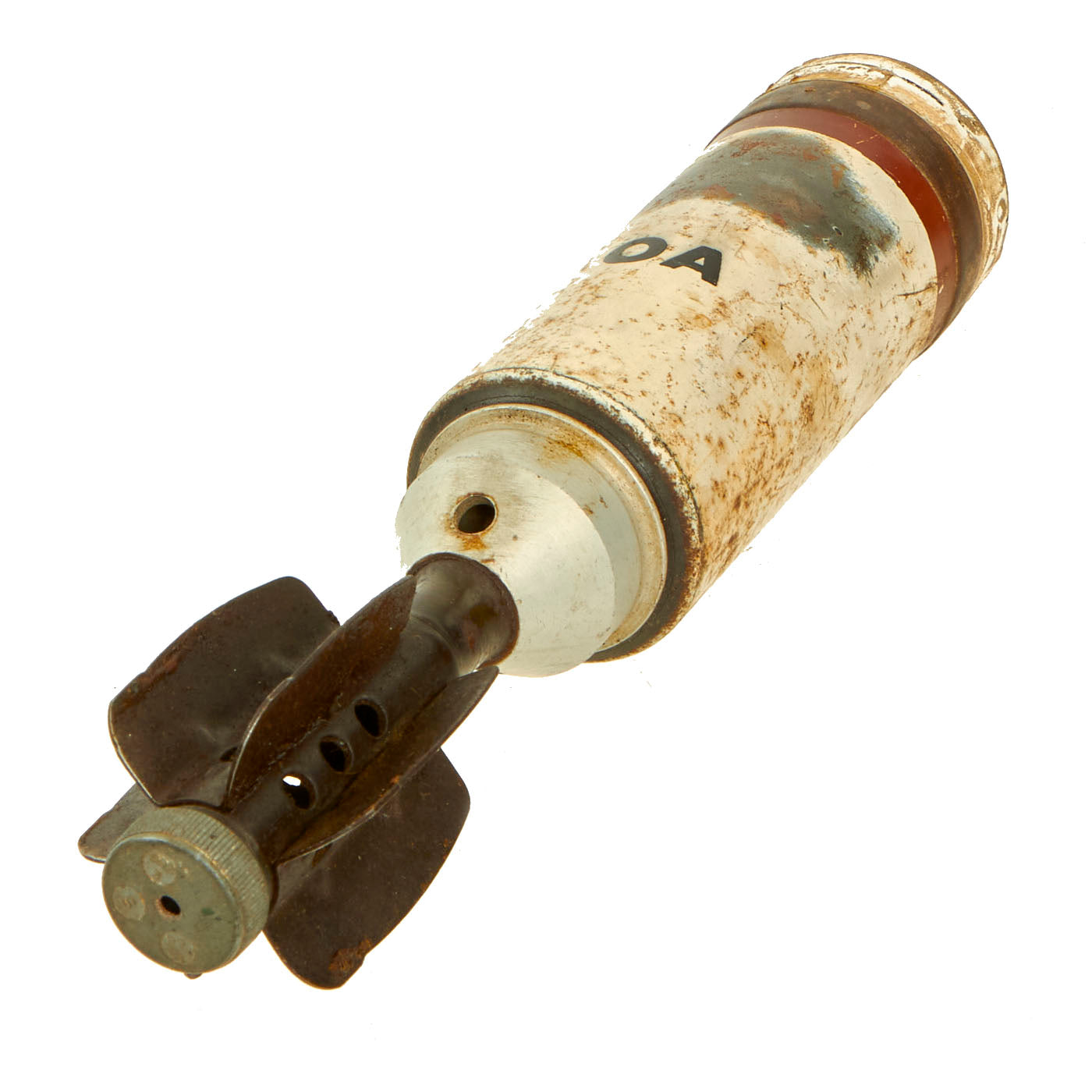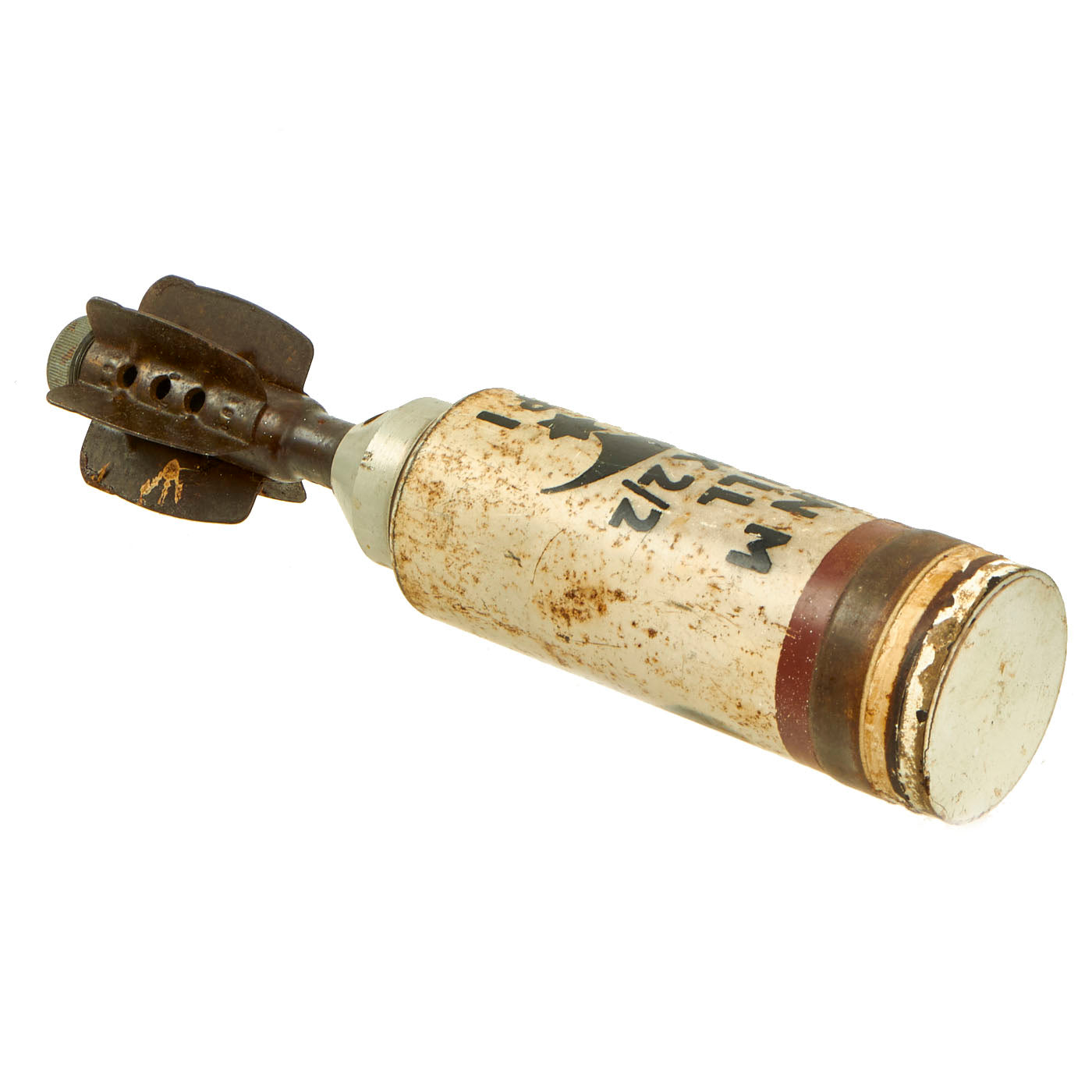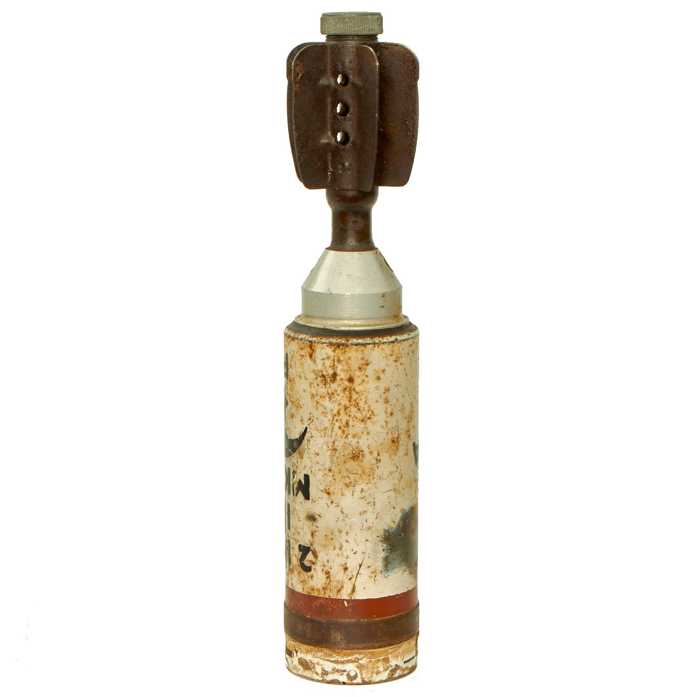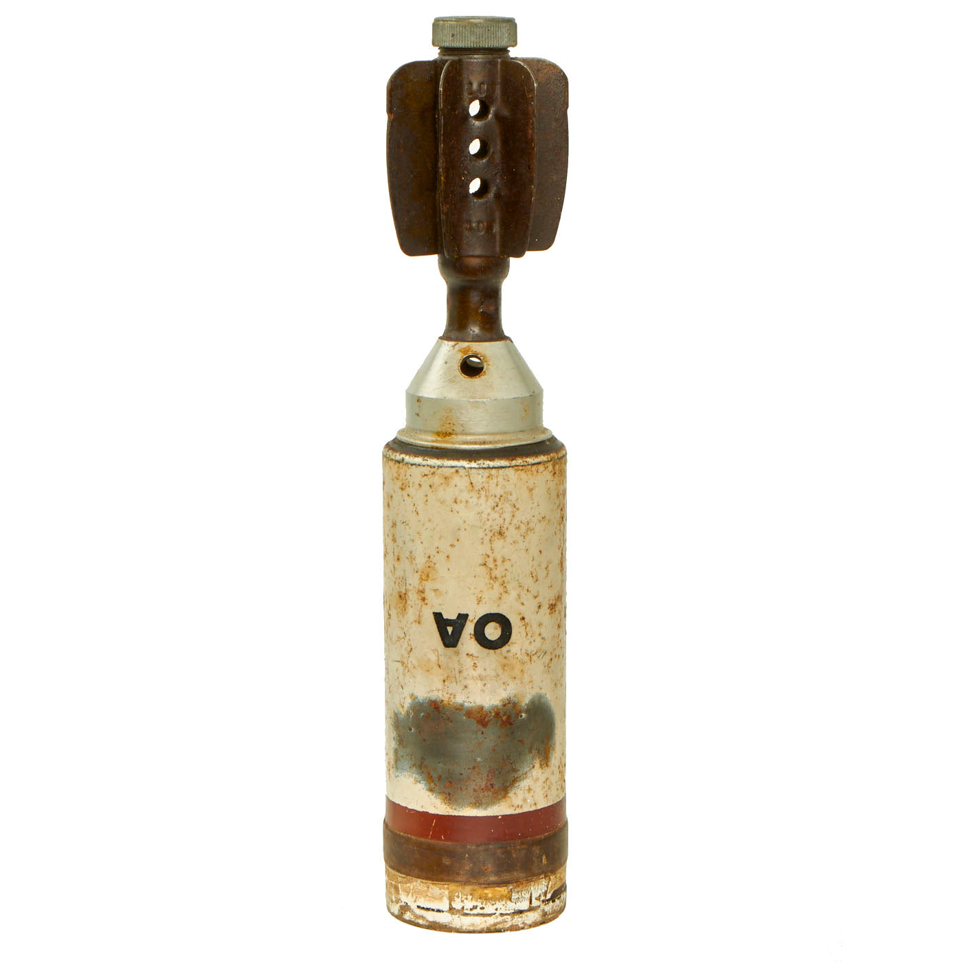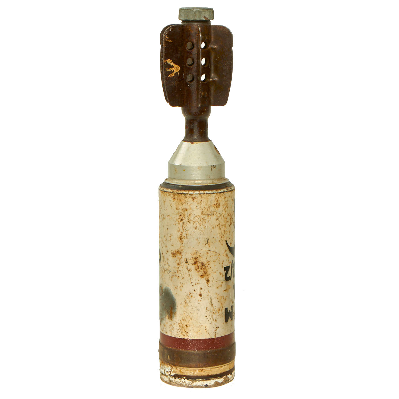 Original Item: Only One Available. Totally inert per guidelines provided by the Bureau of Alcohol Tobacco and Firearms, this is a very nice 1966 dated example of an illumination round for the British Ordnance SBML Two-Inch Mortar. The propellant and explosive charge have been removed and the fuse deactivated, making this totally inert, and unable to be converted into an explosive device.