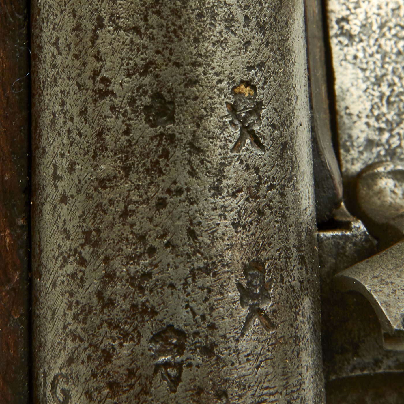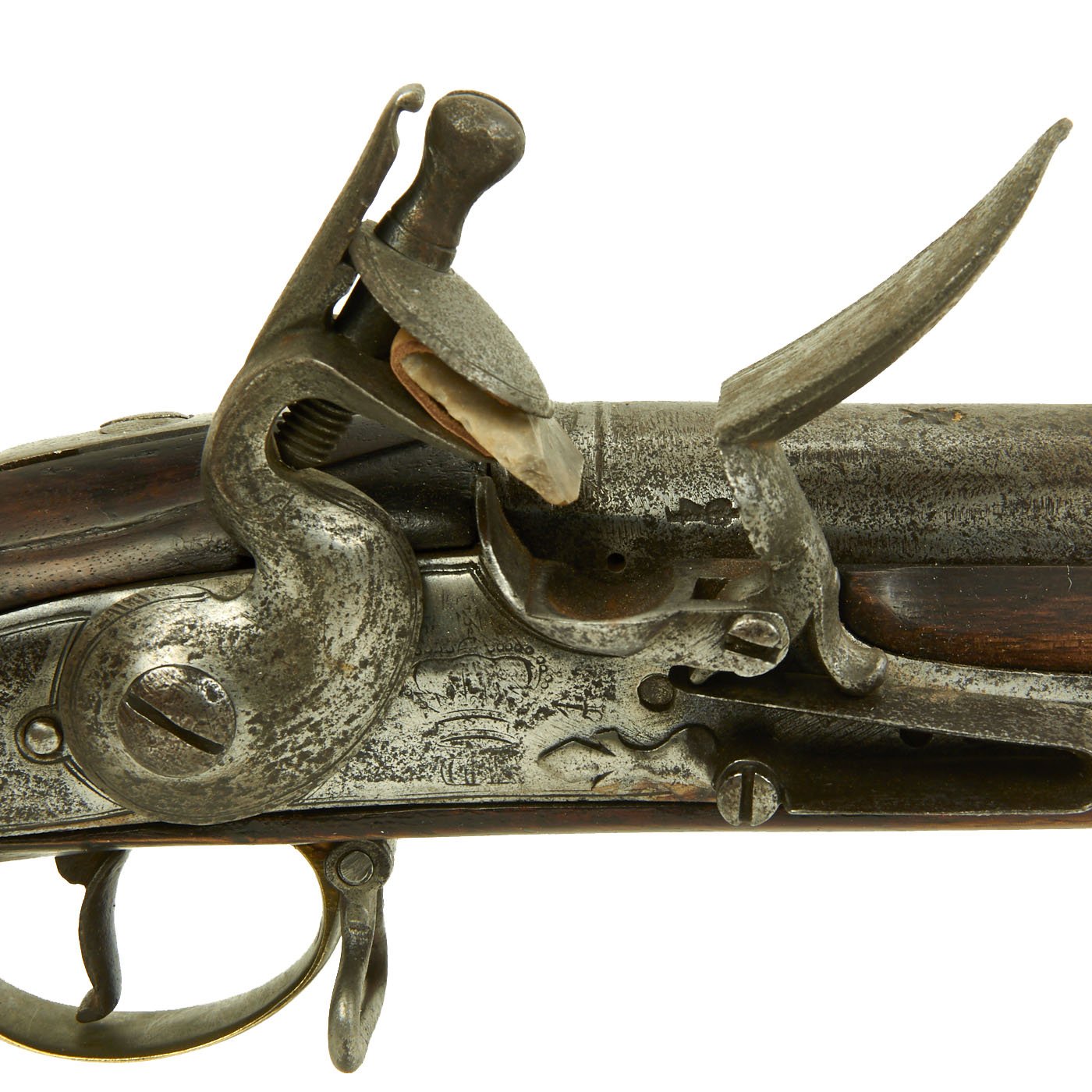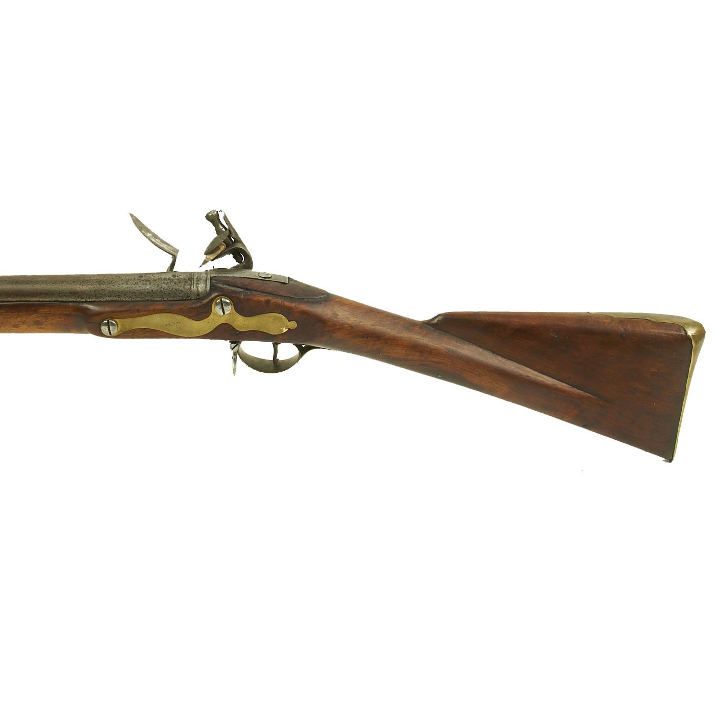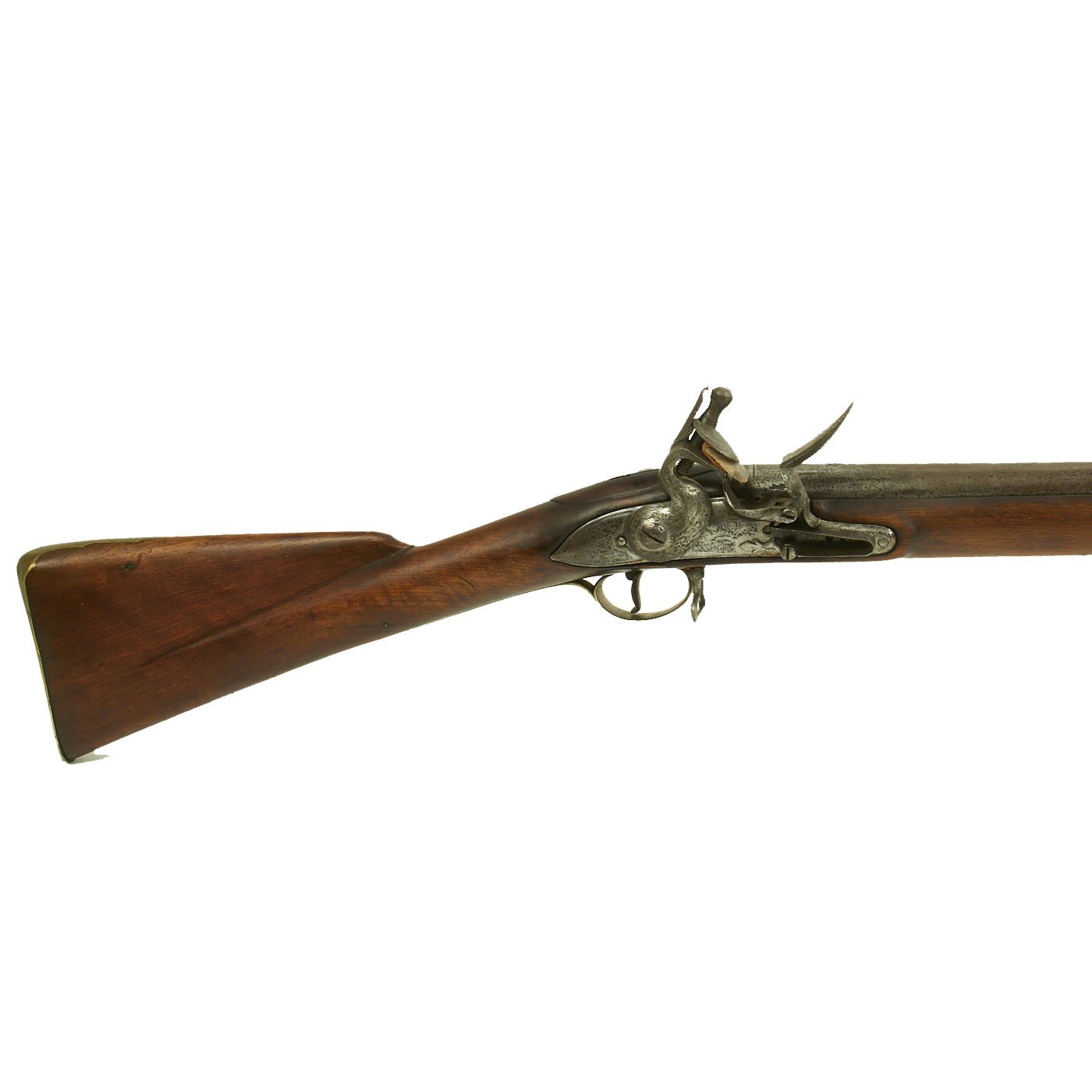 Scarcer than a 42" barrel Brown Bess Musket this is rare and seldom ever encountered. As time passed the Pattern varied to eliminate the escutcheon, thumb plate, and other fittings which do NOT appear on our example. The Lock is an original P-1756 model, marked TOWER but without a date, indicating that the lock was made after 1764 when dates and lock maker's names were obsoleted. It also has the correct CROWN / GR proof, as well as the "Lock Viewer's" marking. The barrel is marked with Birmingham CROWN / "Crossed Scepters" proof marks, as well as the CROWN / V viewed mark. There is also an I G inspector's or maker mark, which we have seen on other muskets from this period.